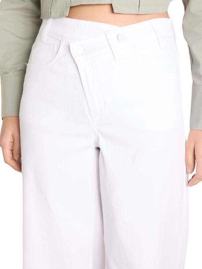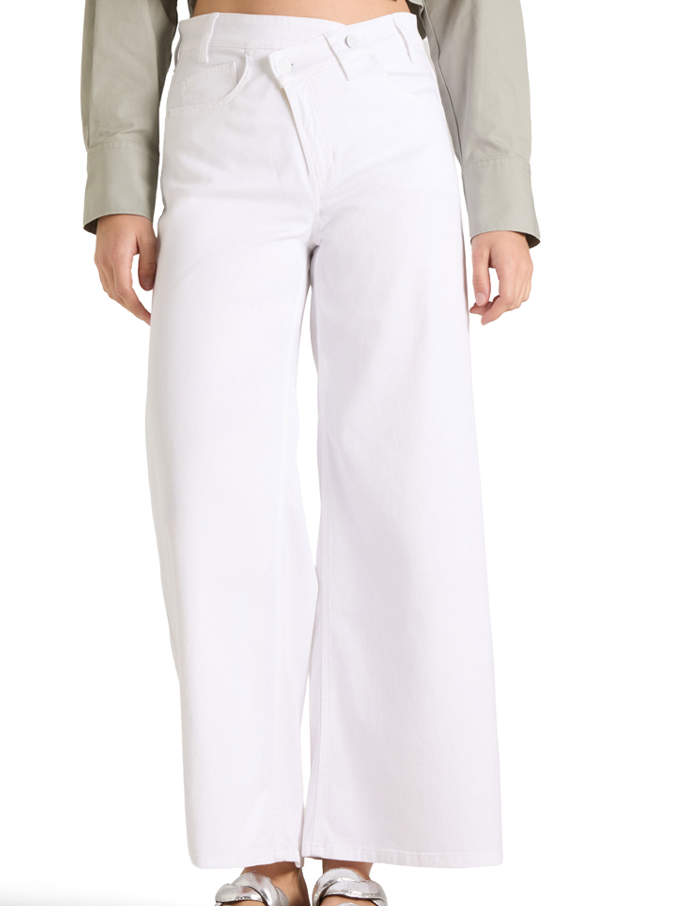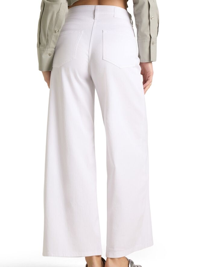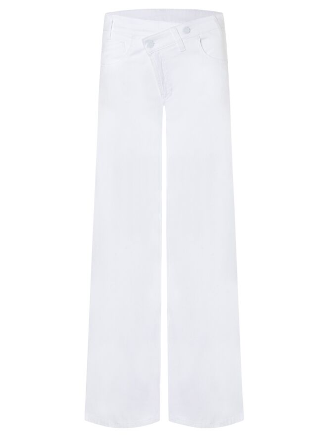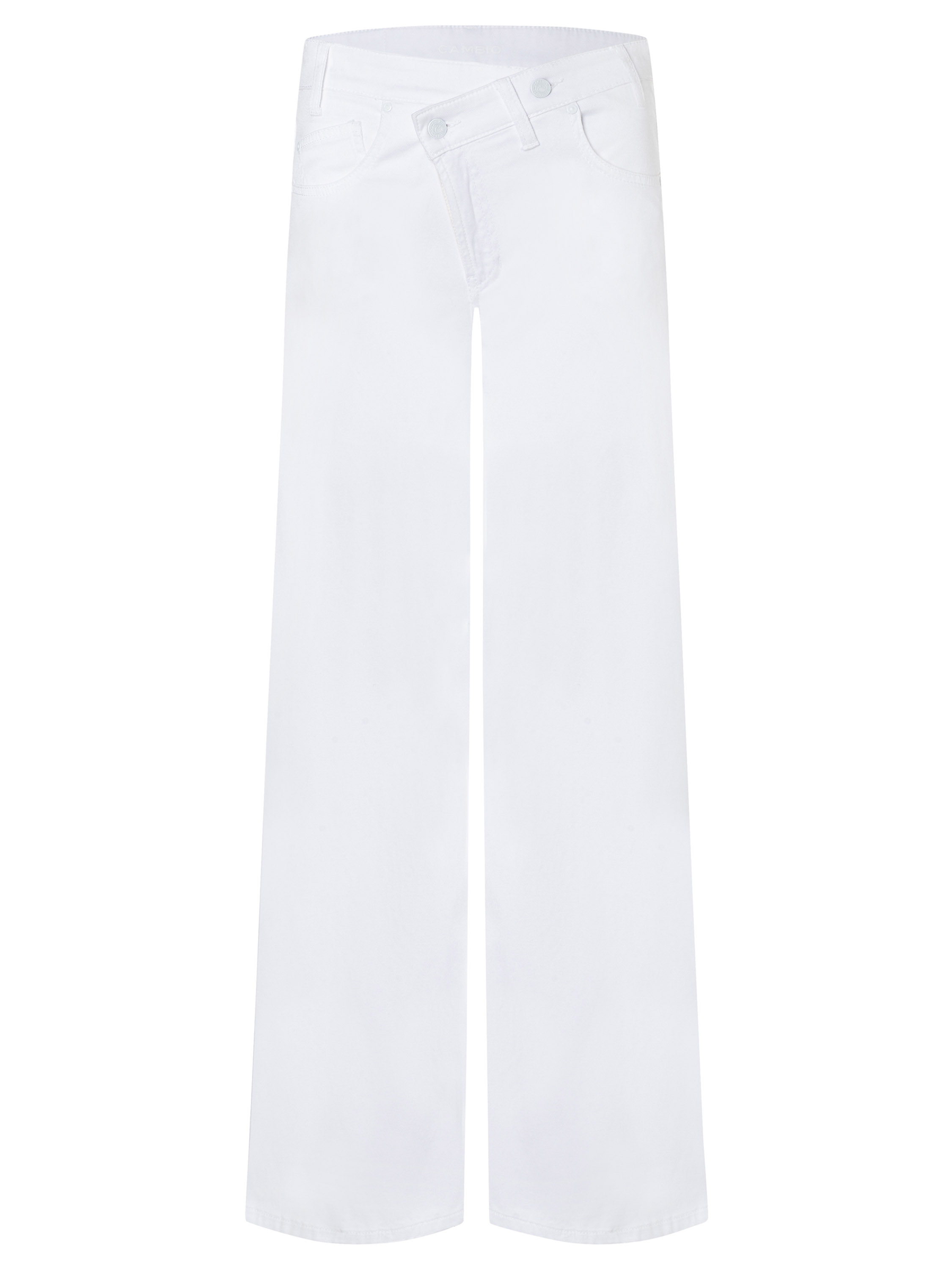 Eine Jeans von Cambio in Weiß. Das Modell ist im klassischen Five-Pocket-Stil gehalten und verfügt über einen asymmetrischen diagonalen Verschluss, der dem Design eine moderne Note verleiht. Die Beine sind gerade geschnitten. Diese Jeans kann bei 30 Grad gewaschen werden.