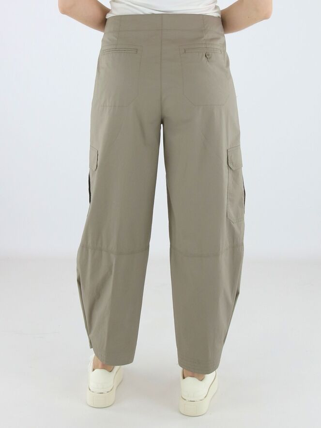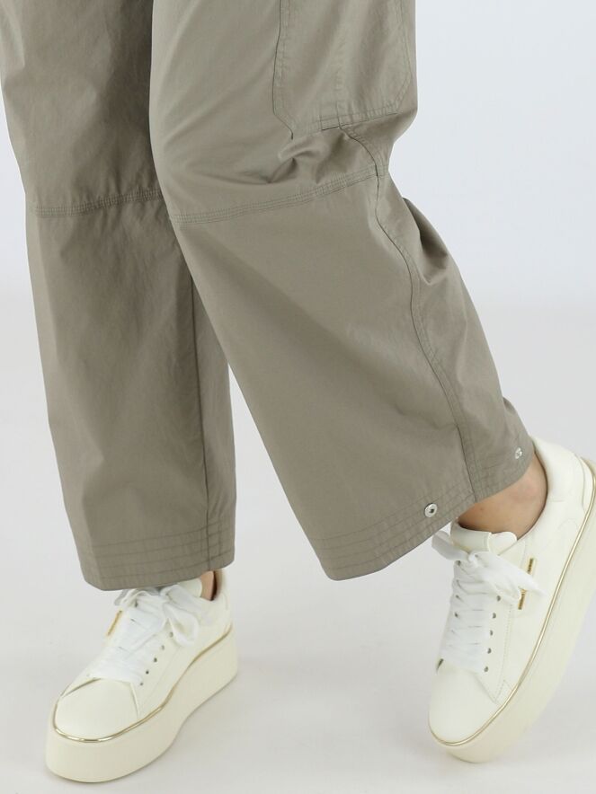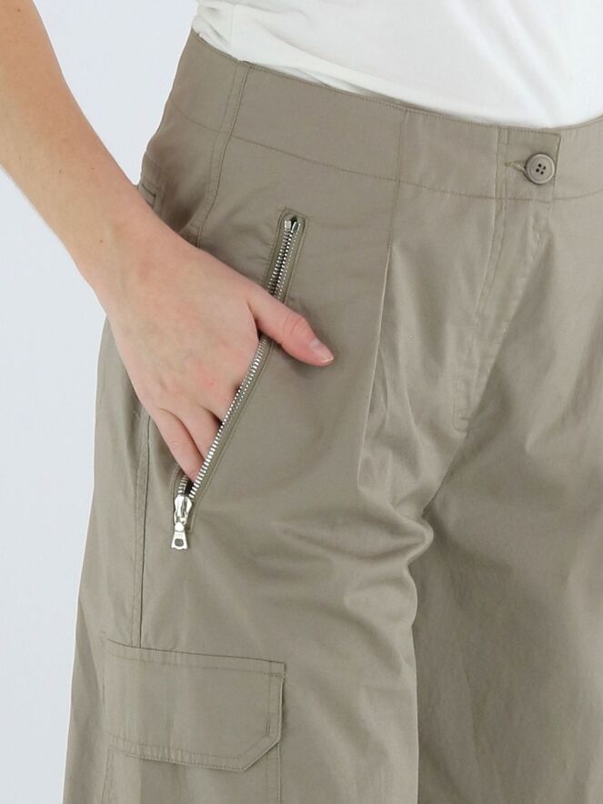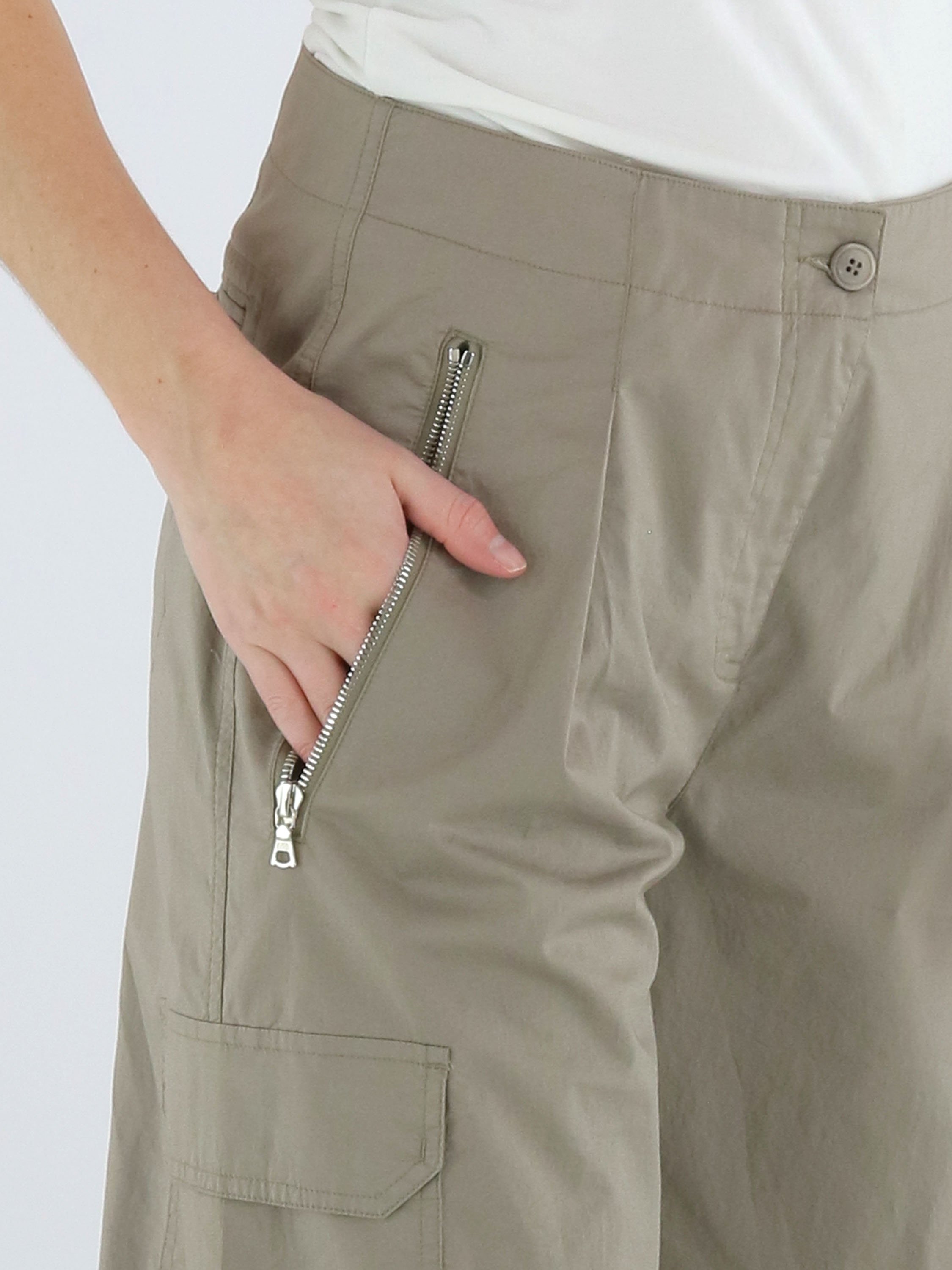 Cargo-Hose von Cambio in der Farbe Taupe. Die Hose ist im Five-Pocket-Design mit einer eingepressten Bügelfalte in der Mitte der Hosenbeine gefertigt. Am unteren Beinabschluss befindet sich ein Druckknopf, mit dem die Hosenbeine leicht enger gestellt werden können. Die Hose verfügt über Seitentaschen und ist für Handwäsche geeignet.