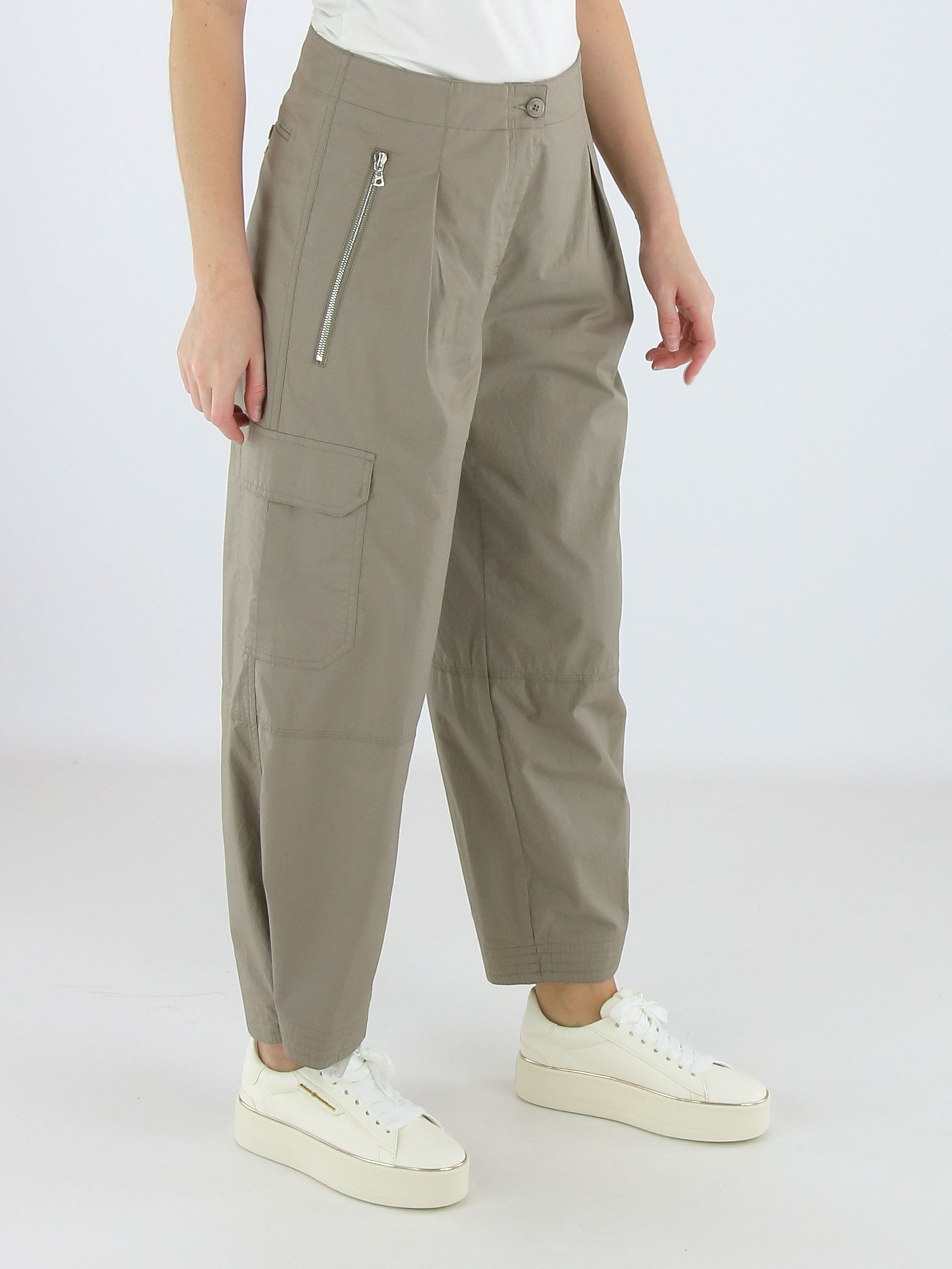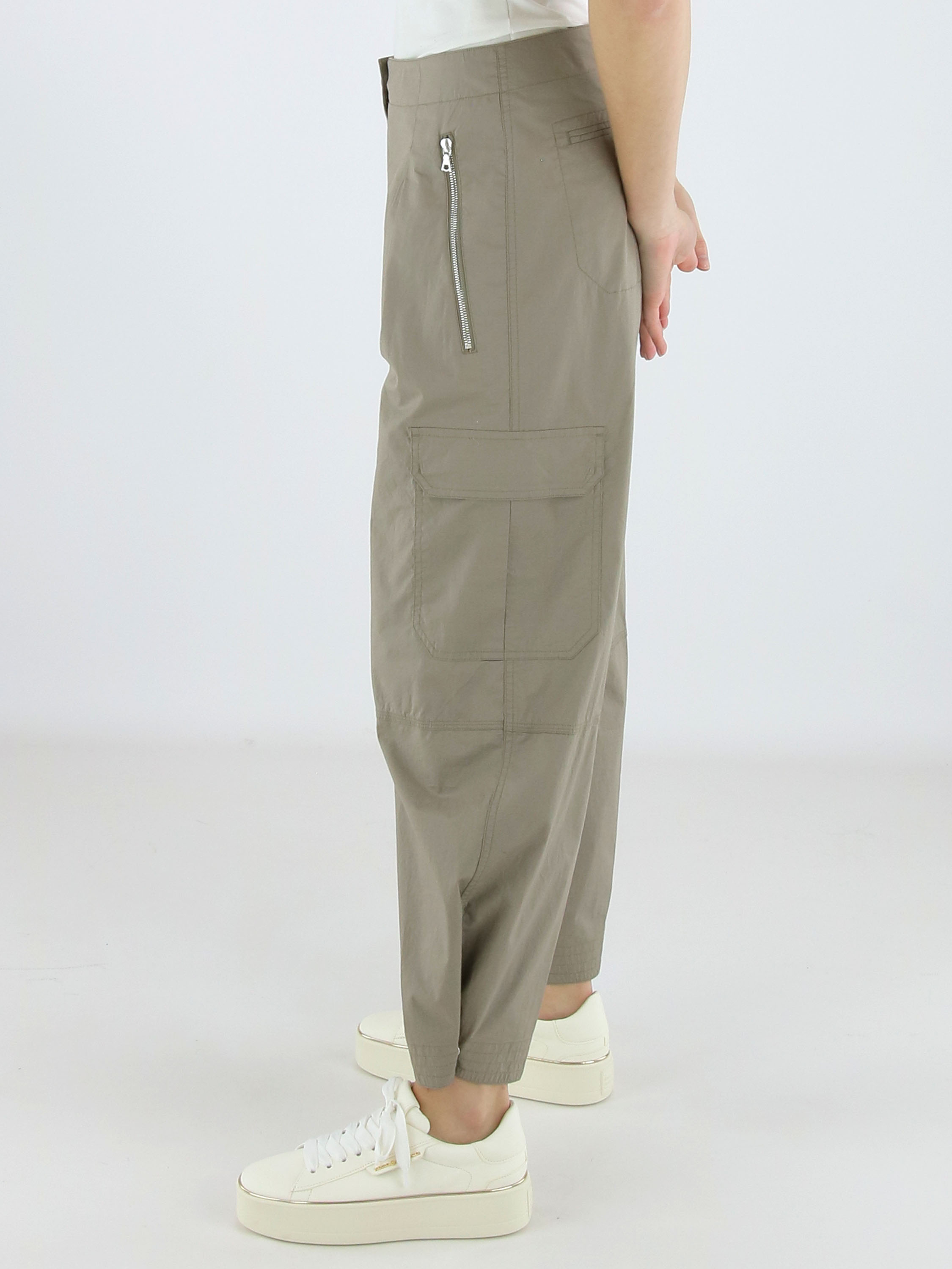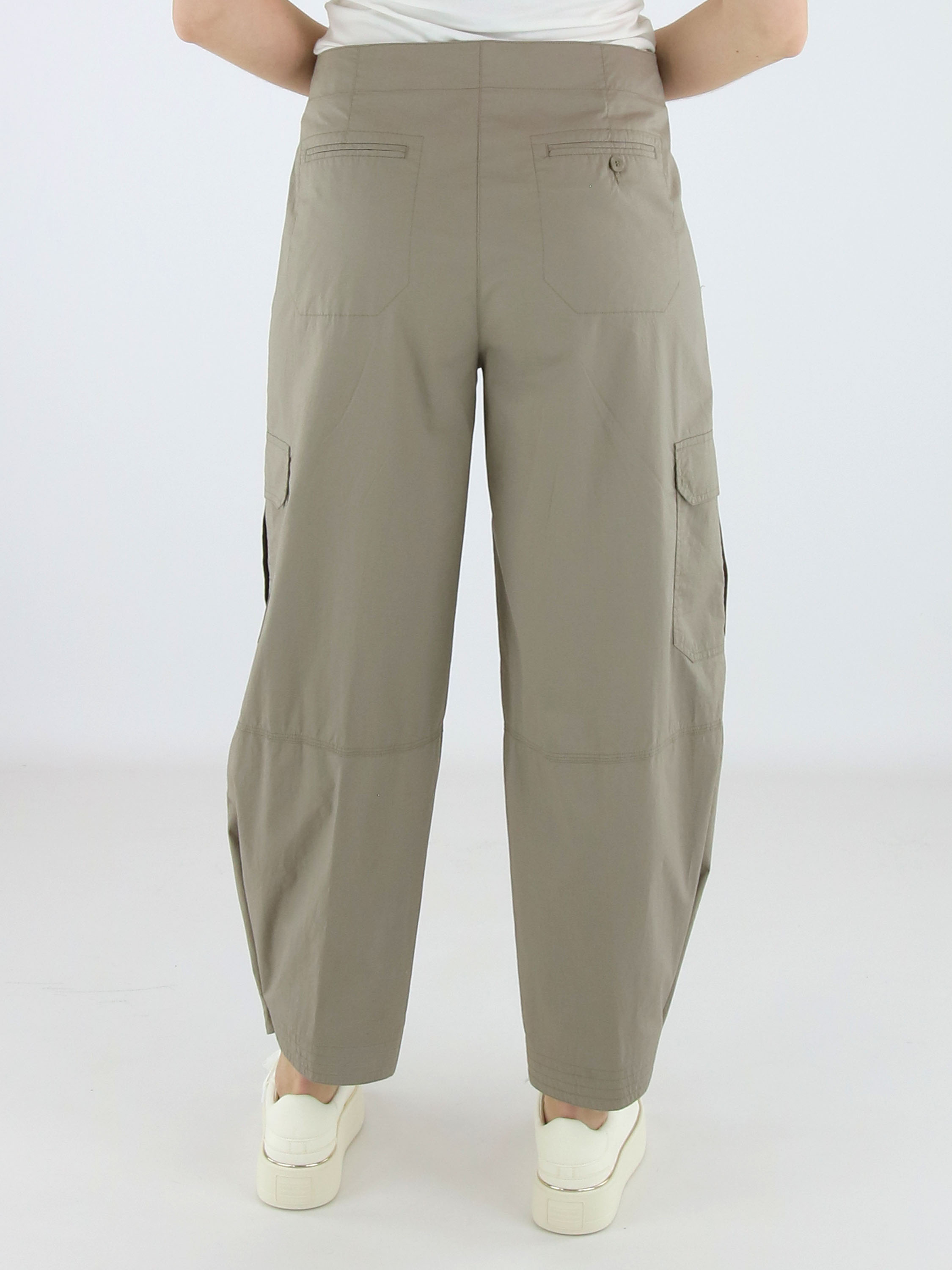 Cargo-Hose von Cambio in der Farbe Taupe. Die Hose ist im Five-Pocket-Design mit einer eingepressten Bügelfalte in der Mitte der Hosenbeine gefertigt. Am unteren Beinabschluss befindet sich ein Druckknopf, mit dem die Hosenbeine leicht enger gestellt werden können. Die Hose verfügt über Seitentaschen und ist für Handwäsche geeignet.