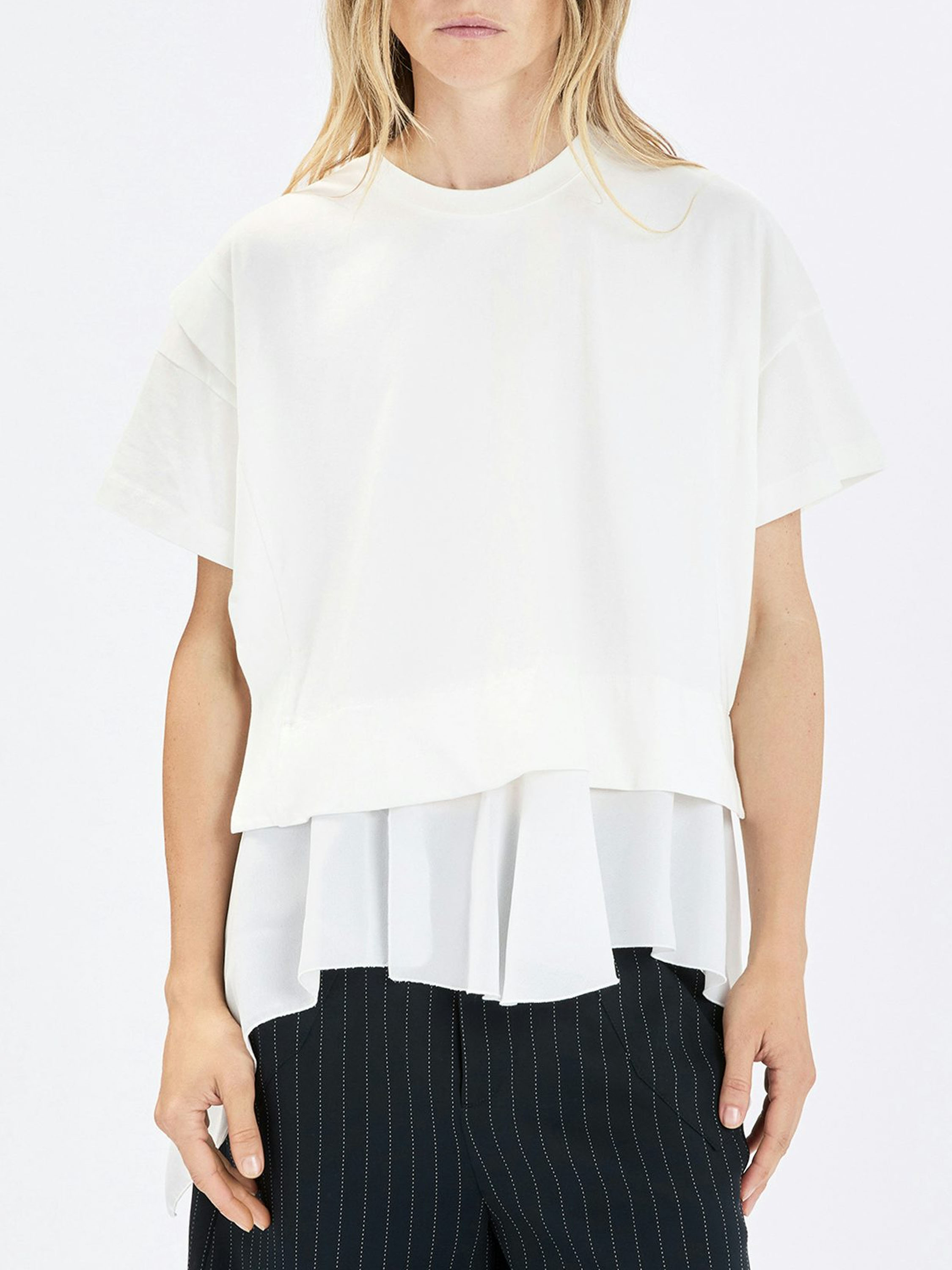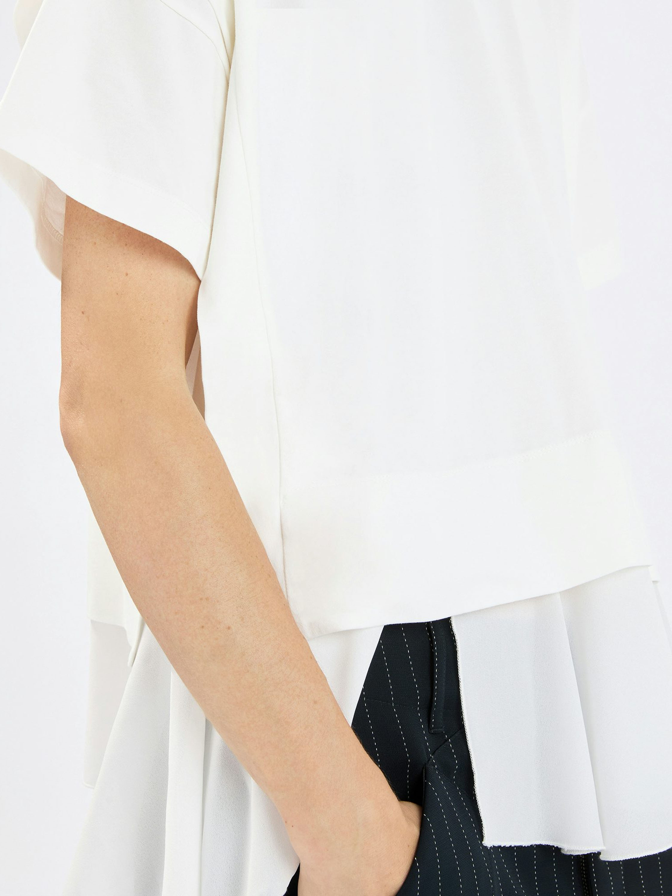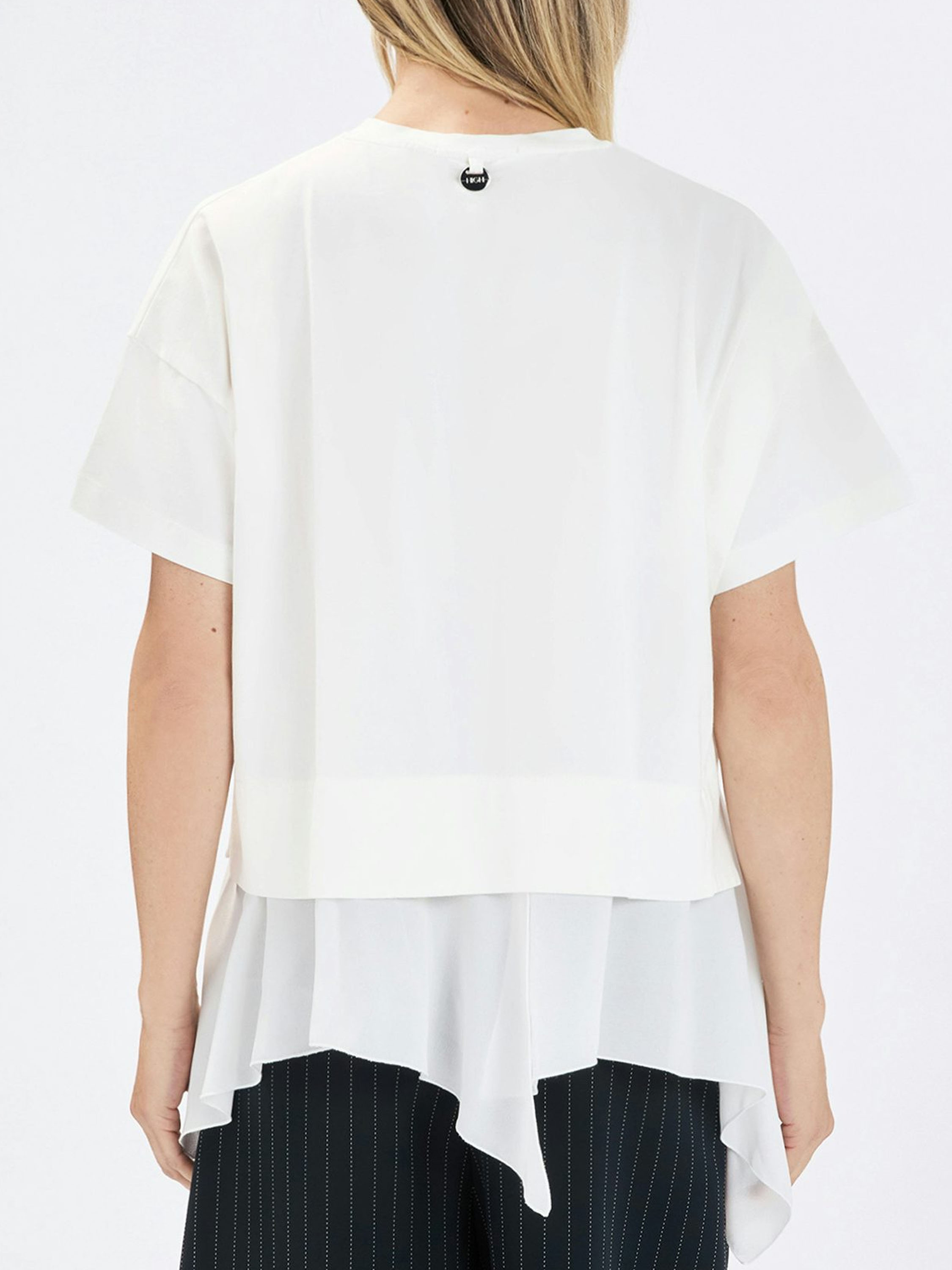 Shirt von High in Cremeweiß. Mit Rundhalsausschnitt und kurzen Ärmeln gearbeitet, verläuft an der rechten Seite eine Naht, nach der der Stoff dezent weiterfällt und so einen modernen, verspielten Effekt erzeugt. Am Saum tritt zusätzlich eine rund geschnittene, plissierte Voile-Schicht hervor und sorgt für eine raffinierte, mehrlagige Optik. Dieses exklusive Designershirt sollte per Hand gewaschen werden.