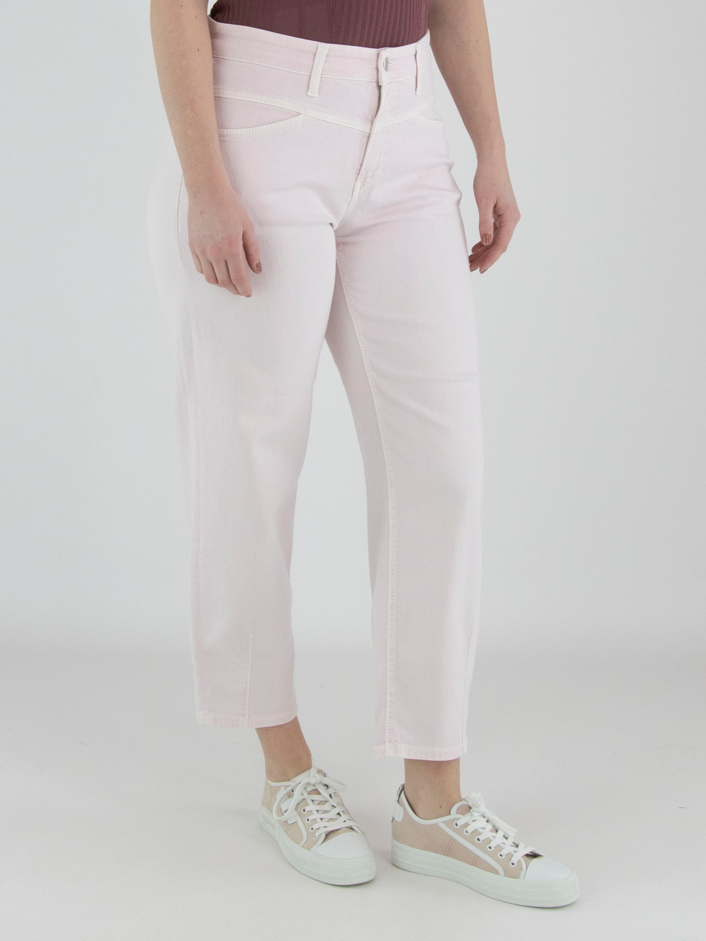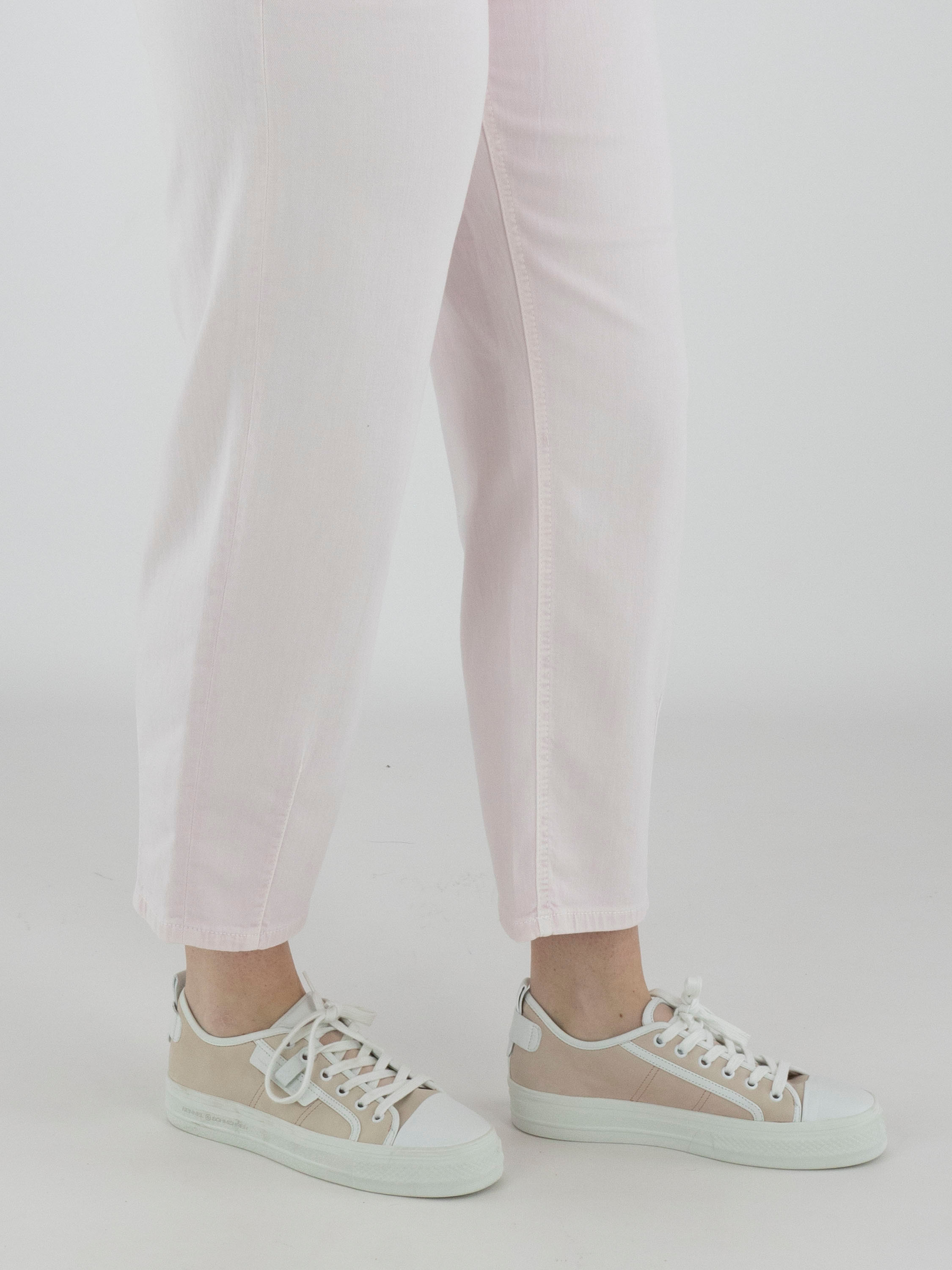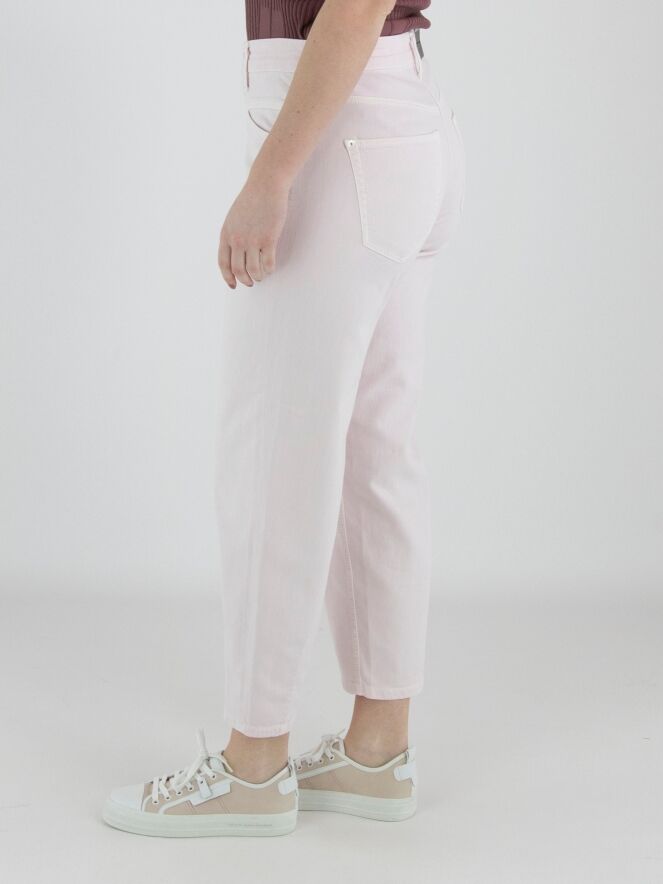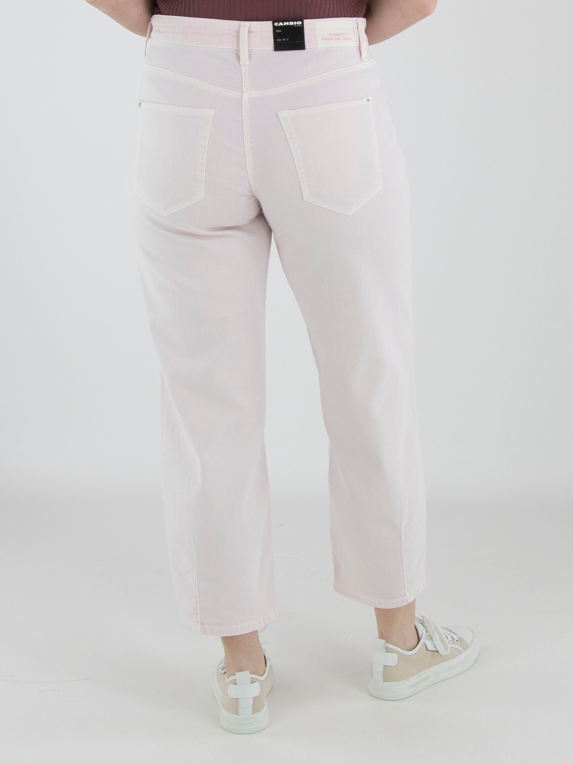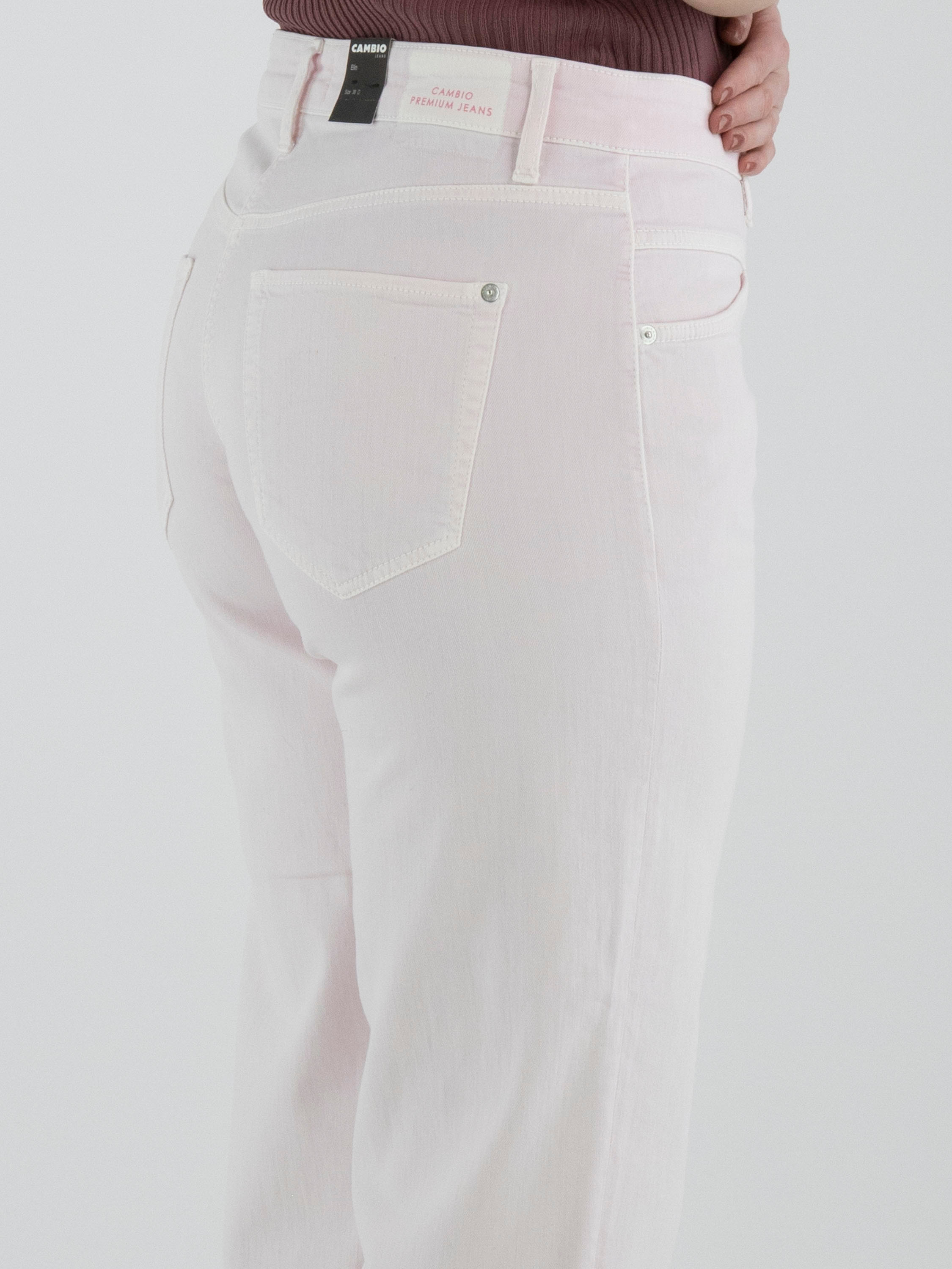 Eine Jeans von Cambio in Pastellrosa. Die Taschen an der Vorderseite sind leicht diagonal geschnitten. Diese Jeans kann bei 30 Grad gewaschen werden.