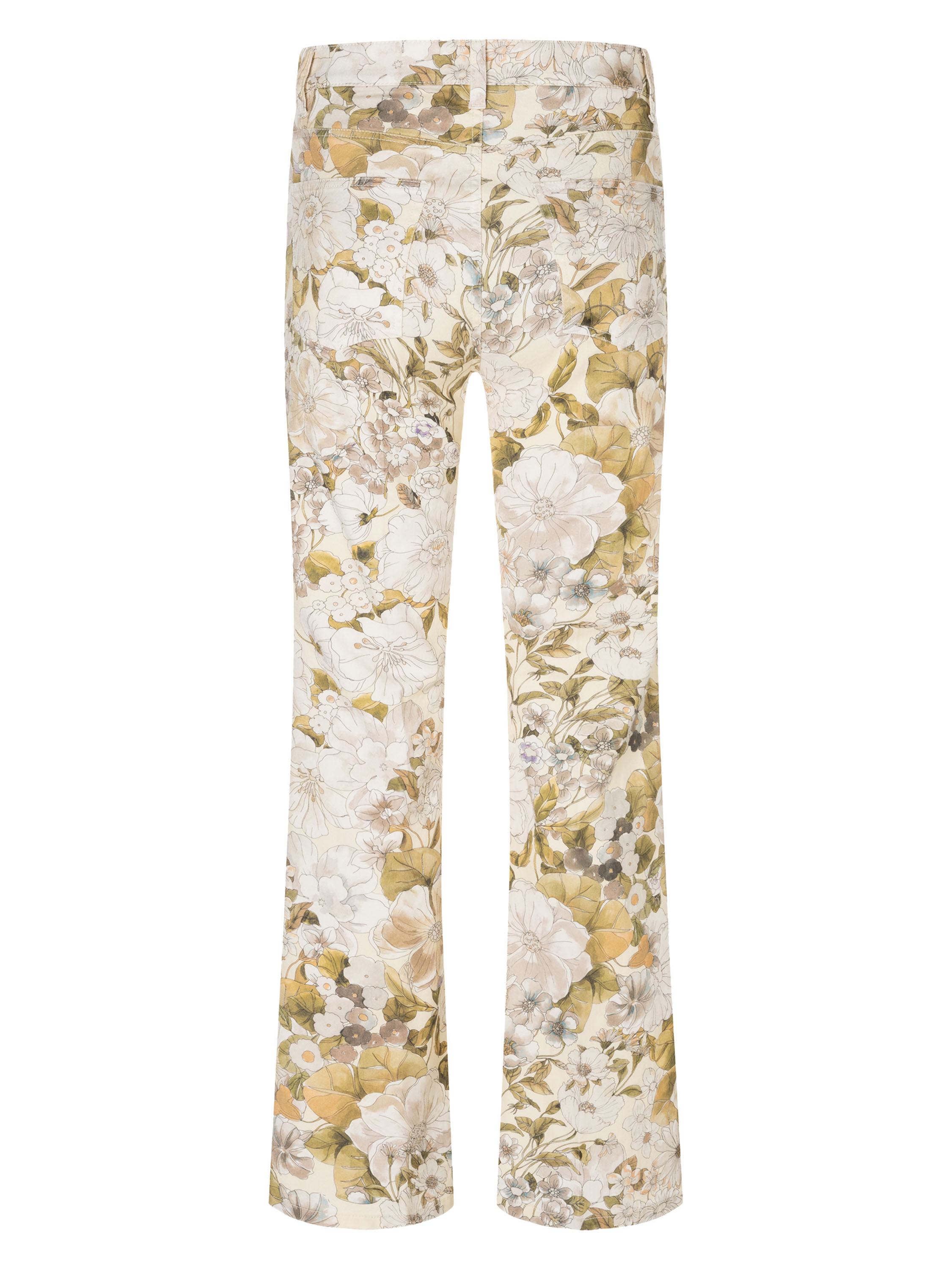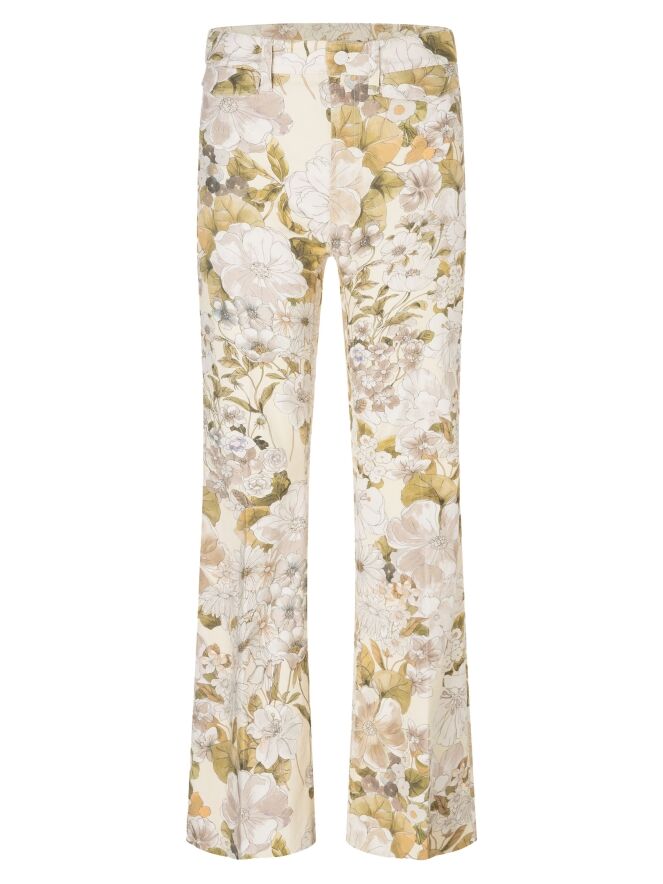 Jeans von Cambio mit einem edlen Blumenprint in sanften Olivgrün- und Taupetönen auf vanillefarbenem Grund. Direkt unter dem Bund sind zwei dekorative Pattentaschen eingearbeitet, die dem Design eine verspielte, feminine Note verleihen. Eine gebügelte Bügelfalte in der Mitte der Hosenbeine sorgt für eine elegante, schlanke Silhouette. Diese exklusive Designerjeans kann bei 30 Grad gewaschen werden.