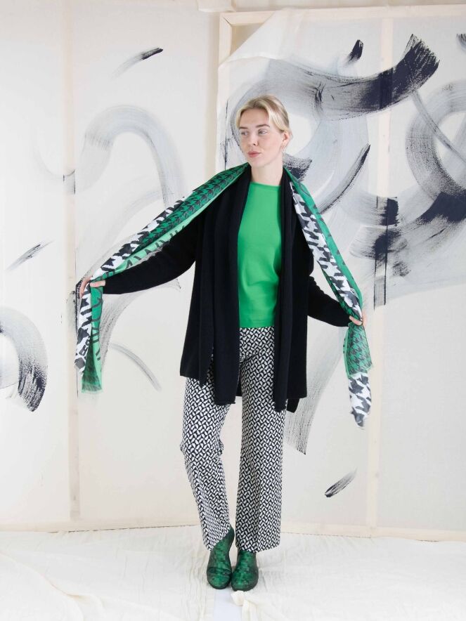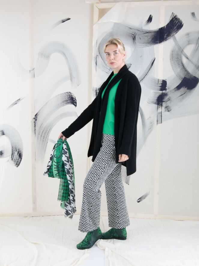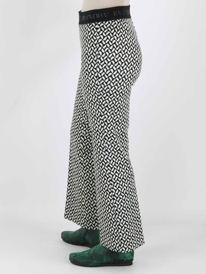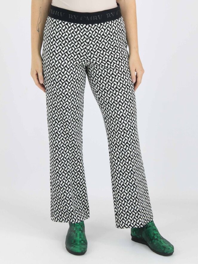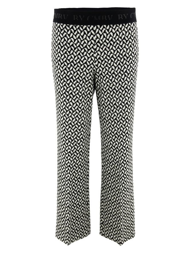 Eine Flared-Hose von Cambio mit einem grafischen Muster in Schwarz und Weiß. In der Taille befindet sich ein schwarzes Gummiband. Diese Hose kann von Hand gewaschen werden.