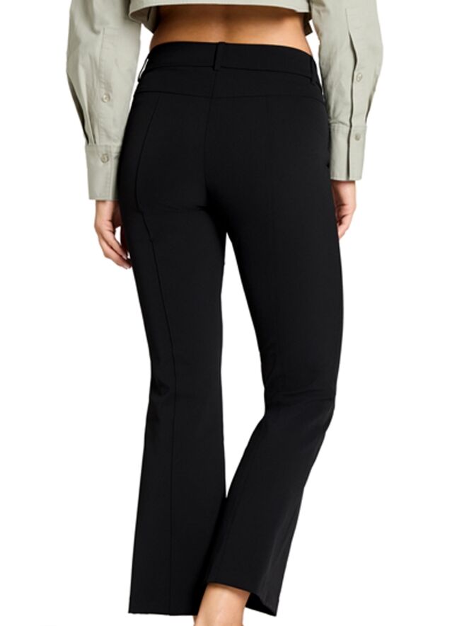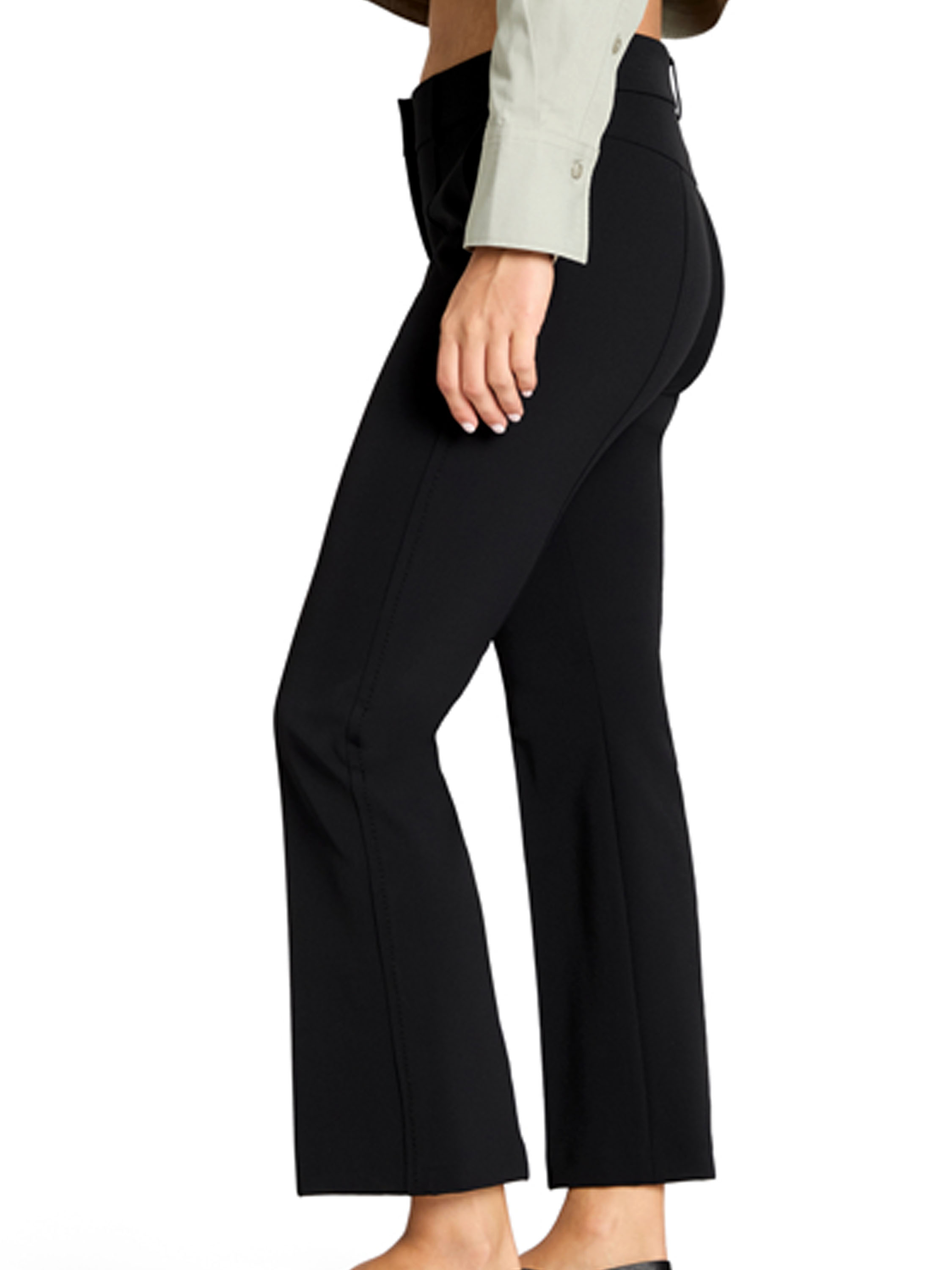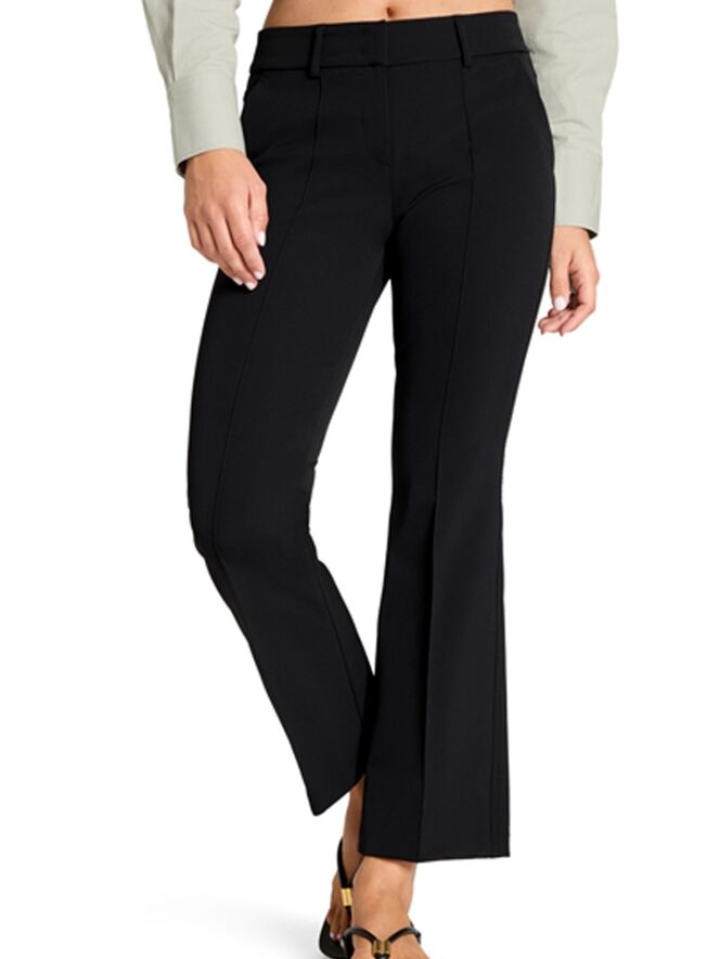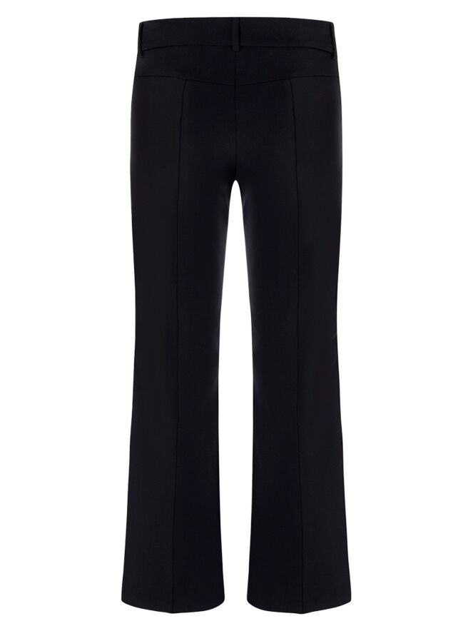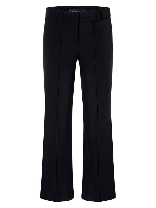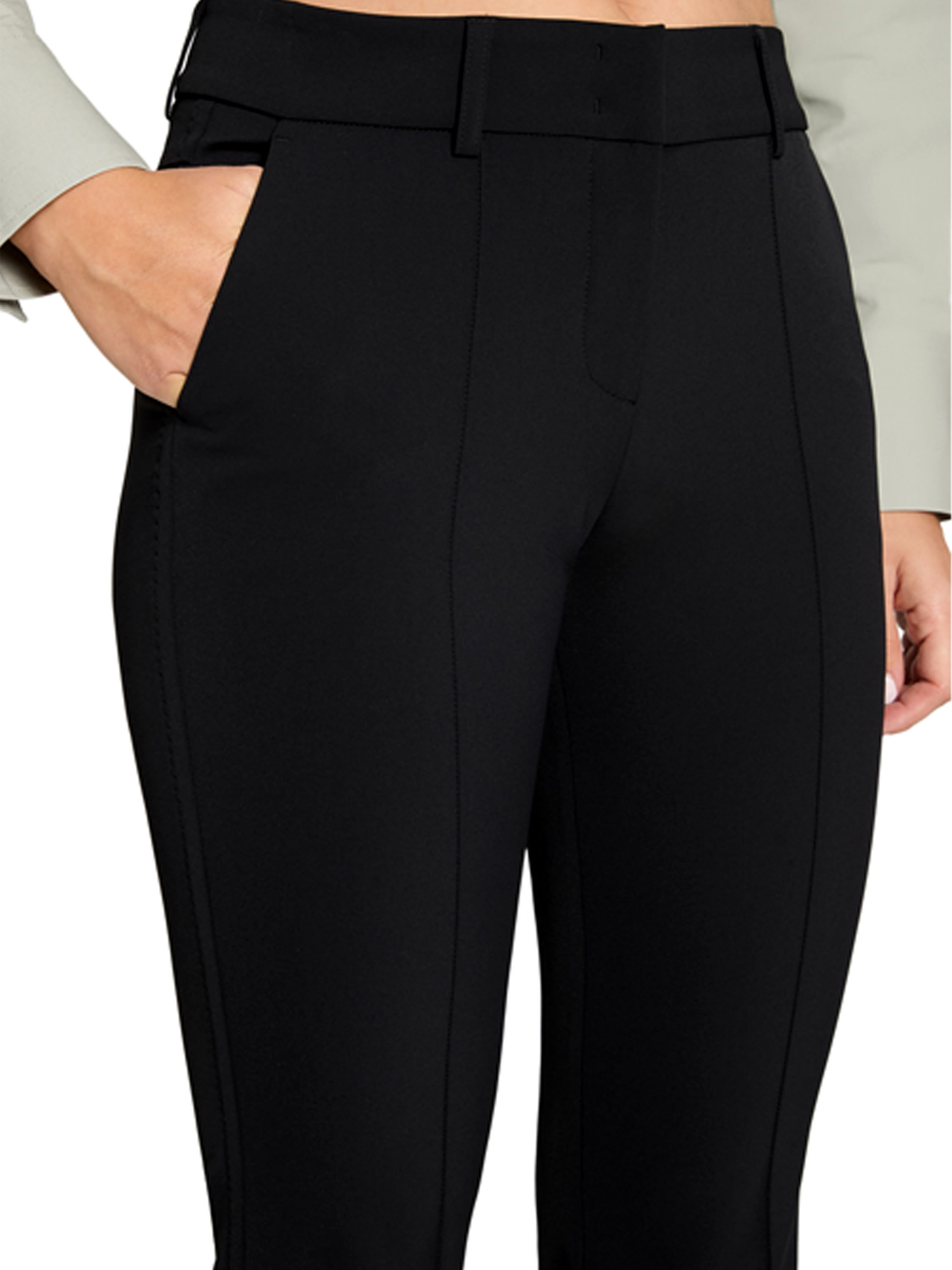Eine Hose von Cambio in Schwarz. In der Mitte der Hosenbeine verläuft eine umgekehrte Naht. Entlang der Seiten befindet sich eine dekorative schwarze Biese mit einer Ton-in-Ton-Naht. Die Hose hat Eingrifftaschen und kann per Hand gewaschen werden.