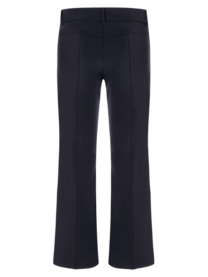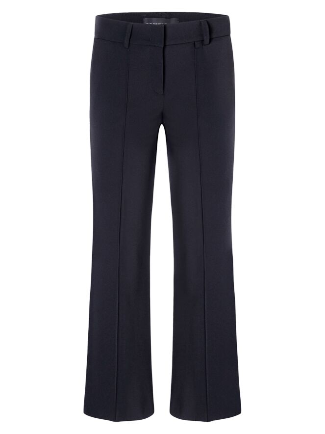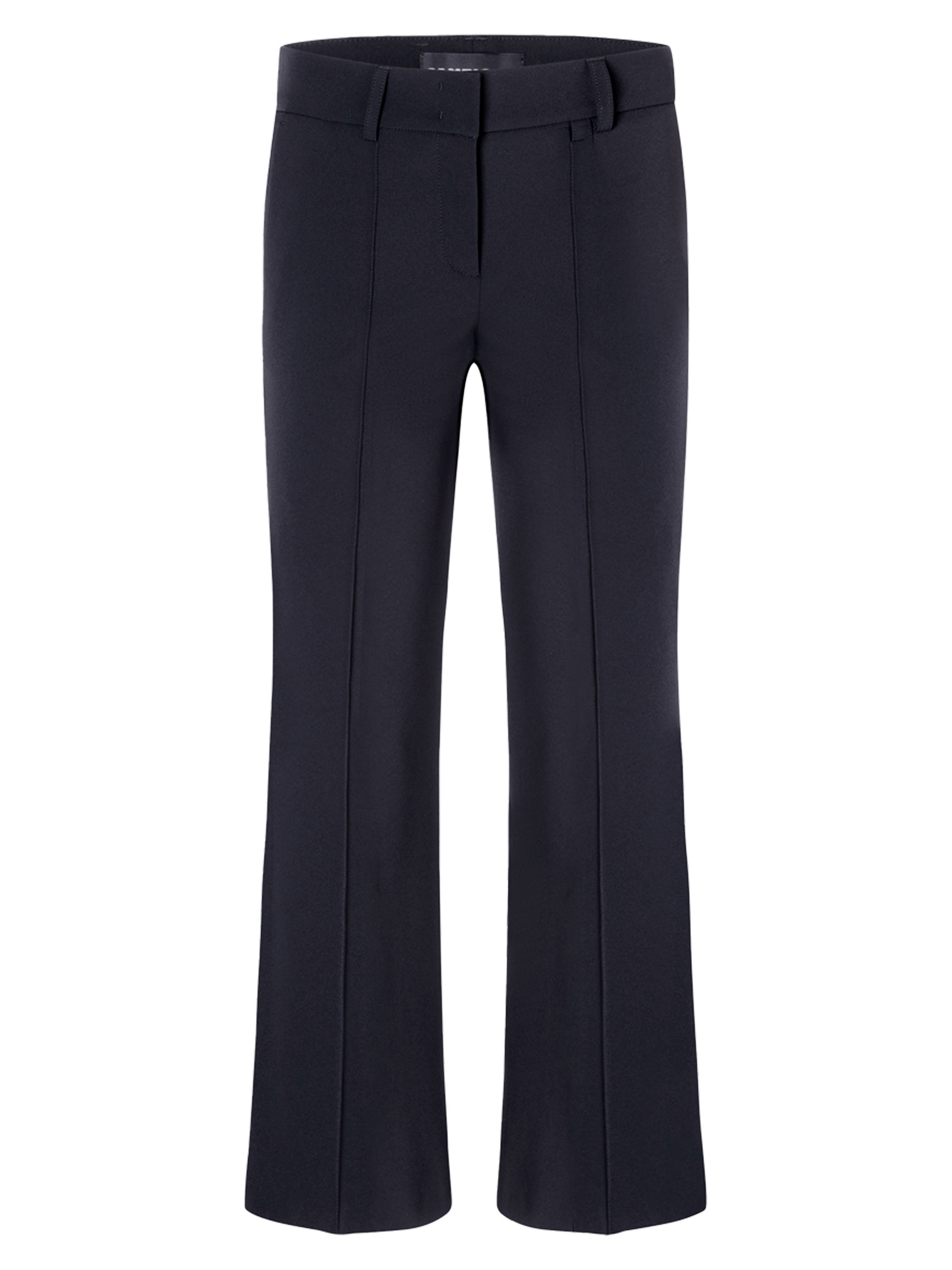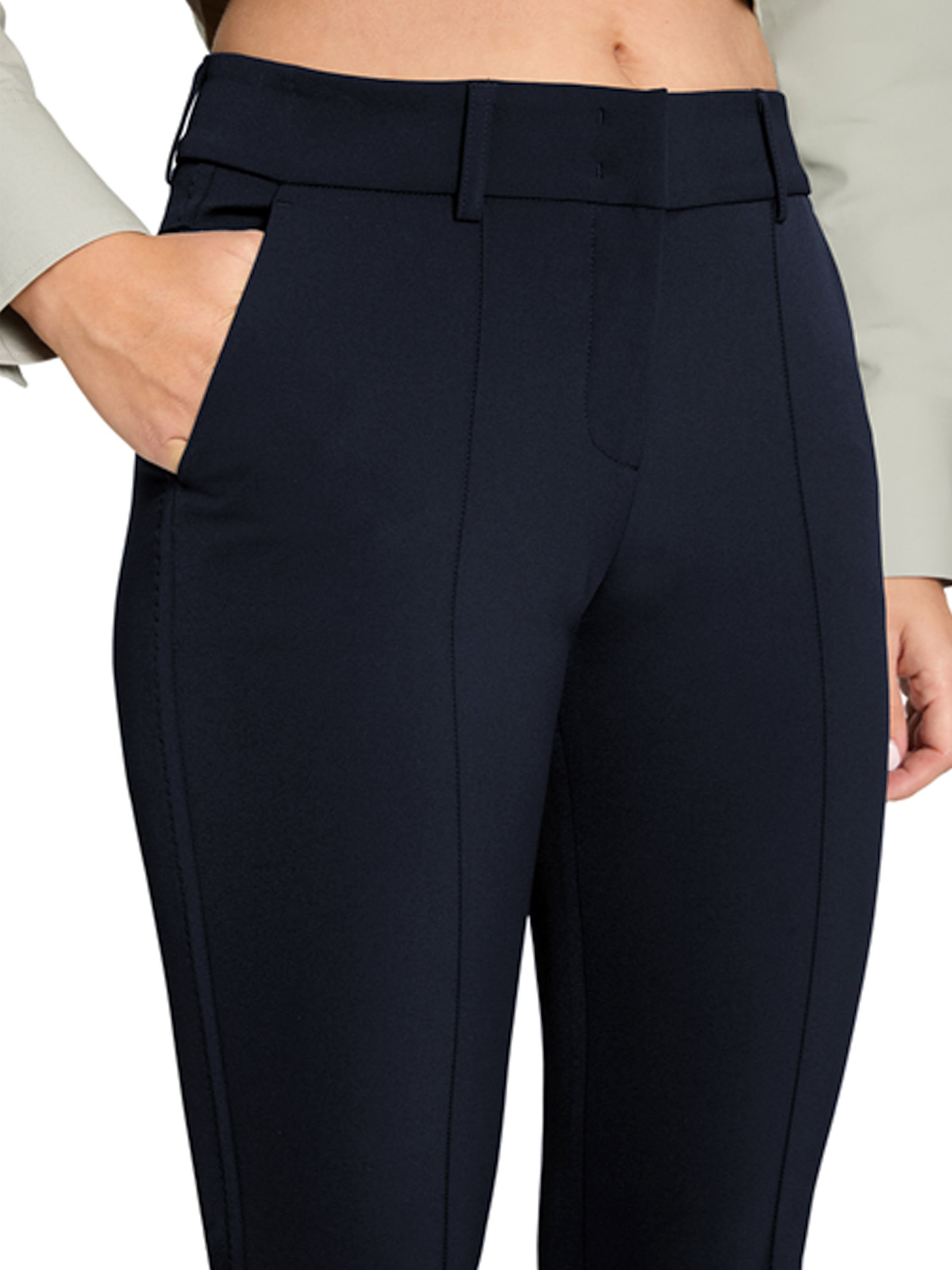 Eine Hose von Cambio in Marineblau. Mittig auf den Hosenbeinen verläuft eine umgekehrte Naht. Entlang der Seiten befindet sich eine dekorative schwarze Biese mit einer Ton-in-Ton-Naht. Die Hose hat Eingrifftaschen und kann per Hand gewaschen werden.