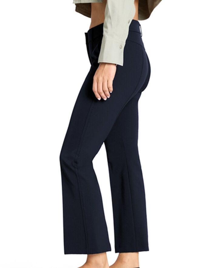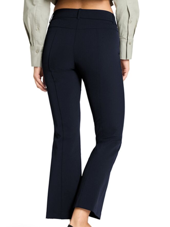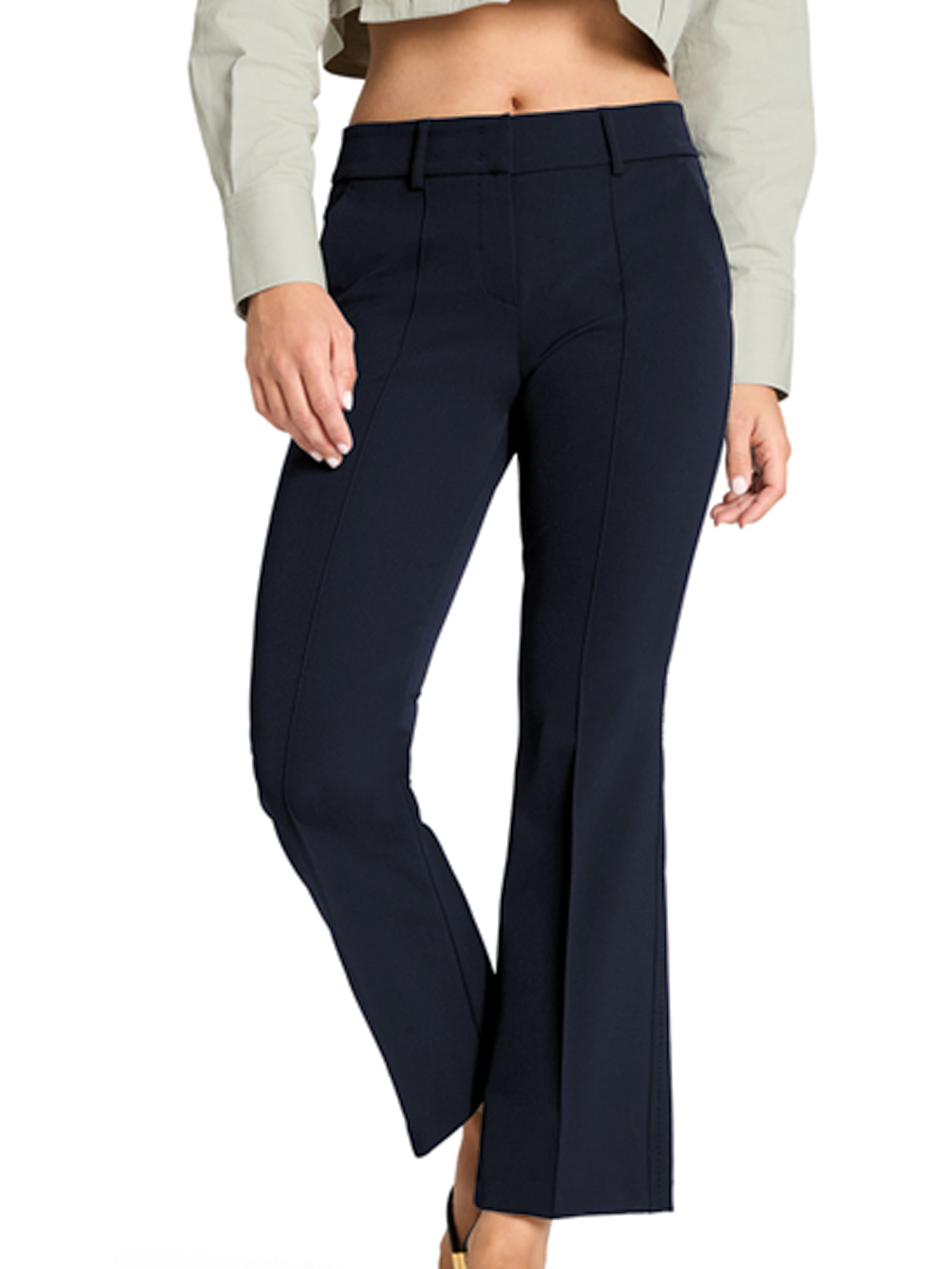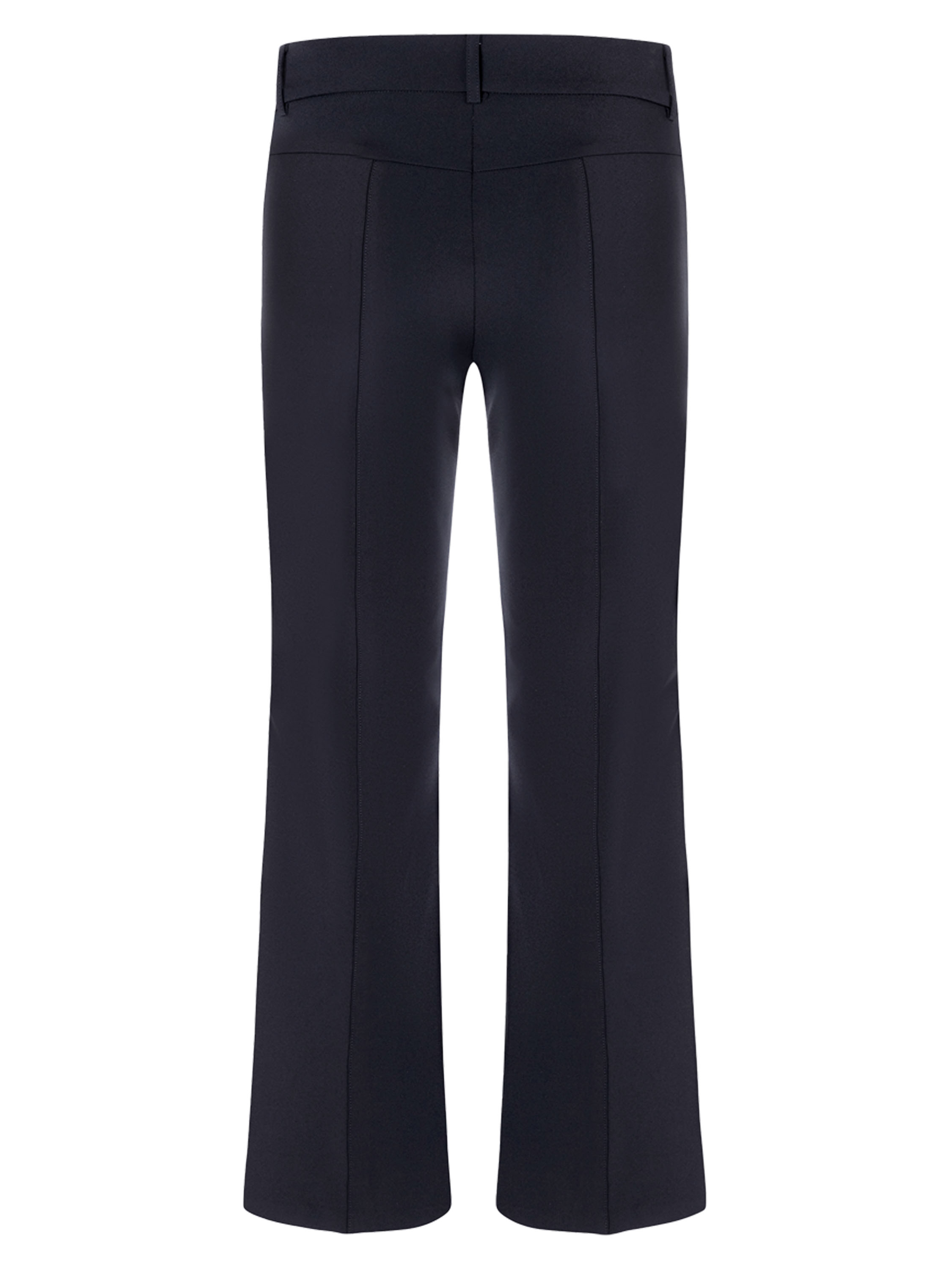 Eine Hose von Cambio in Marineblau. Mittig auf den Hosenbeinen verläuft eine umgekehrte Naht. Entlang der Seiten befindet sich eine dekorative schwarze Biese mit einer Ton-in-Ton-Naht. Die Hose hat Eingrifftaschen und kann per Hand gewaschen werden.