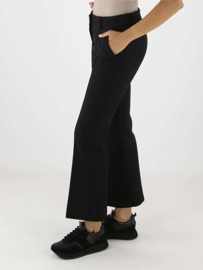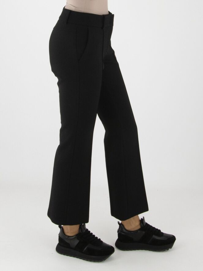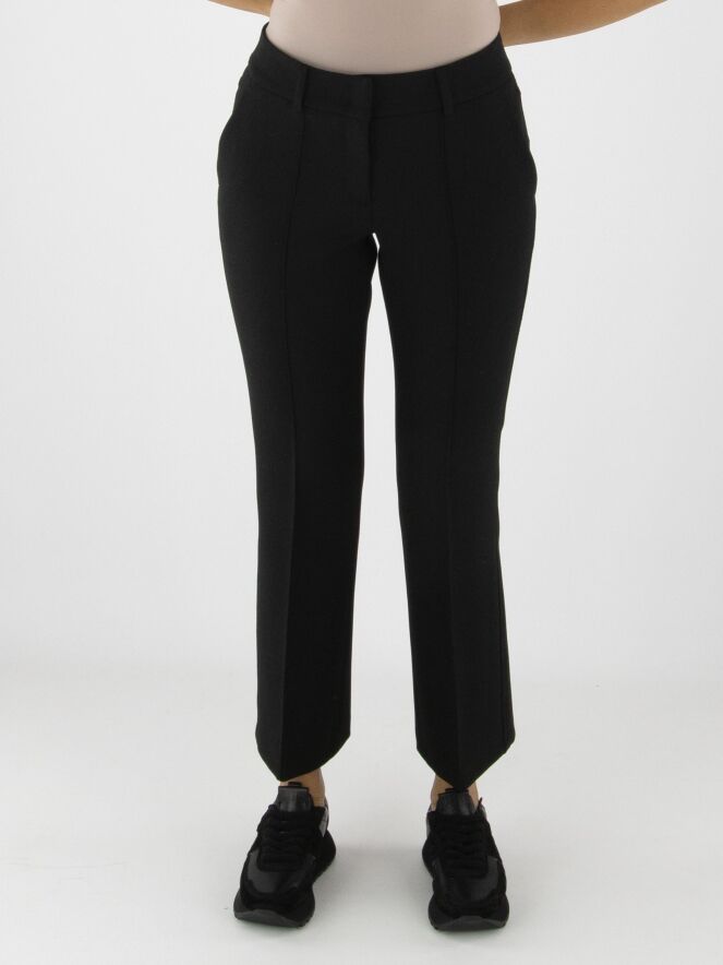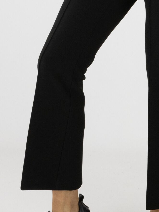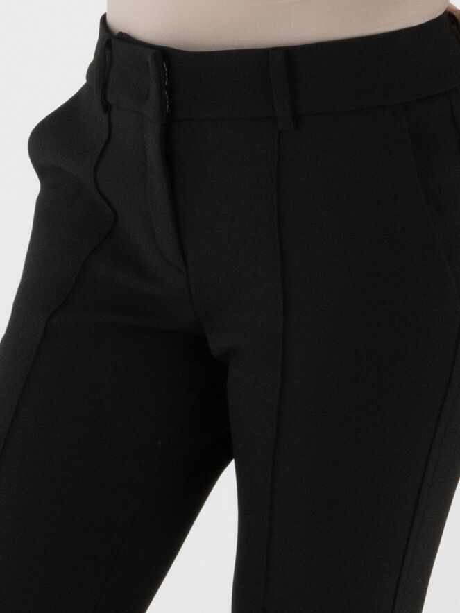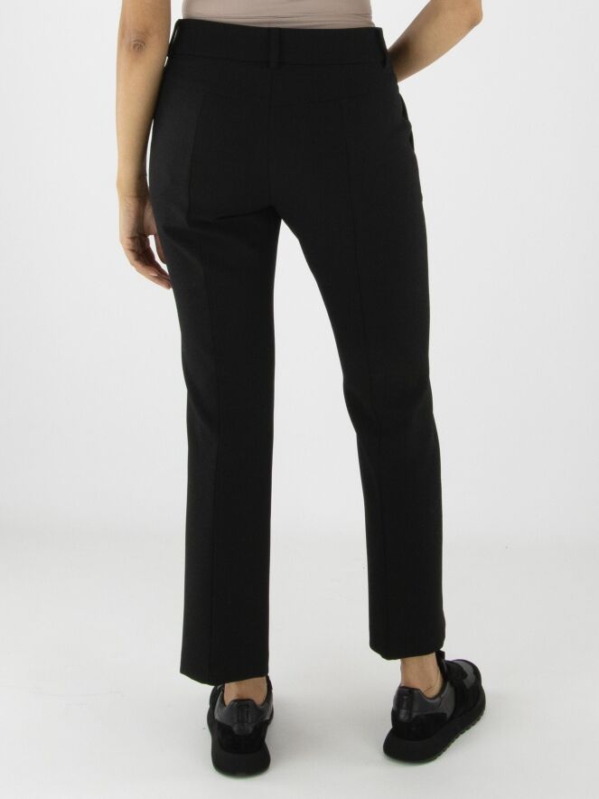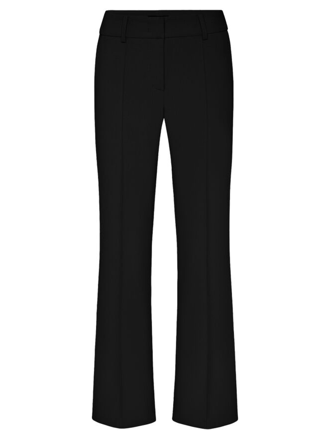 Schwarze Hose von Cambio. Eine umgekehrte Naht verläuft mittig entlang der Hosenbeine. An den Seiten ist eine dekorative Ziernaht als Biese eingearbeitet. Die Hose hat Eingrifftaschen und kann bei 30 Grad gewaschen werden.