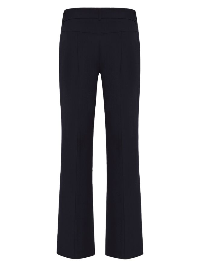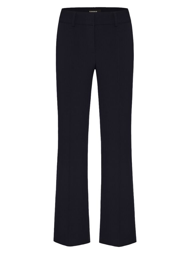 Eine Hose von Cambio in Marineblau. In der Mitte der Hosenbeine verläuft eine umgekehrte Naht. An den Seiten ist eine dekorative Ziernaht als Paspel eingearbeitet. Die Hose hat Seitentaschen und kann bei 30 Grad gewaschen werden.