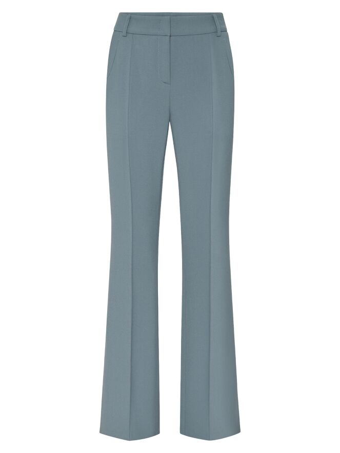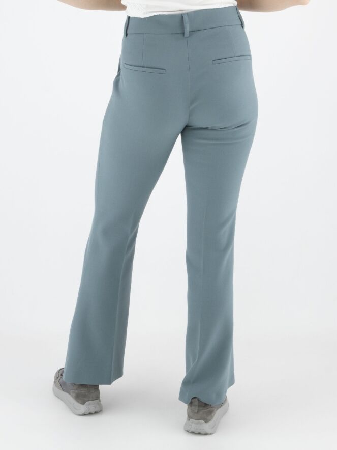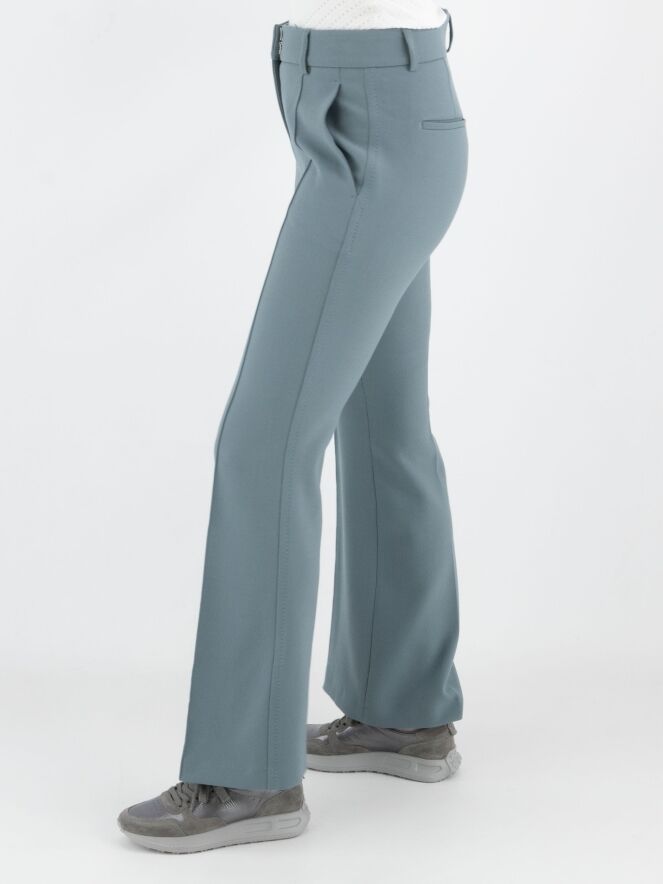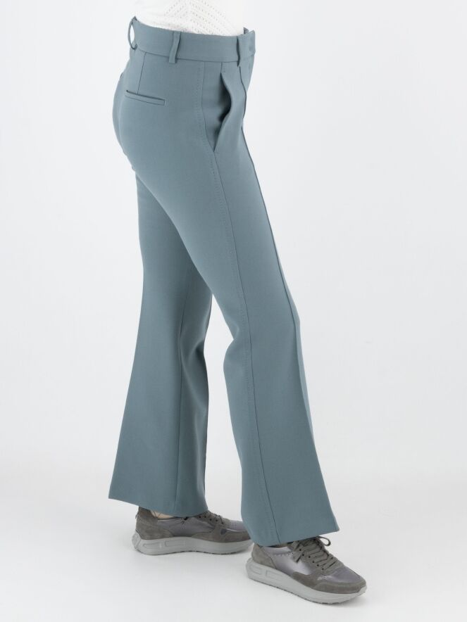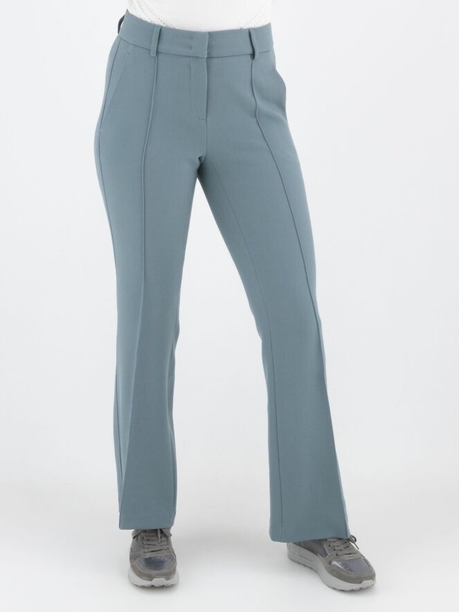 Eine ausgestellte Hose von Cambio in weichem Petrolblau. Die Hose hat Eingrifftaschen, und in der Mitte der Hosenbeine befindet sich eine Naht. An den Seiten verläuft eine dekorative tonale Naht. Diese Hose kann bei 30 Grad gewaschen werden.