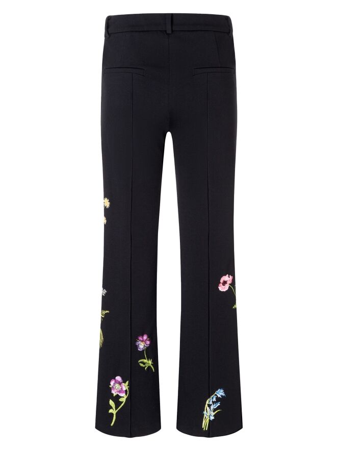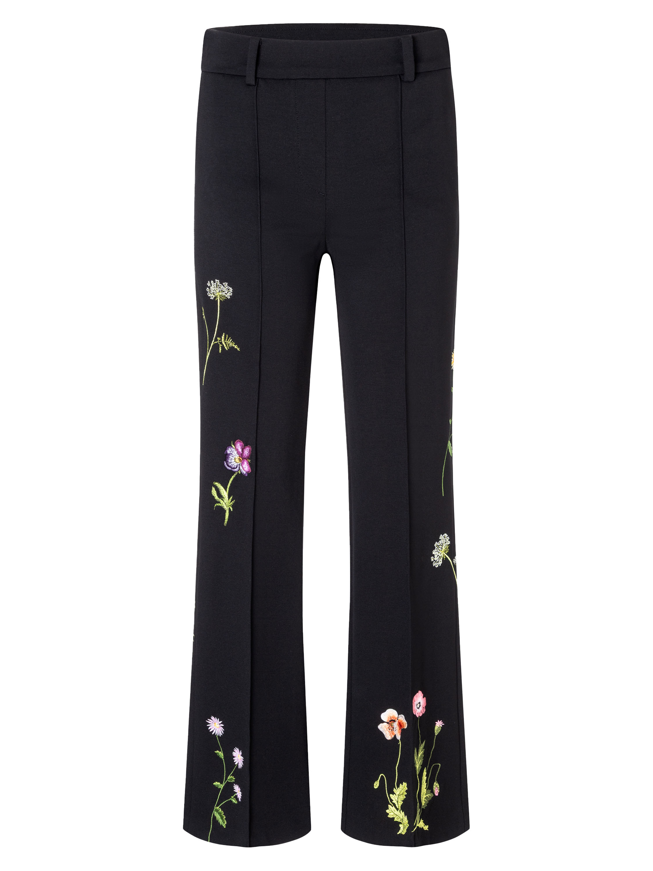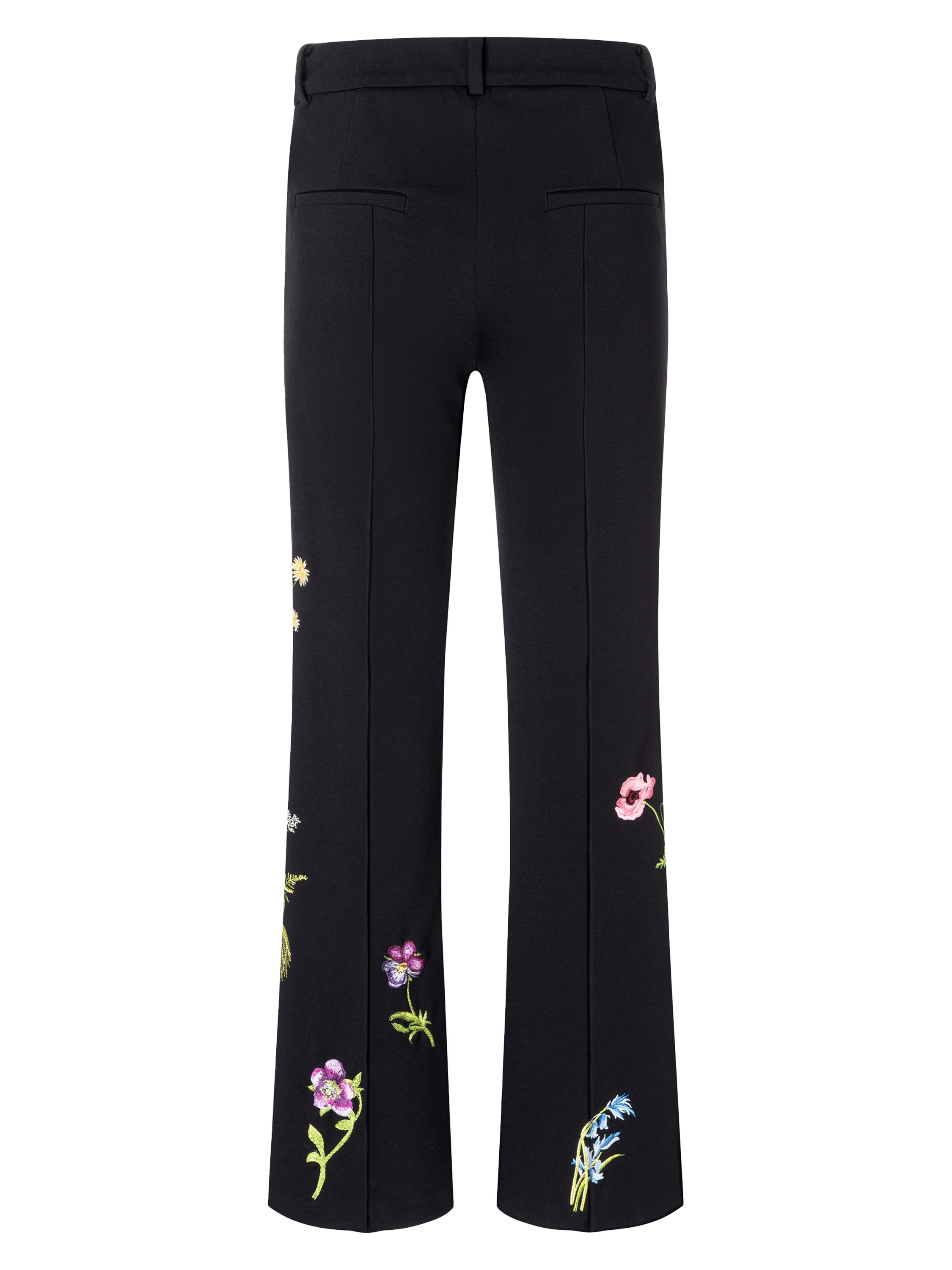 Eine Hose von Cambio in Schwarz mit mehreren frisch wirkenden Blumenstickereien auf den Hosenbeinen. In der Taille befindet sich ein elastischer Bund. In der Mitte der Hosenbeine verläuft eine umgekehrte Naht. Die Hose hat Eingrifftaschen und kann per Hand gewaschen werden.