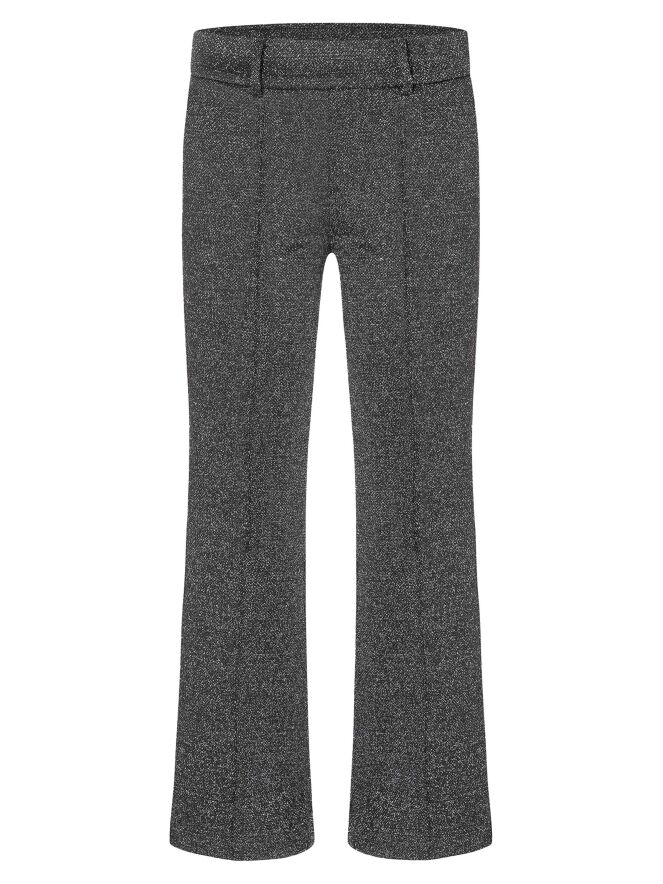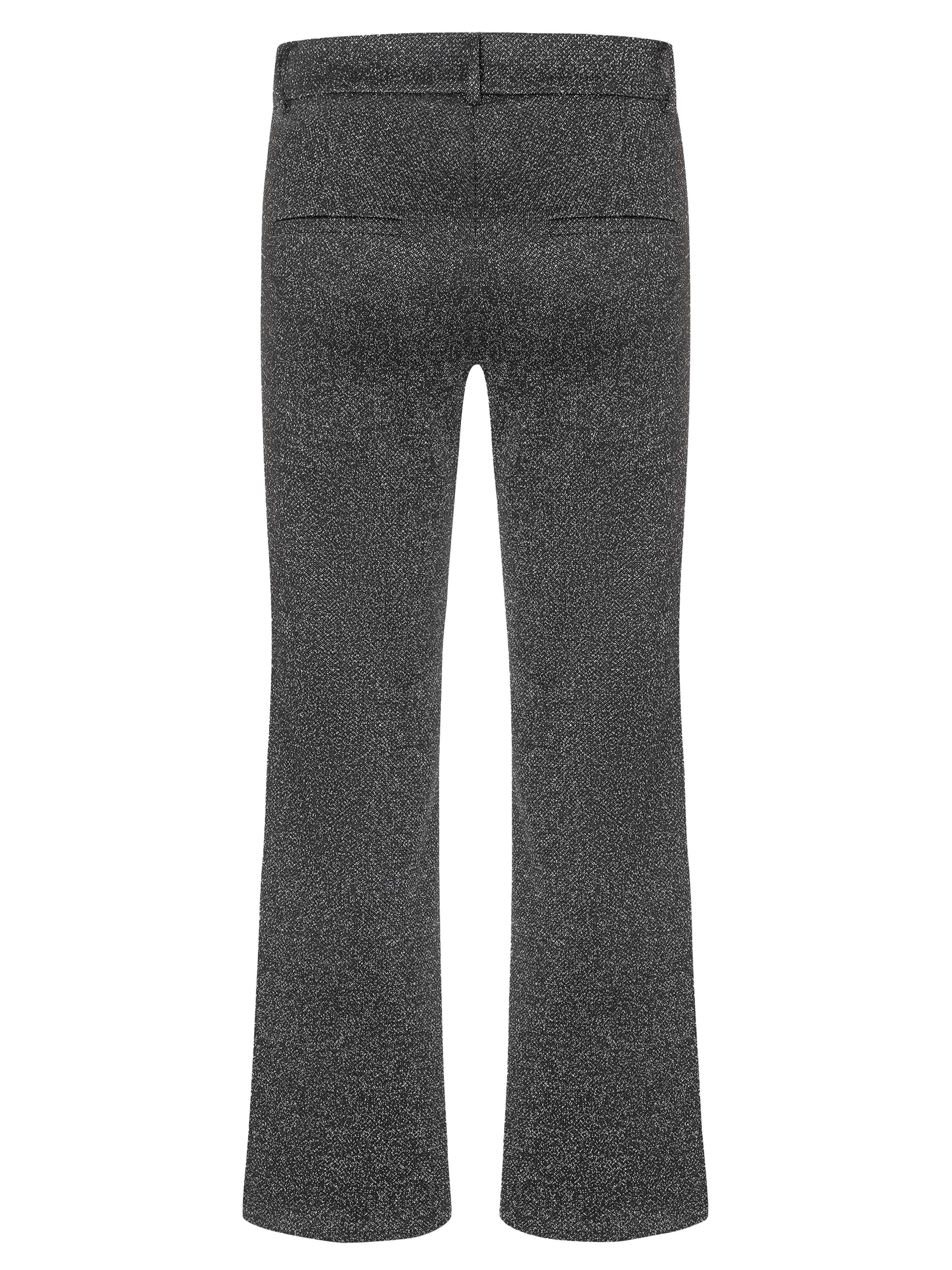 Eine Schlaghose von Cambio in Schwarz mit einem dezenten Silberfaden im Stoff, der einen glitzernden Effekt erzeugt. In der Mitte der Hosenbeine verläuft eine umgekehrte Naht. Die Hose verfügt über Seitentaschen und kann von Hand gewaschen werden.