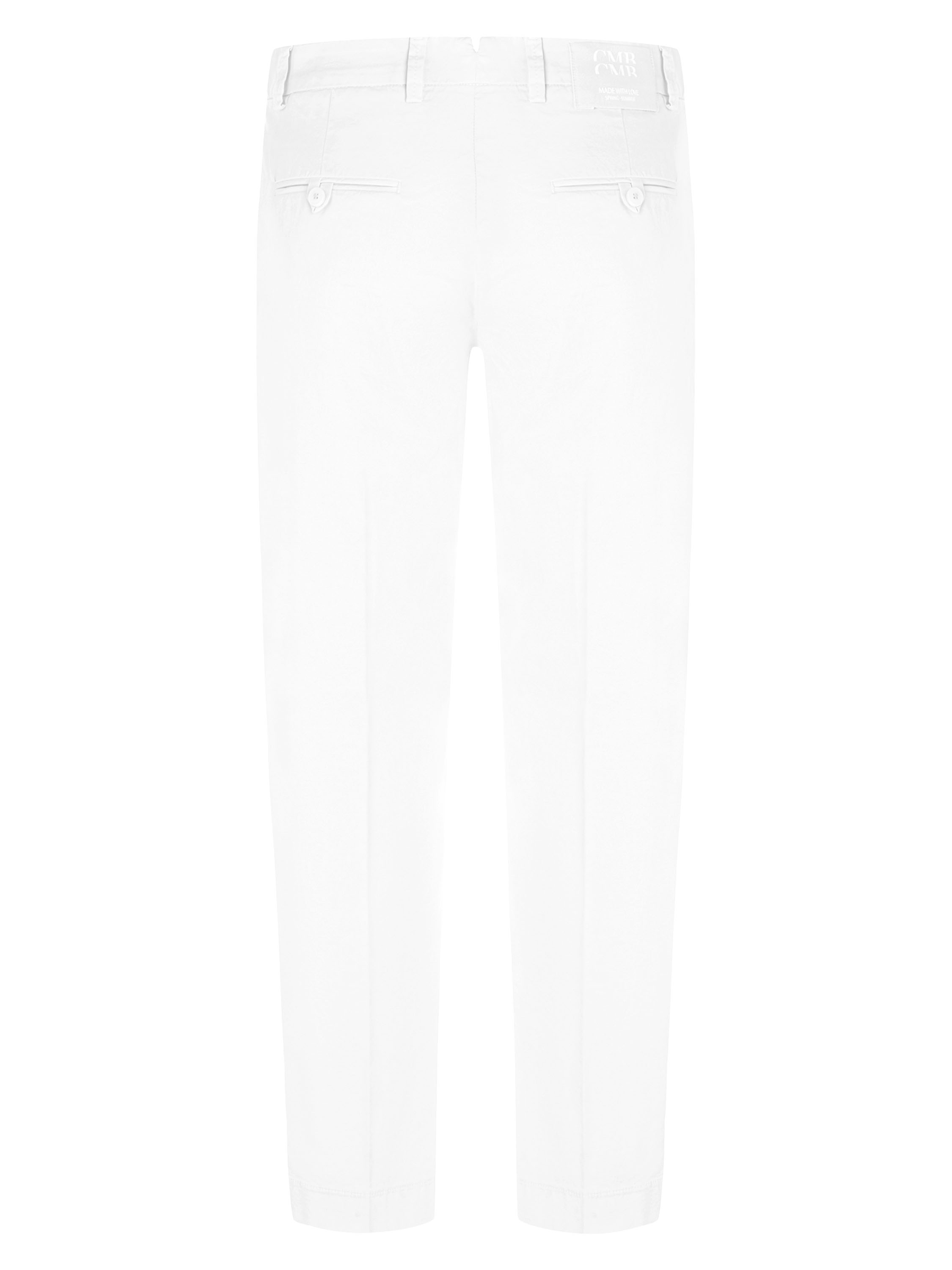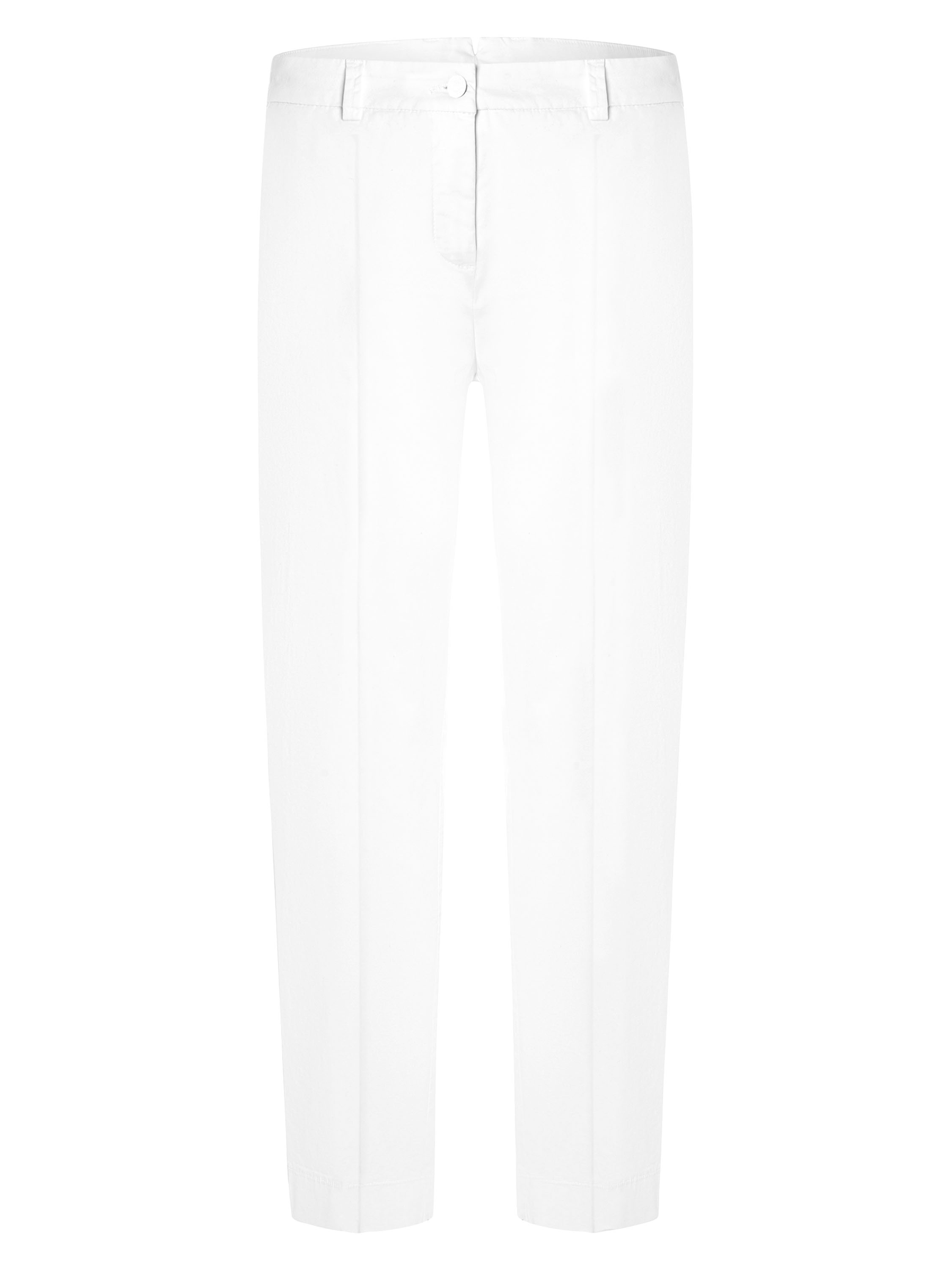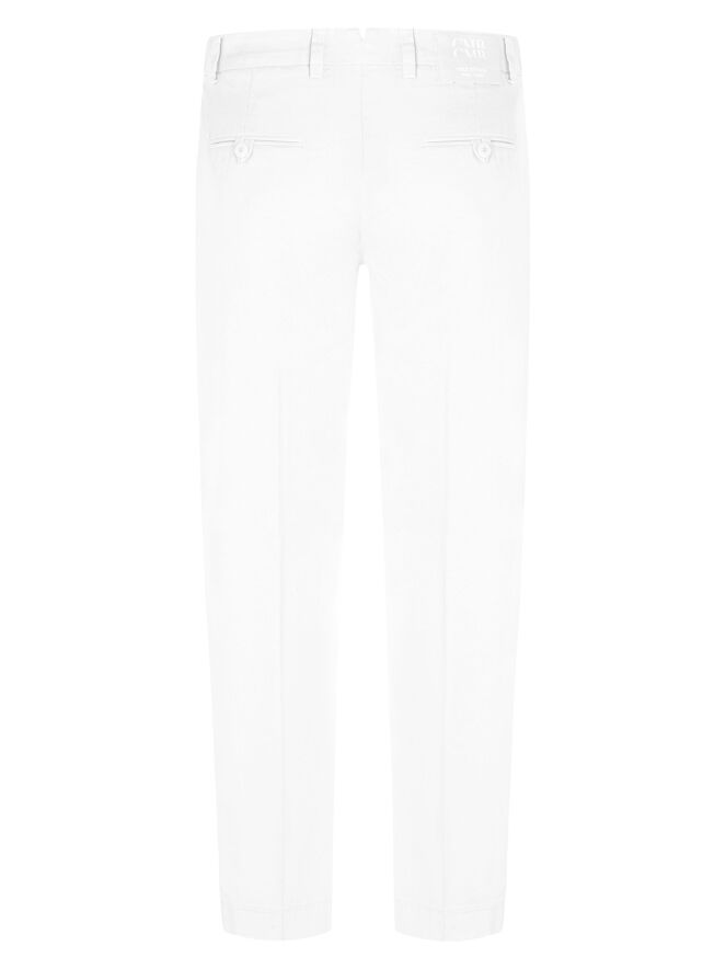 Hose von Cambio in einem klaren Weißton. Eine eingepresste Bügelfalte in der Beinmitte verleiht dem Modell eine elegante und zeitlose Ausstrahlung. Mit Eingrifftaschen versehen, kann diese Hose bei 30 Grad gewaschen werden.