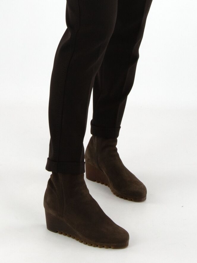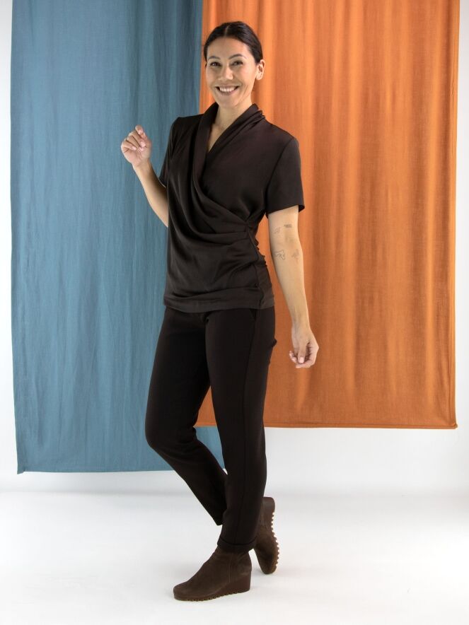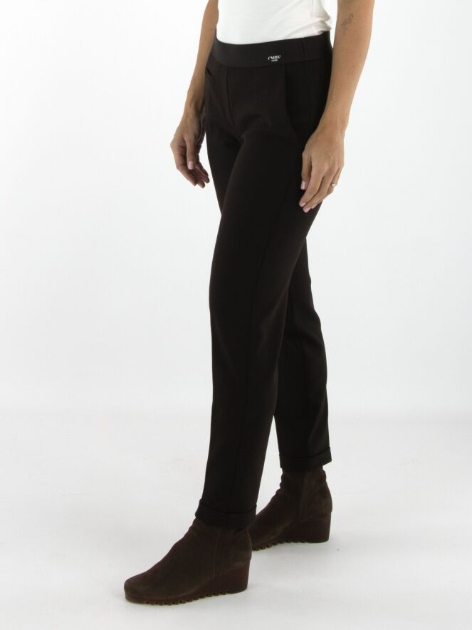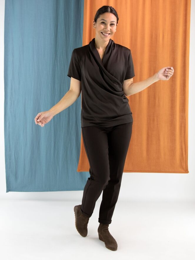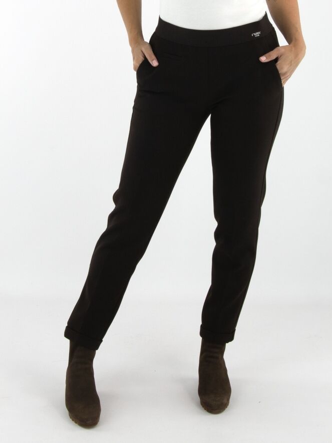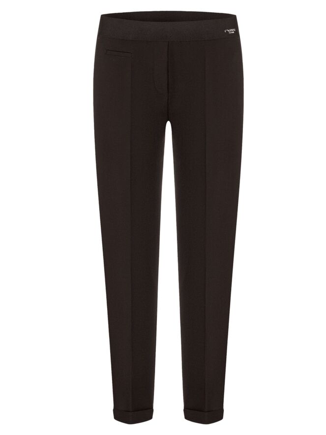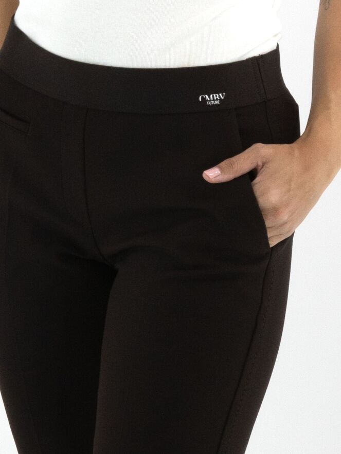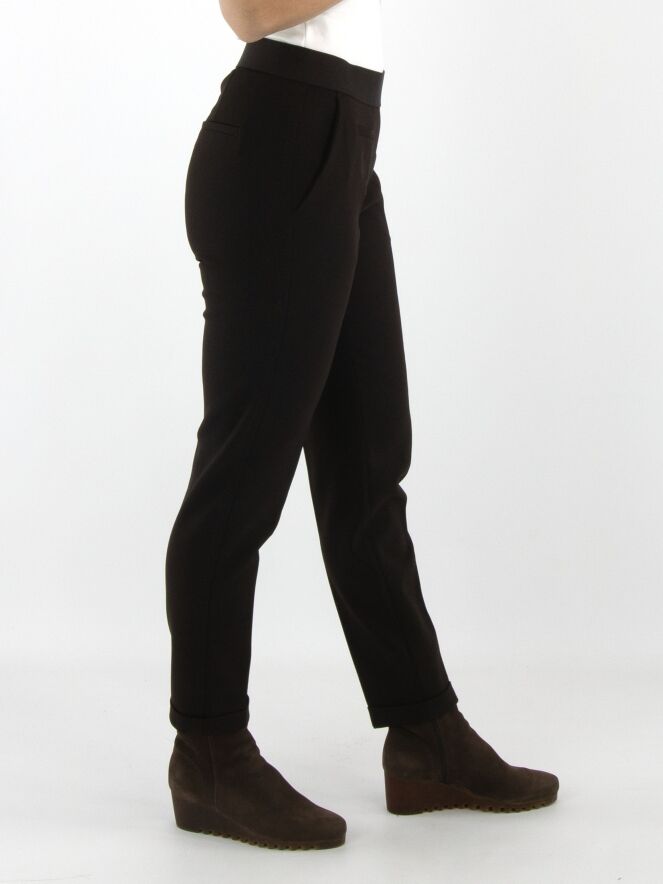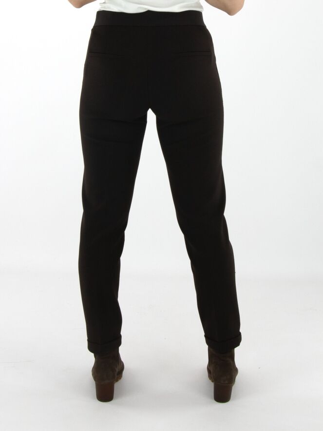 Eine Hose von Cambio in Mokkabraun. Der Bund ist mit einem elastischen Einsatz gearbeitet. In der Mitte der Hosenbeine verläuft eine eingepresste Falte. Die Hose verfügt über Seitentaschen, und entlang der Seiten ist eine dekorative Naht als Biese eingearbeitet. Diese Hose kann von Hand gewaschen werden.