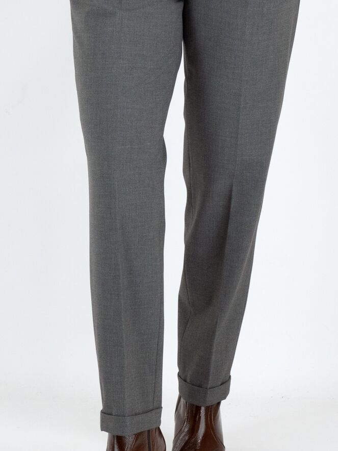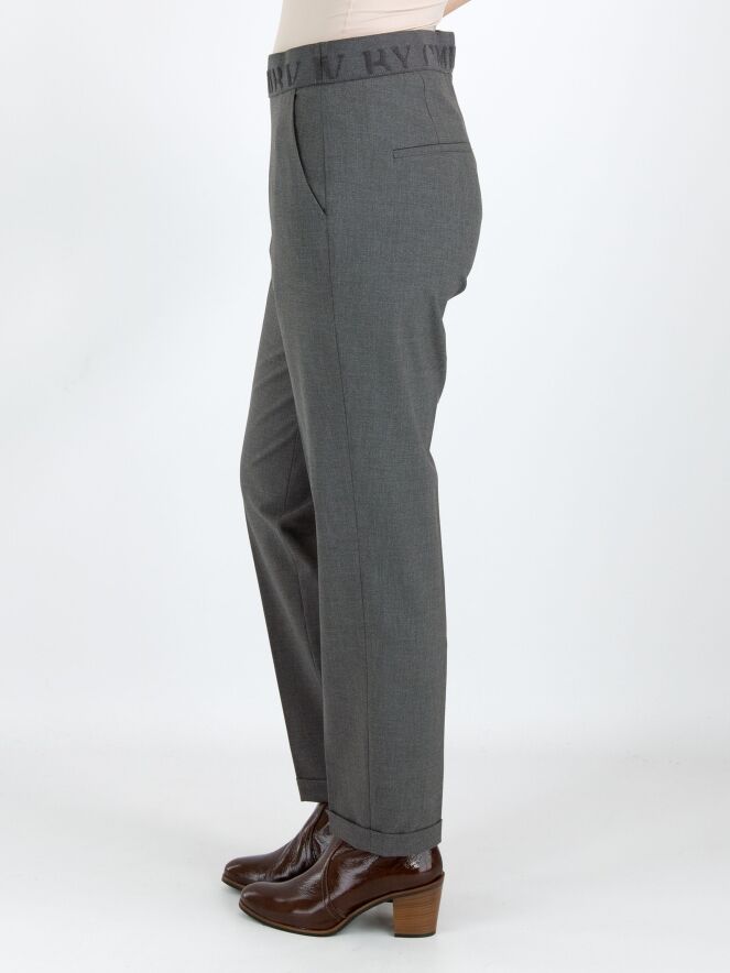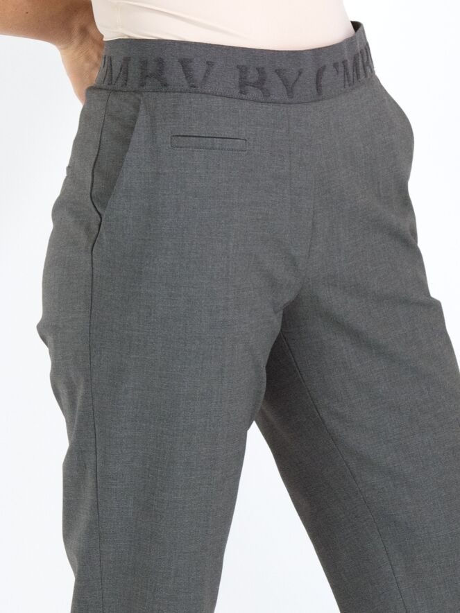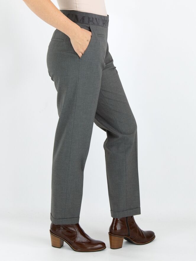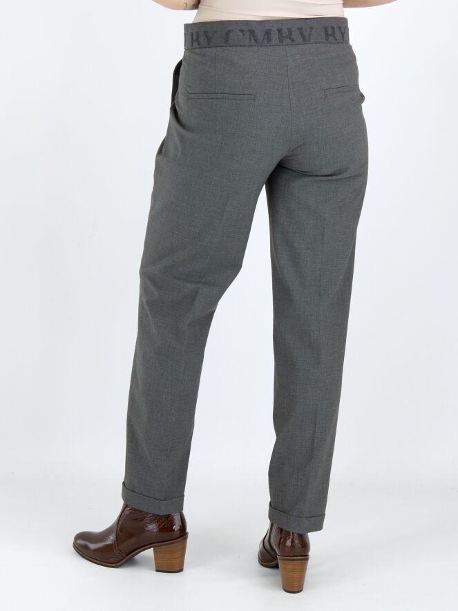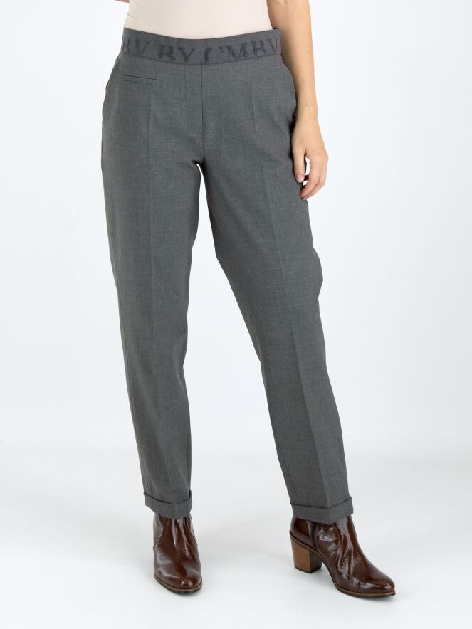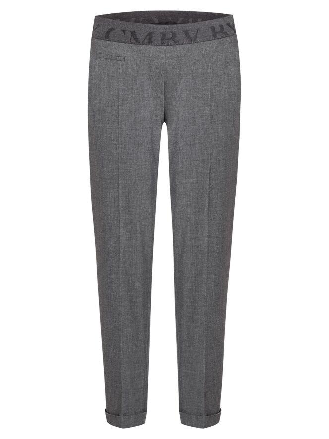 Eine Hose von Cambio in grauer Farbe. In der Taille befindet sich ein graues Gummiband. In der Mitte der Hosenbeine gibt es eine eingepresste Falte. Am unteren Ende befindet sich ein kurzer Umschlag, und die Hose hat Eingrifftaschen. Diese Hose kann bei 30 Grad gewaschen werden.