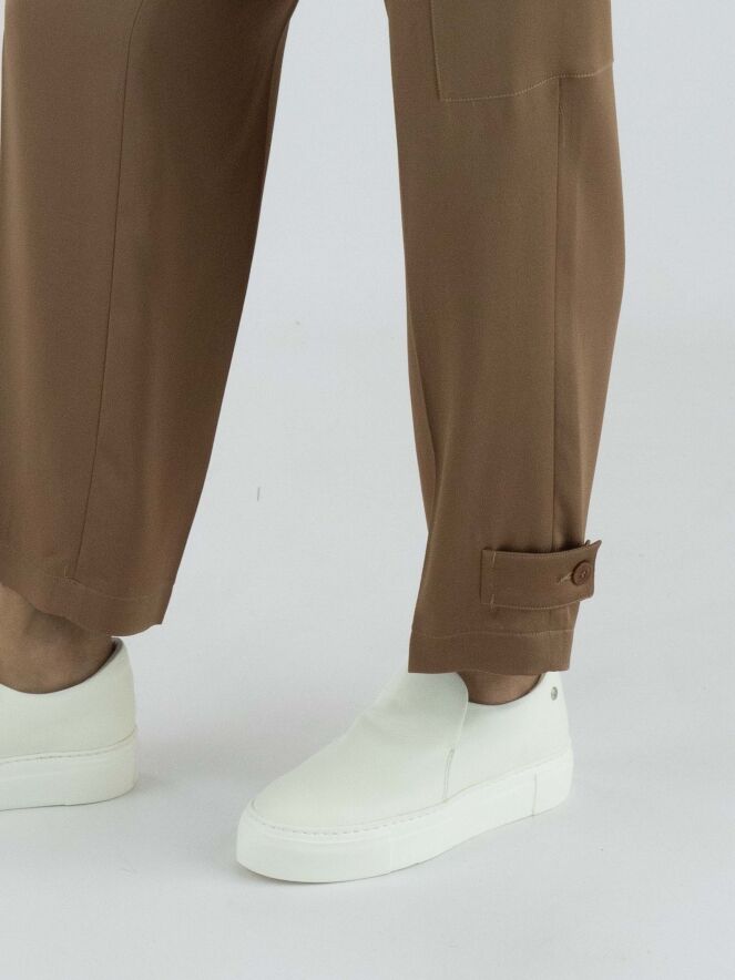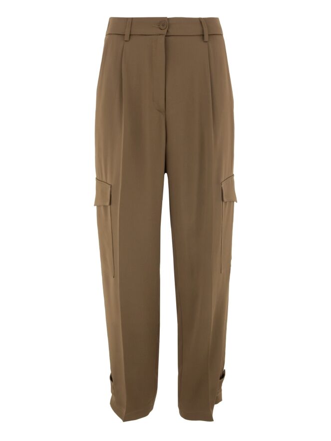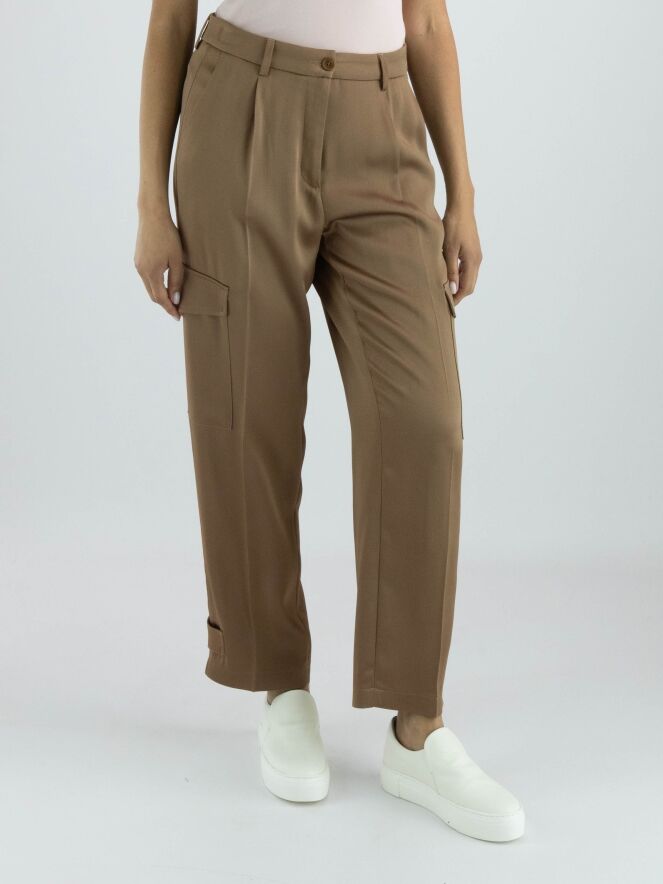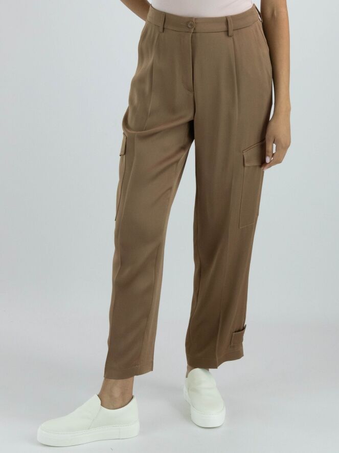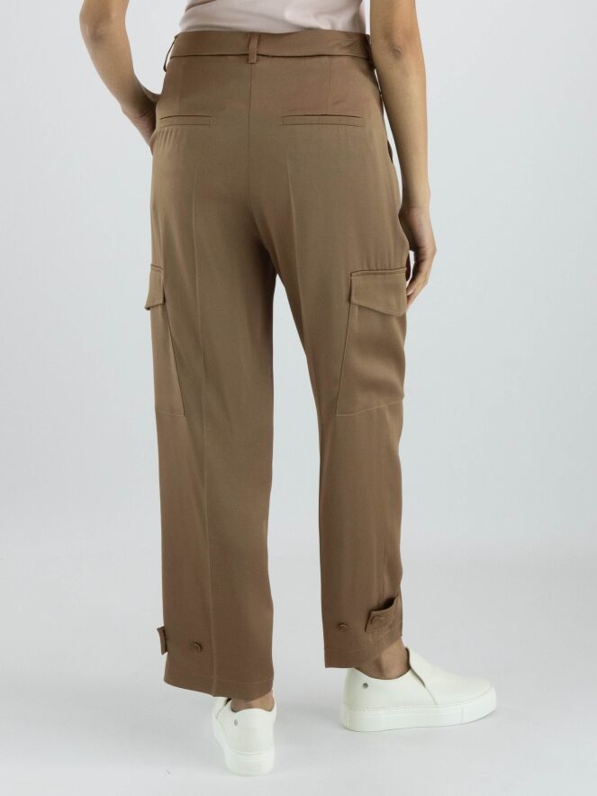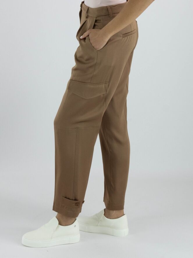 Eine luxuriöse matte Satin-Cargohose von Cambio in Gold. Die Hose hat Eingrifftaschen und eine gebügelte Falte in der Mitte der Beine. Am unteren Ende der Beine befindet sich eine dekorative Schnalle, mit der die Hose etwas enger gemacht werden kann. Diese Hose kann von Hand gewaschen werden.