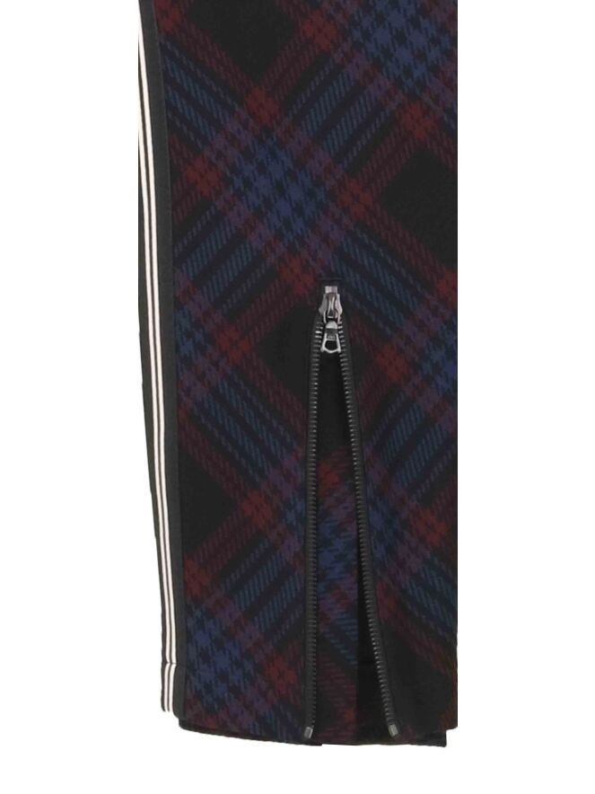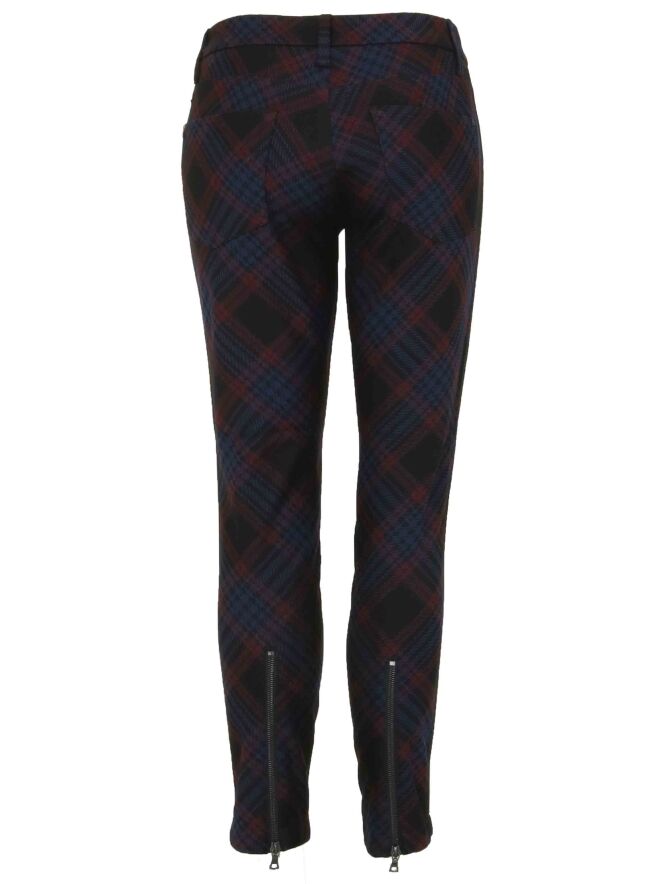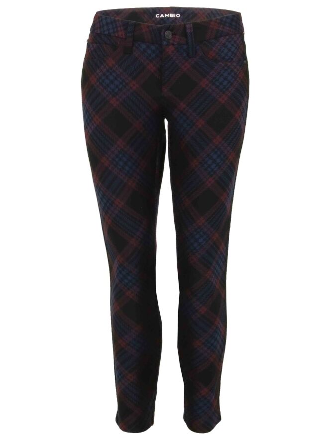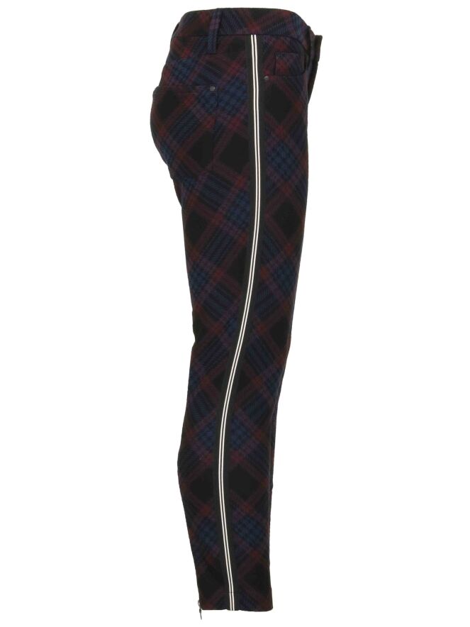 Schwarze Hose der Designermarke Cambio mit diagonalem Karomuster in Weinrot und Nachtblau. An den Längsseiten verläuft eine breite, schwarze Borte mit weißen Streifen. Diese 5-Pocket-Hose darf von Hand gewaschen werden.