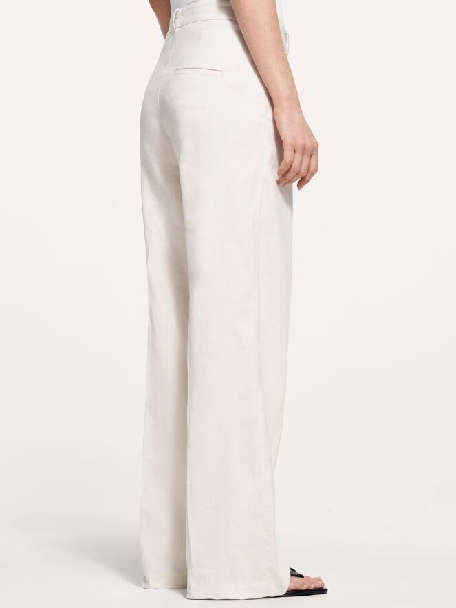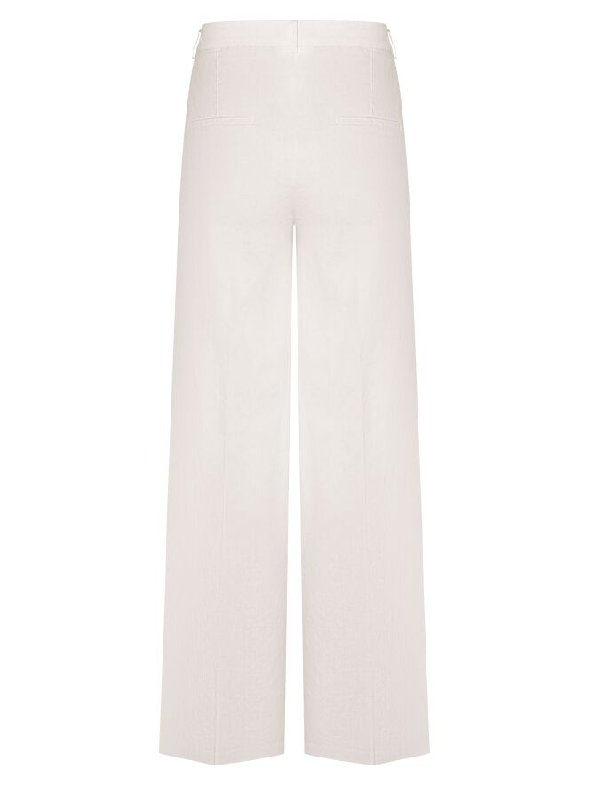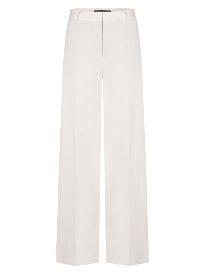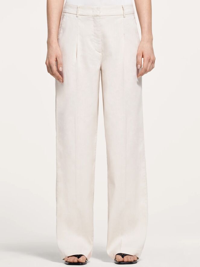 Eine Hose von Cambio in Sandfarbe. Die Hose ist gerade geschnitten und hat Seitentaschen. In der Mitte der Beine ist eine eingebügelte Falte. Diese Hose sollte von Hand gewaschen werden.