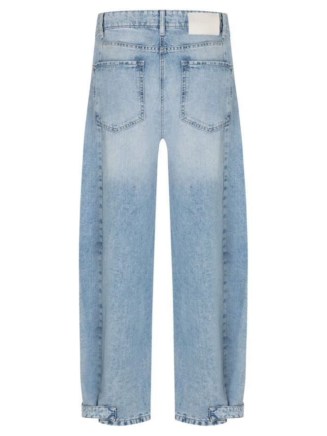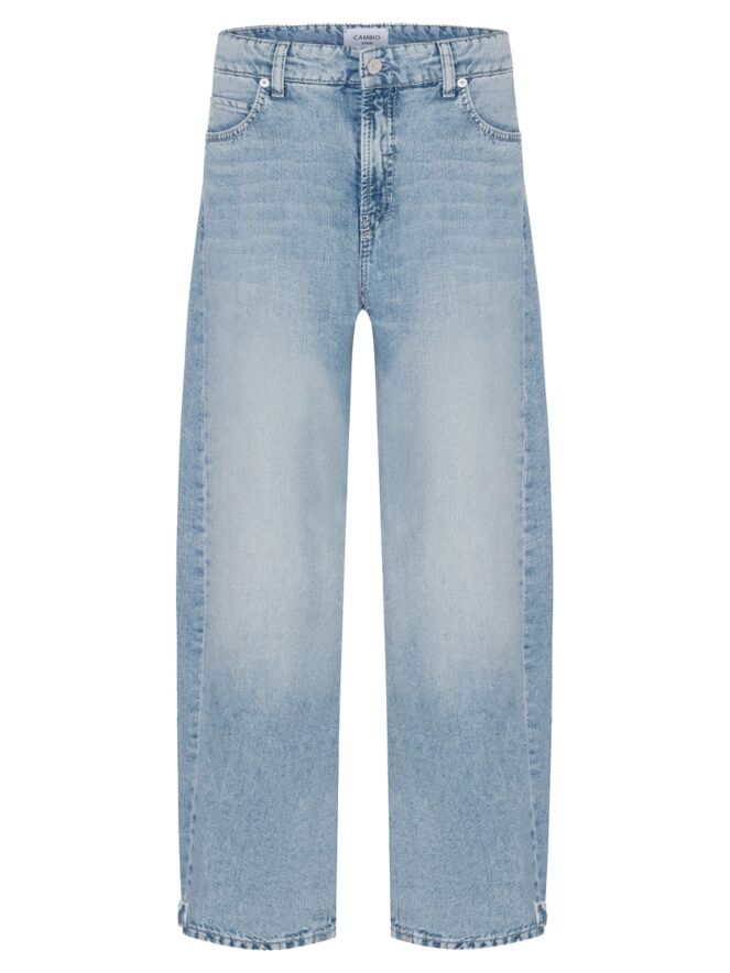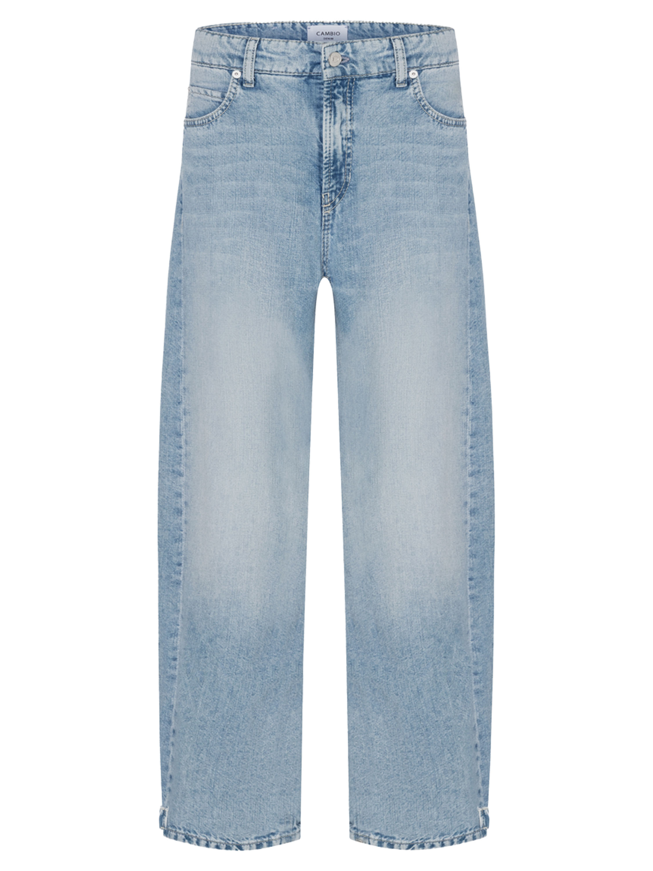 Weite Jeans von Cambio in hellblauer Denim-Optik im klassischen 5-Pocket-Stil. Der Leinenanteil in der Stoffzusammensetzung sorgt für ein besonders weiches und angenehmes Tragegefühl. Am äußeren Beinabschluss ist ein kurzes dekoratives Band mit Druckknopf angebracht, das einen modernen Akzent setzt. Diese exklusive Designerjeans sollte per Hand gewaschen werden.