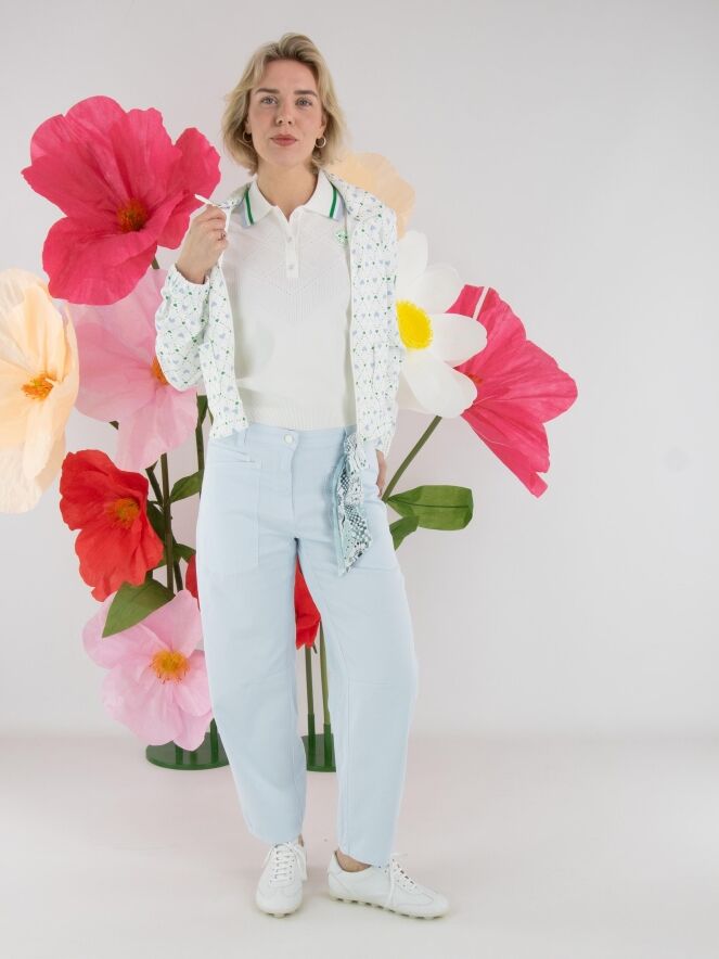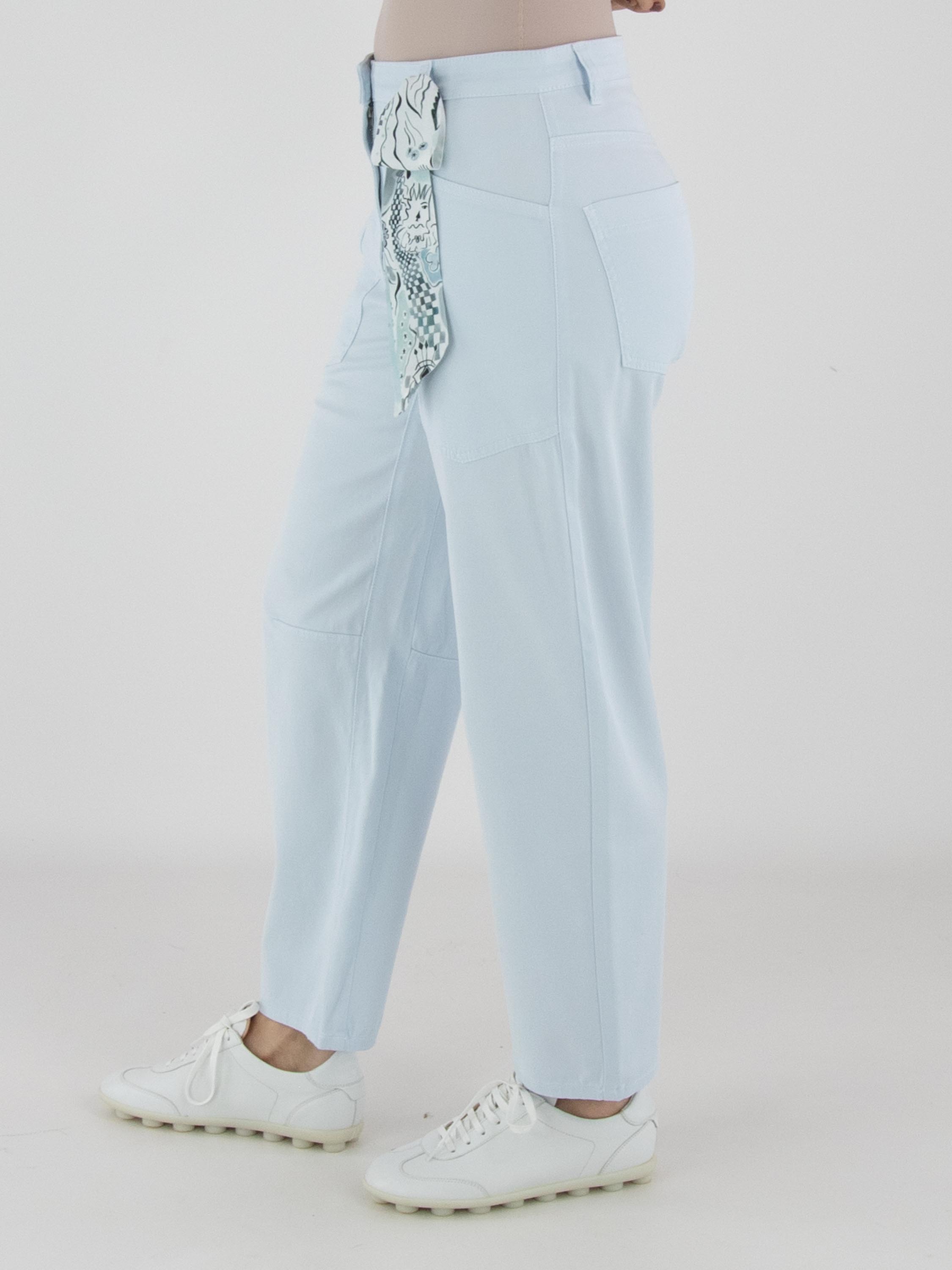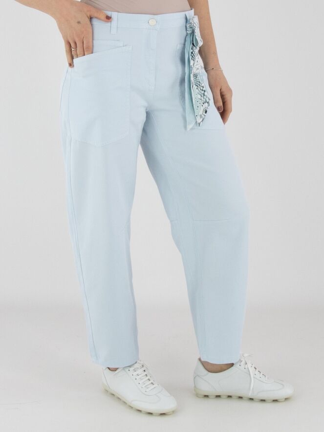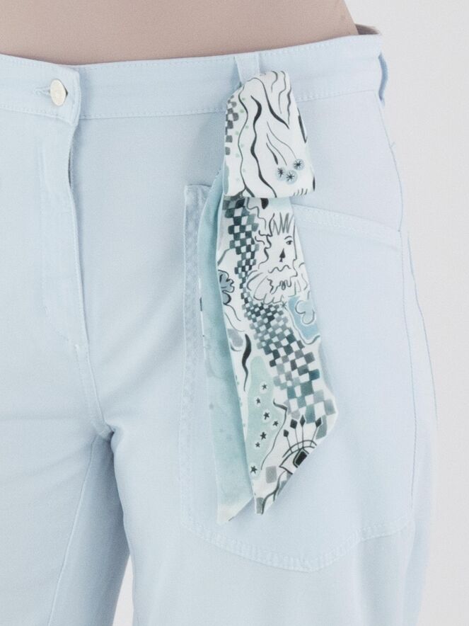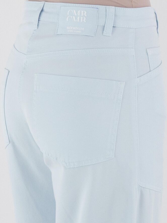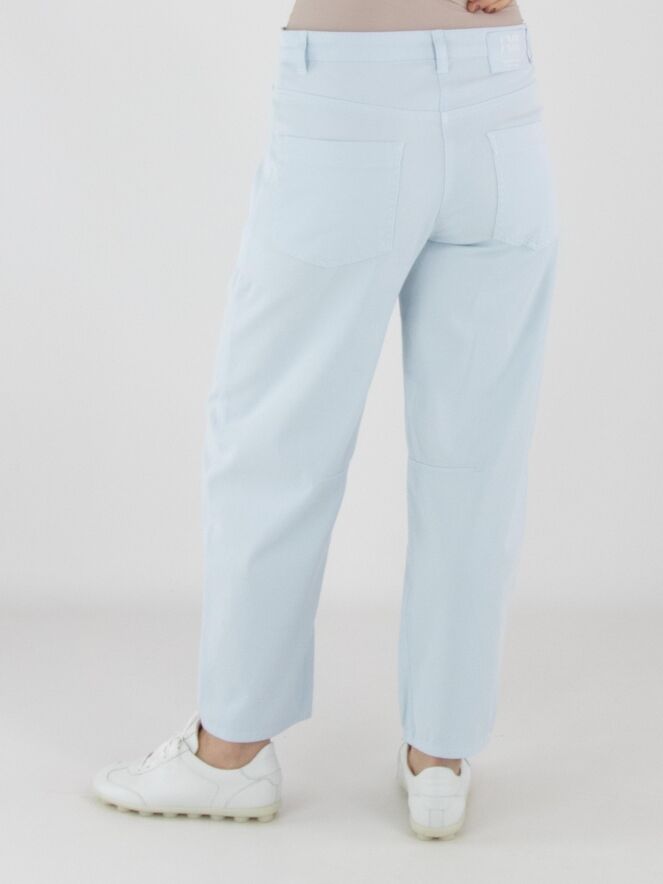 Eine Hose von Cambio in Hellblau. Die Hose ist im 5-Pocket-Stil gefertigt, wobei die vorderen Taschen gerade geschnitten und tief sind. Auf Kniehöhe ist eine Naht eingearbeitet. Diese Hose kann bei 30 Grad gewaschen werden.