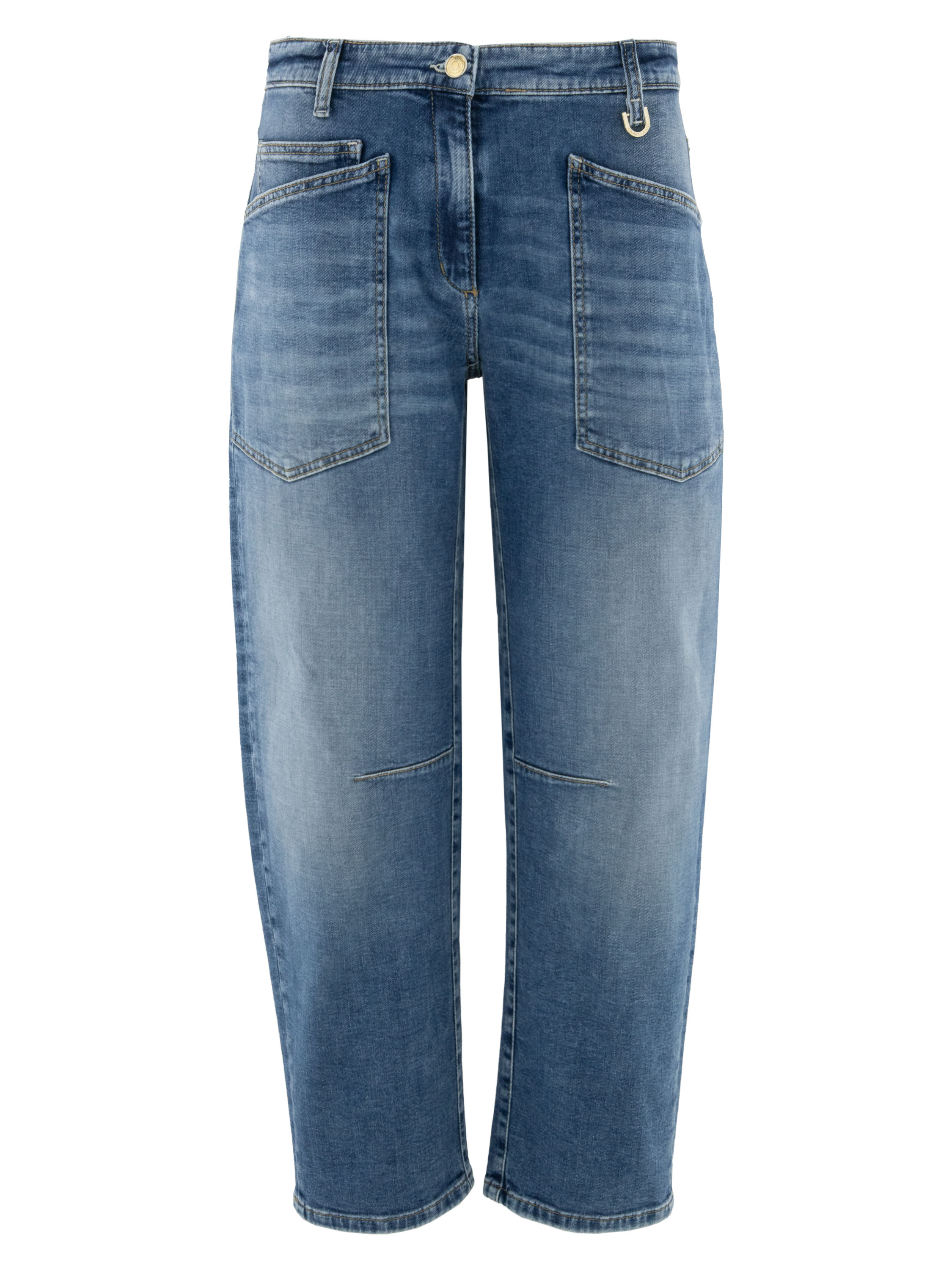 Jeans von Cambio in klassischer Denimfarbe. Das 5-Pocket-Modell verfügt über leicht tiefer angesetzte Taschen und verleiht dem Design eine moderne, lässige Note. Auf Kniehöhe befindet sich an der Innenseite der Beine eine formgebende Naht, die die Silhouette dezent betont. Diese Jeans kann bei 30 Grad gewaschen werden.
