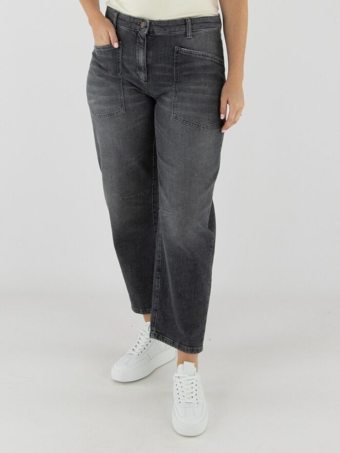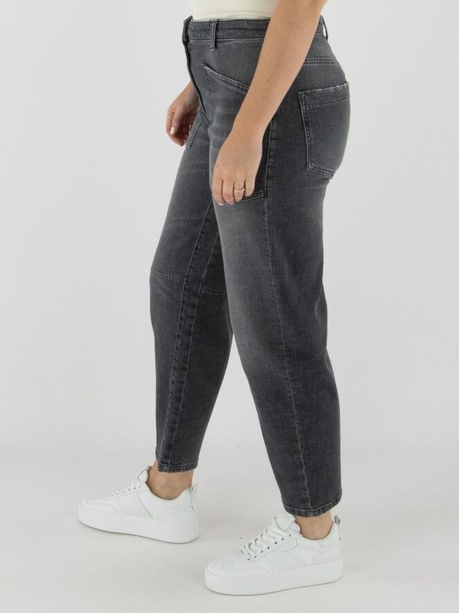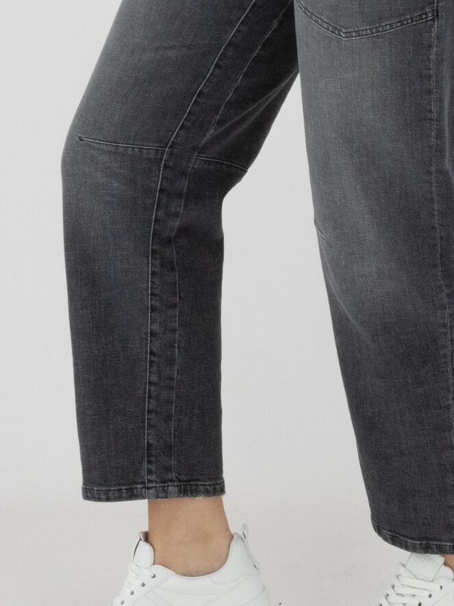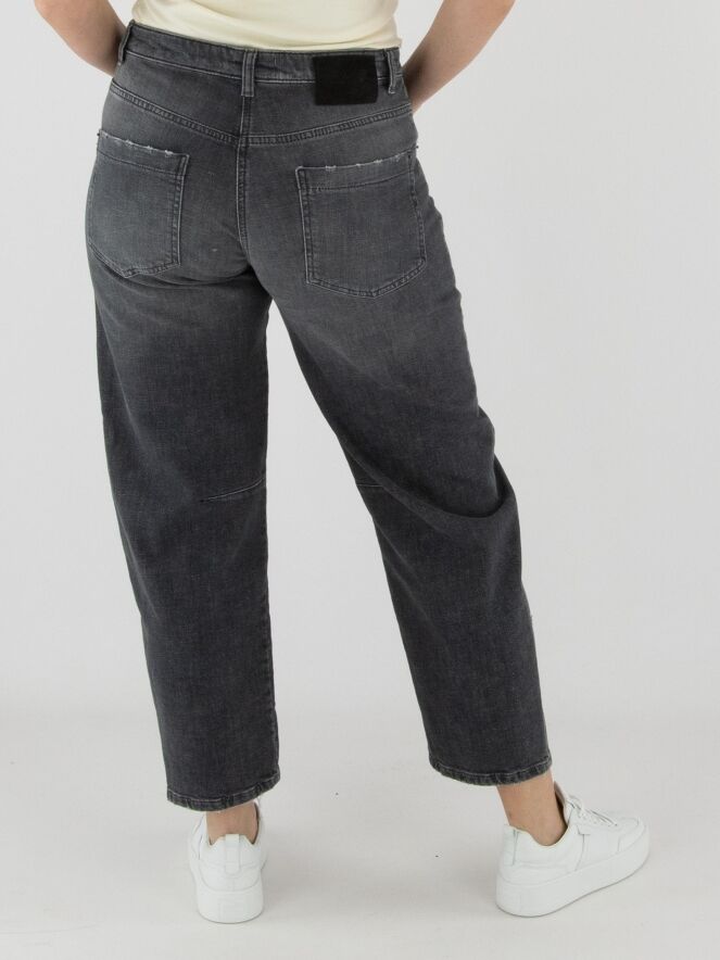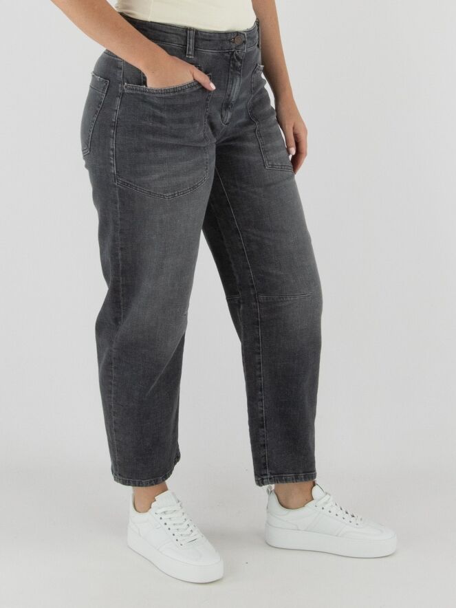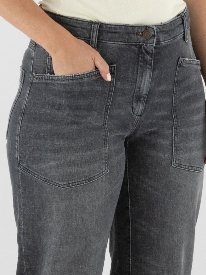 Eine Used-Look-Jeans von Cambio in Grau im klassischen 5-Pocket-Design mit diagonal geschnittenen Taschen. Auf Kniehöhe verläuft eine Abnähernaht. Diese Jeans kann bei 30 Grad gewaschen werden.