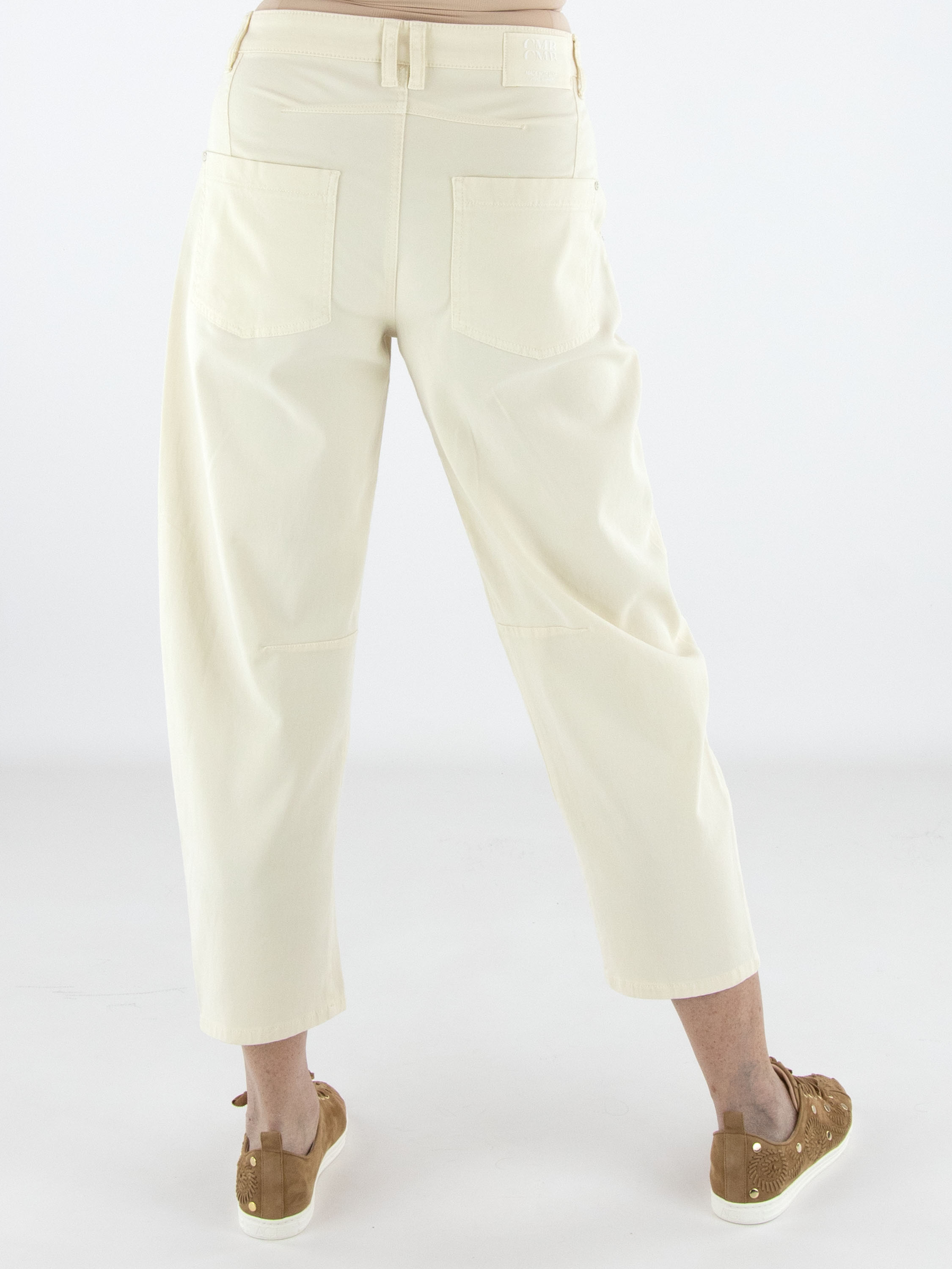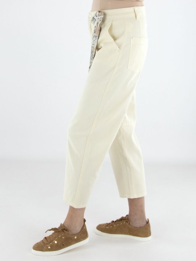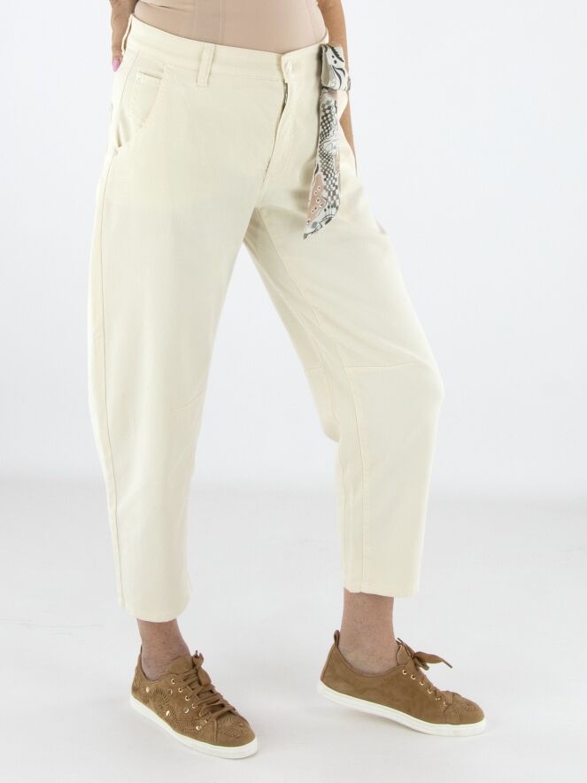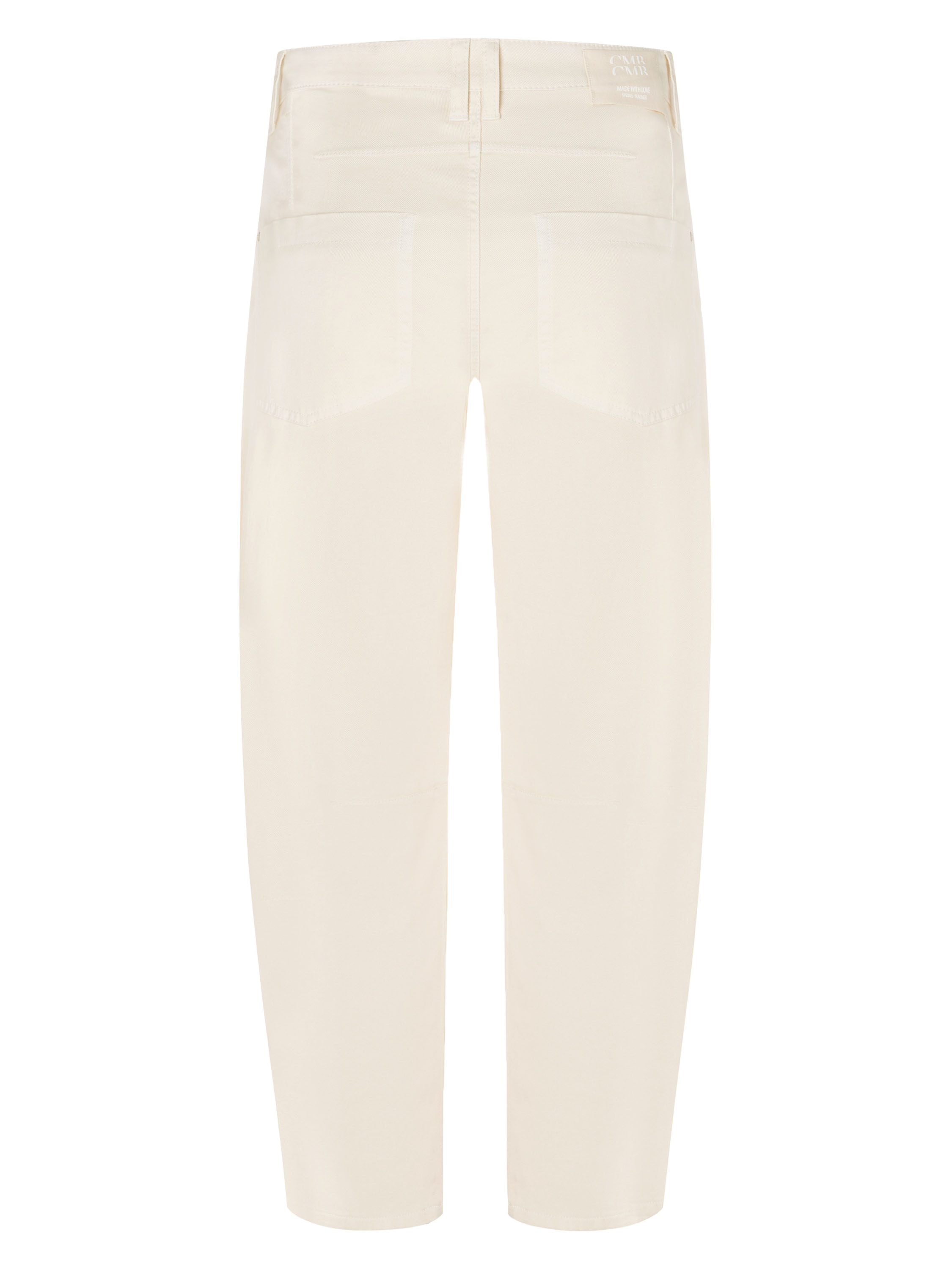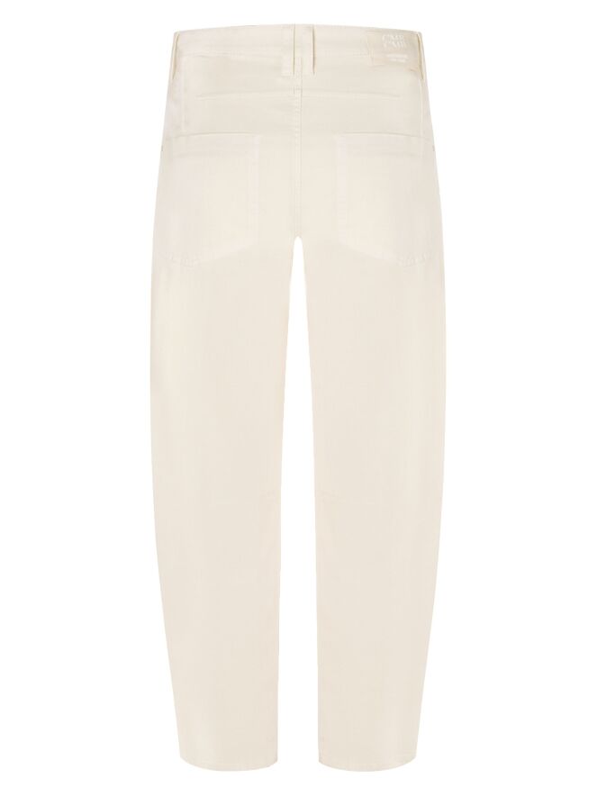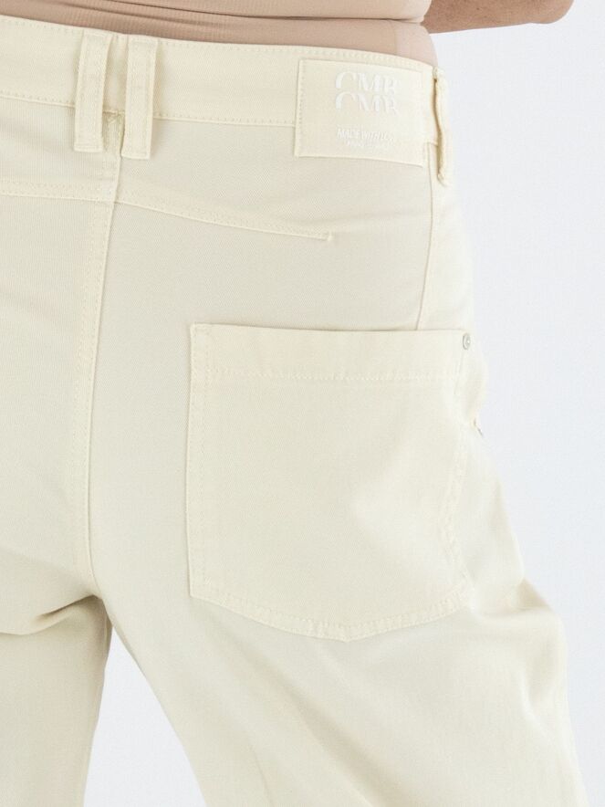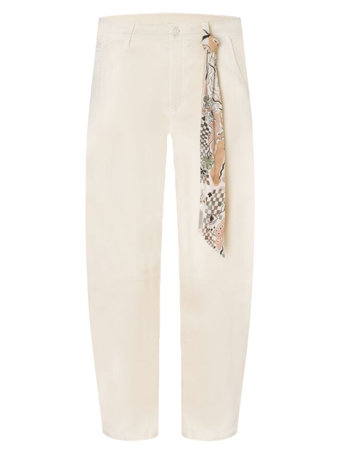 Jeans von Cambio in einem hellen Sandton. Das 5-Pocket-Modell verfügt über Eingrifftaschen und eine formgebende Naht an der Innenseite der Beine auf Kniehöhe, die die Silhouette dezent modelliert. An einer Gürtelschlaufe ist ein kleines Tuch befestigt, das dem Design einen verspielten, stilvollen Akzent verleiht. Diese Hose kann bei 30 Grad gewaschen werden.
