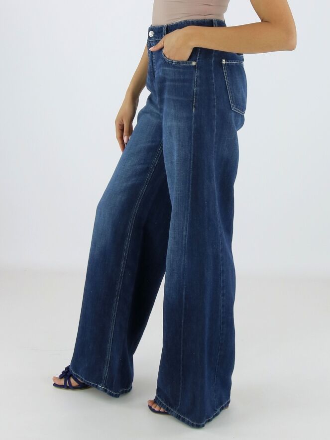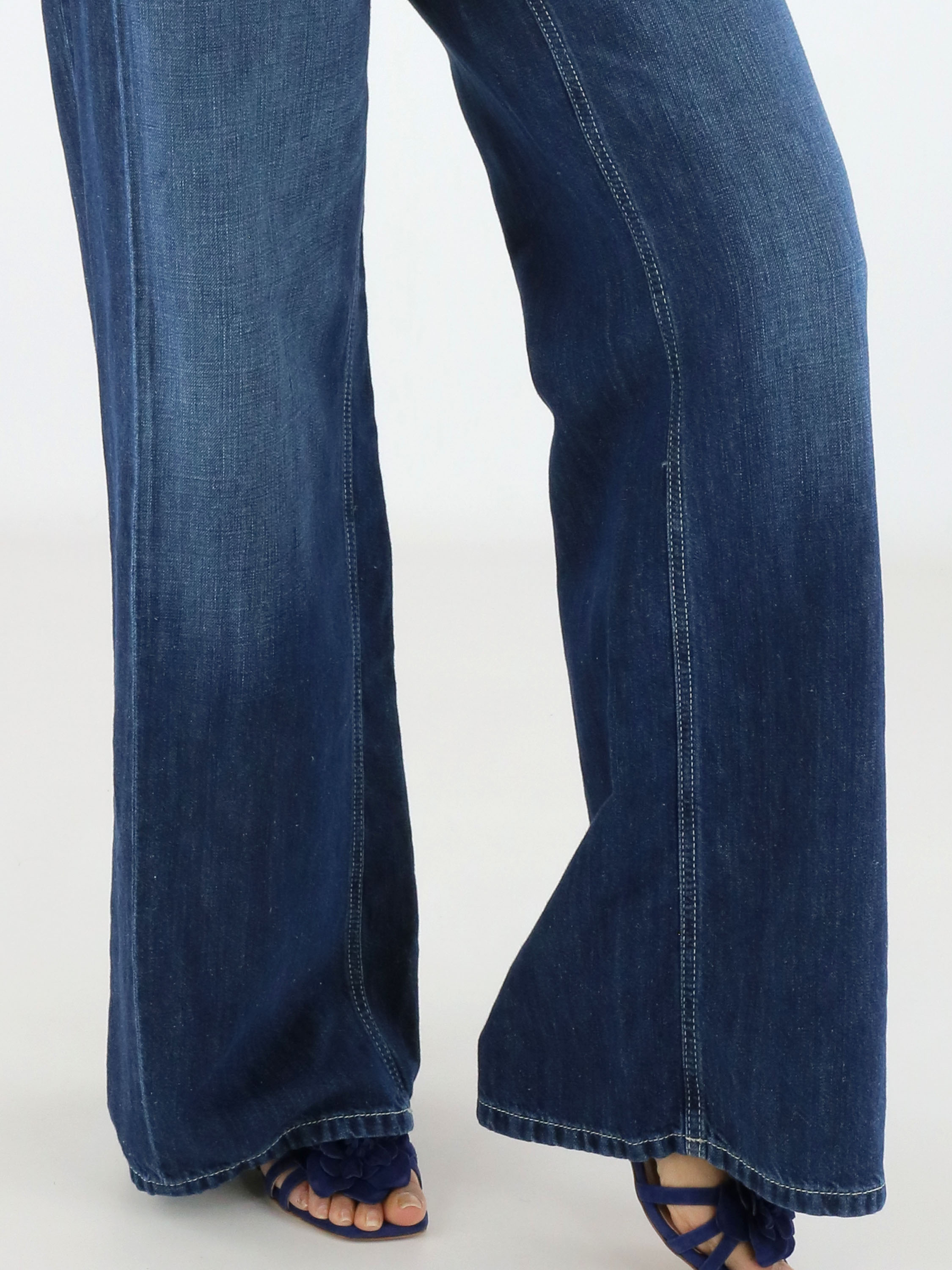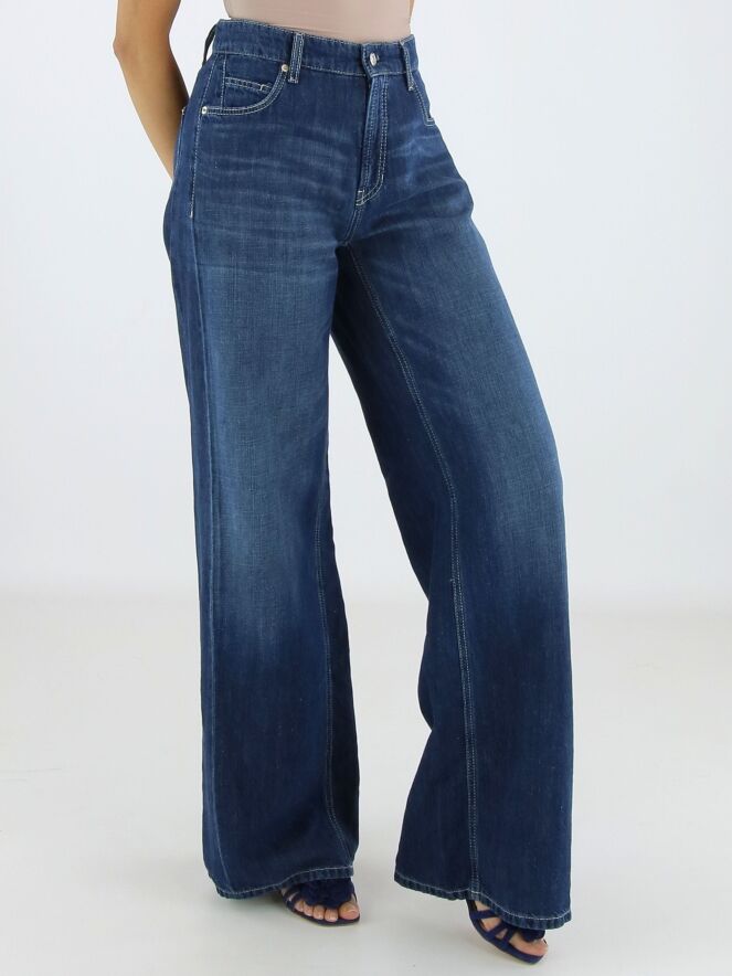 Weite Jeans von Cambio in dunkler Denimfarbe, gearbeitet im modernen 5-Pocket-Stil. Durch den Leinenanteil in der Materialzusammensetzung fühlt sich die Jeans besonders weich und leicht an und bietet einen komfortablen, luxuriösen Tragekomfort. Diese Designerjeans kann bei 30 Grad gewaschen werden.