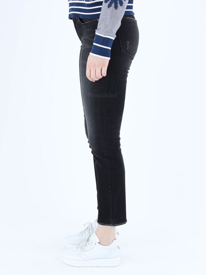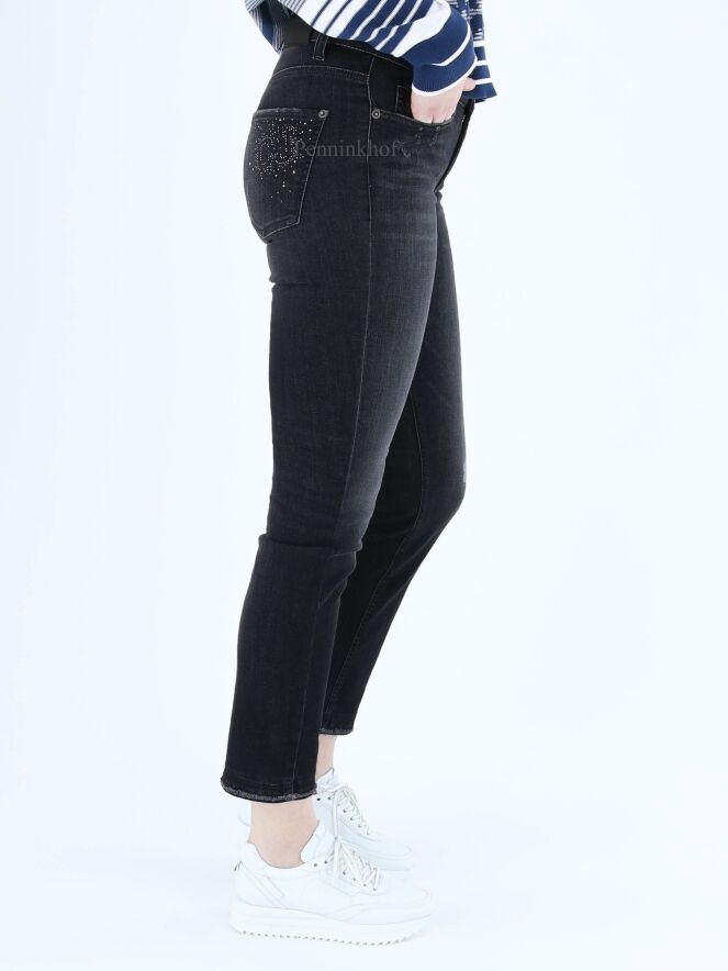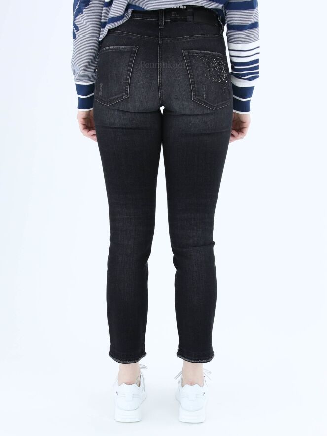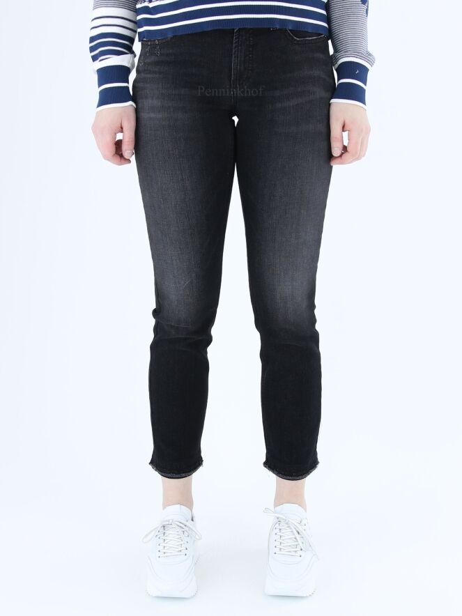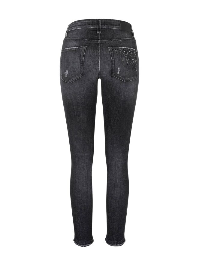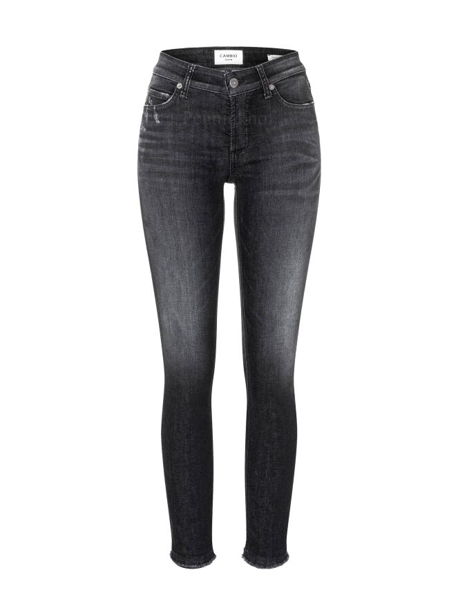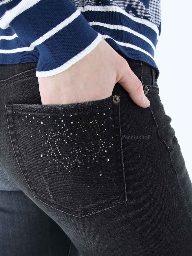 Eine verwaschene Jeans der Designermarke Cambio in Anthrazit. Die Jeans kommt als 5-Pocket-Modell. Auf der rechten Gesäßtasche befindet sich ein Strassmuster. Diese Jeans kann bei 30 Grad gewaschen werden.