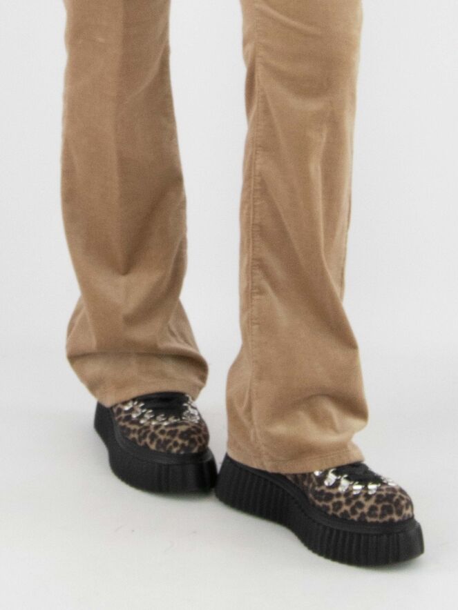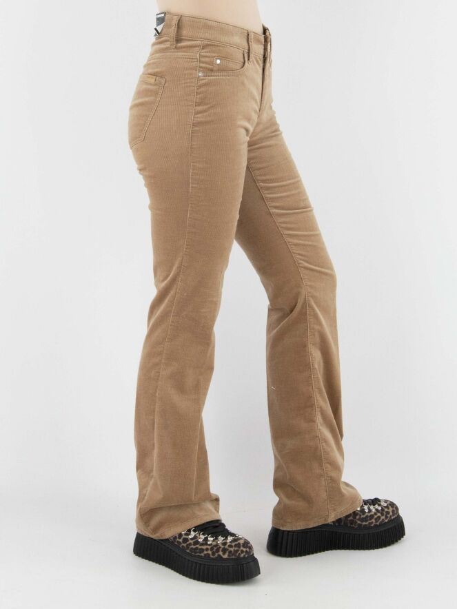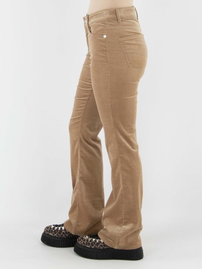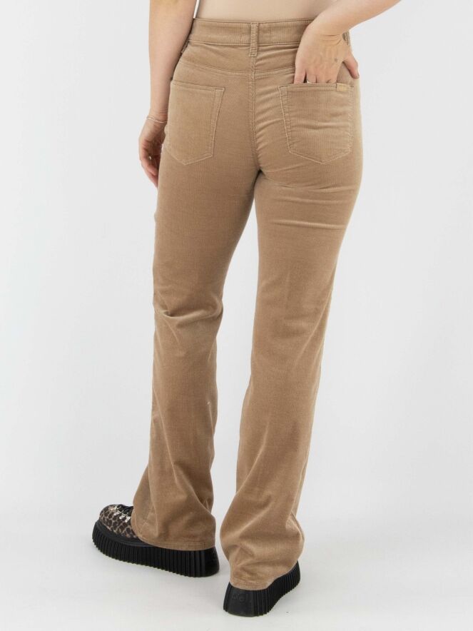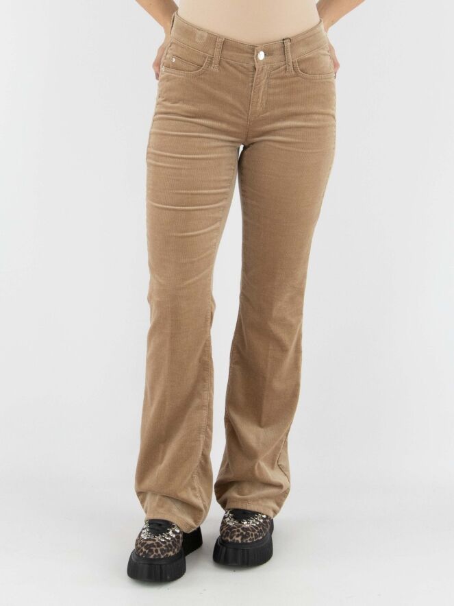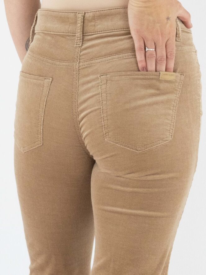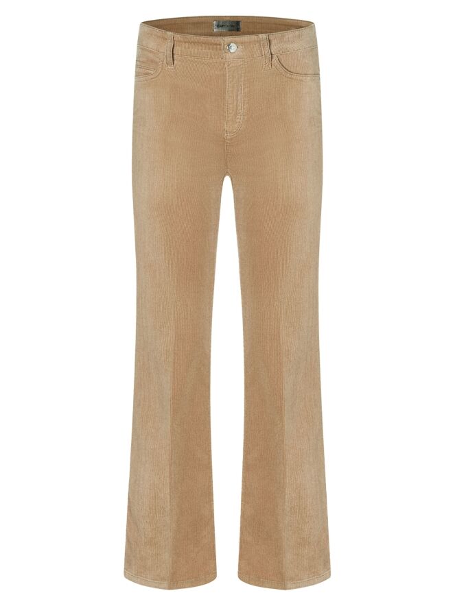 Flared Rippcord-Hose von Cambio in elegantem Camel. Dieses moderne 5-Pocket-Modell vereint eine zeitlose Passform mit einem Hauch von Seventies-Flair und ist dadurch ein vielseitiges, stilvolles Kleidungsstück. Diese exklusive Designerhose kann bei 30 Grad gewaschen werden.
