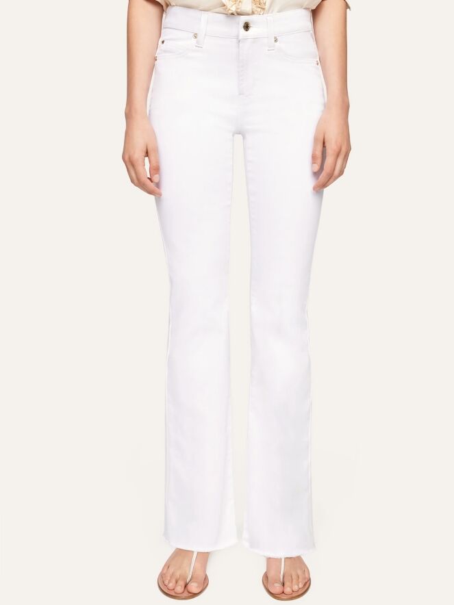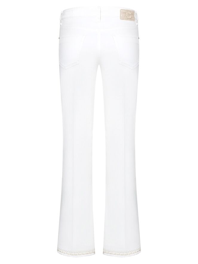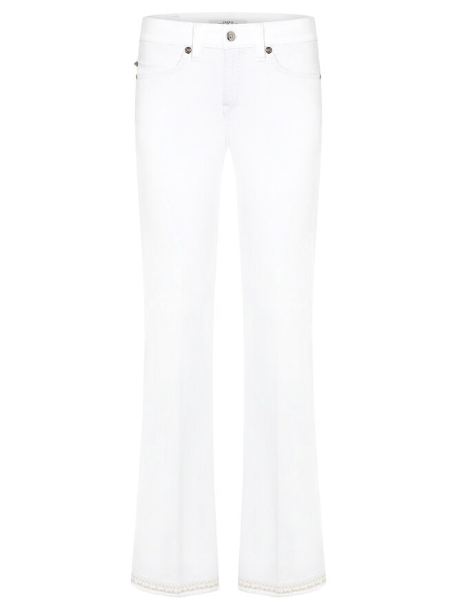 Eine ausgestellte Jeans von Cambio in Weiß. Die Jeans ist im 5-Pocket-Modell gestaltet. Der Rand am unteren Ende der Hosenbeine weist eine doppelte dekorative Biese mit Goldfaden auf. Diese Jeans kann bei 30 Grad gewaschen werden.