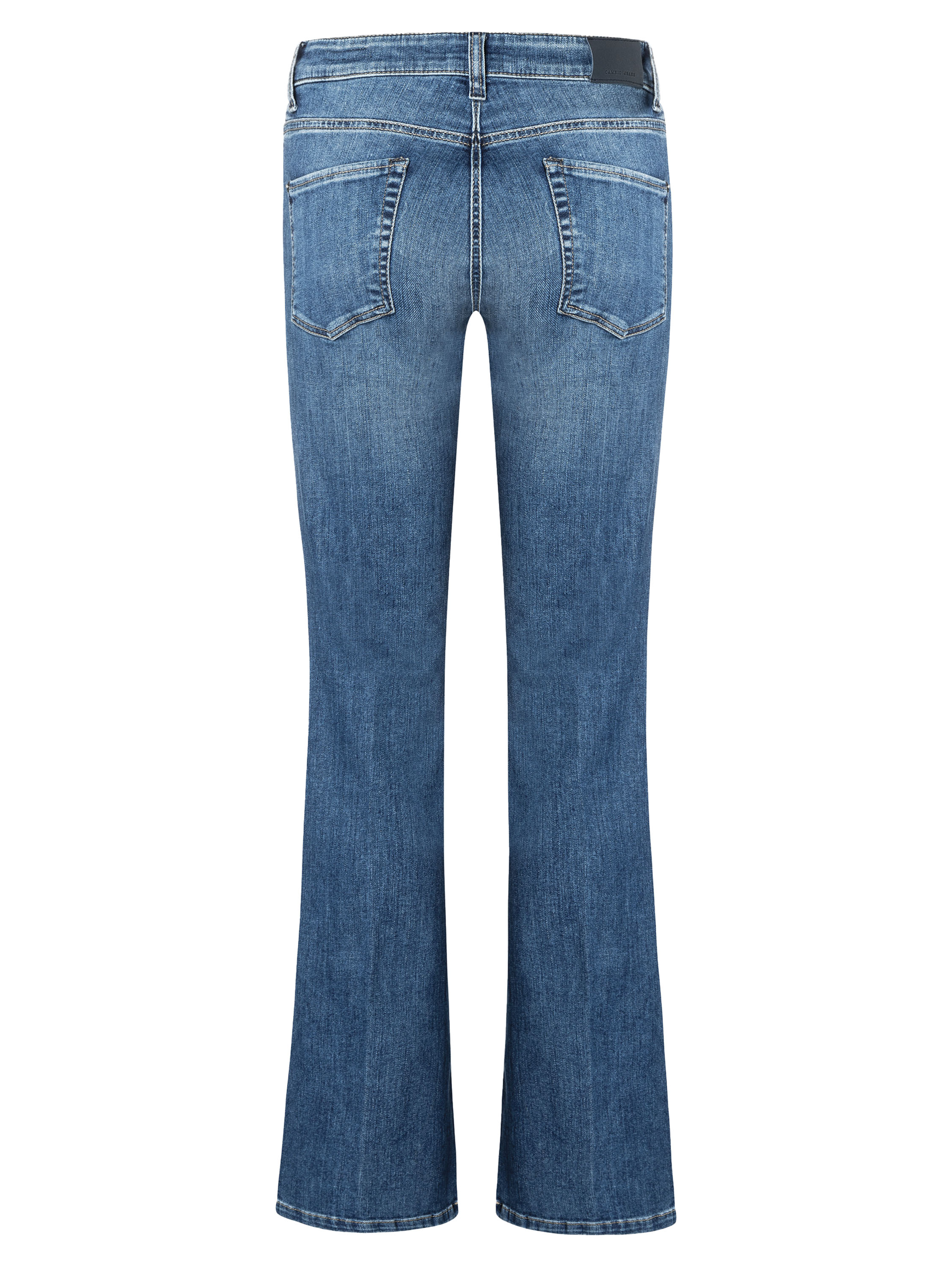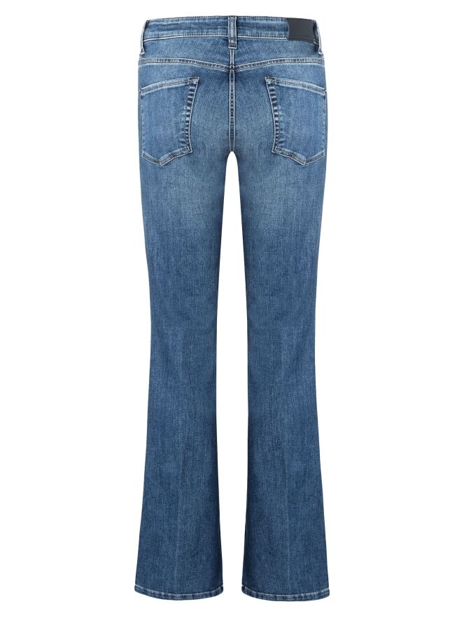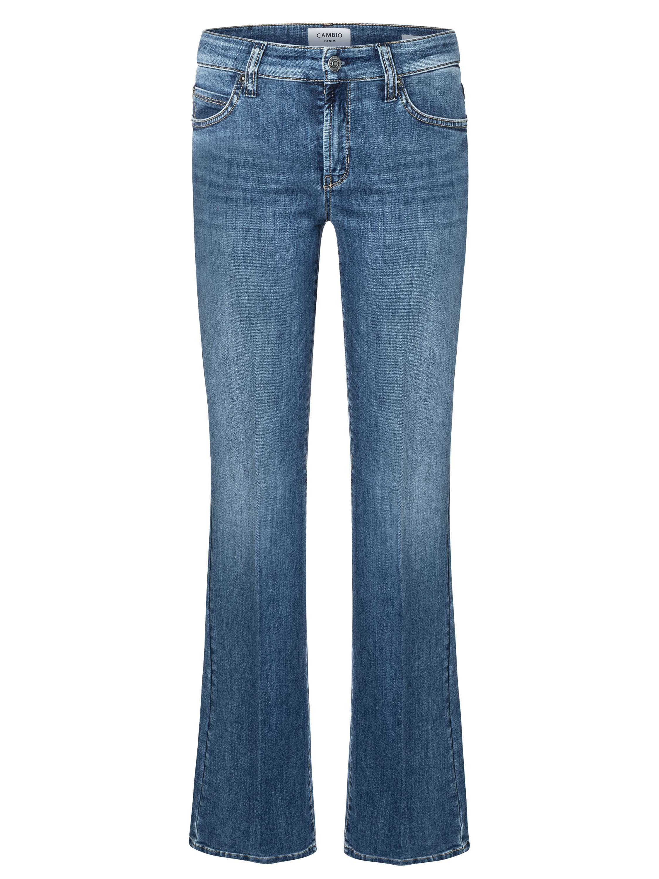 Eine flared Jeans von Cambio im 5-Pocket-Stil. Die Jeans hat einen Used-Look. Die Nähte sind in Cognacfarbe gearbeitet. Diese Jeans kann bei 30 Grad gewaschen werden.