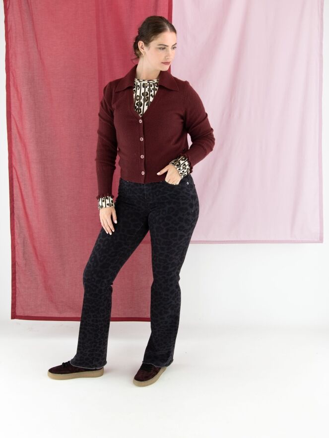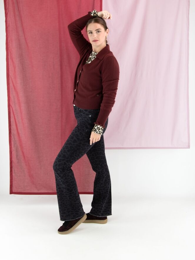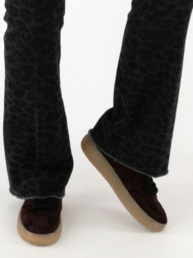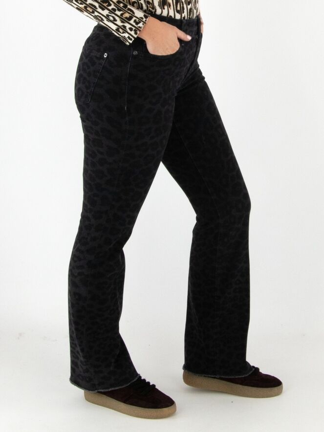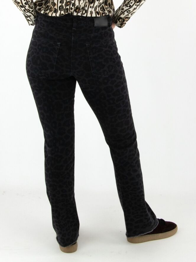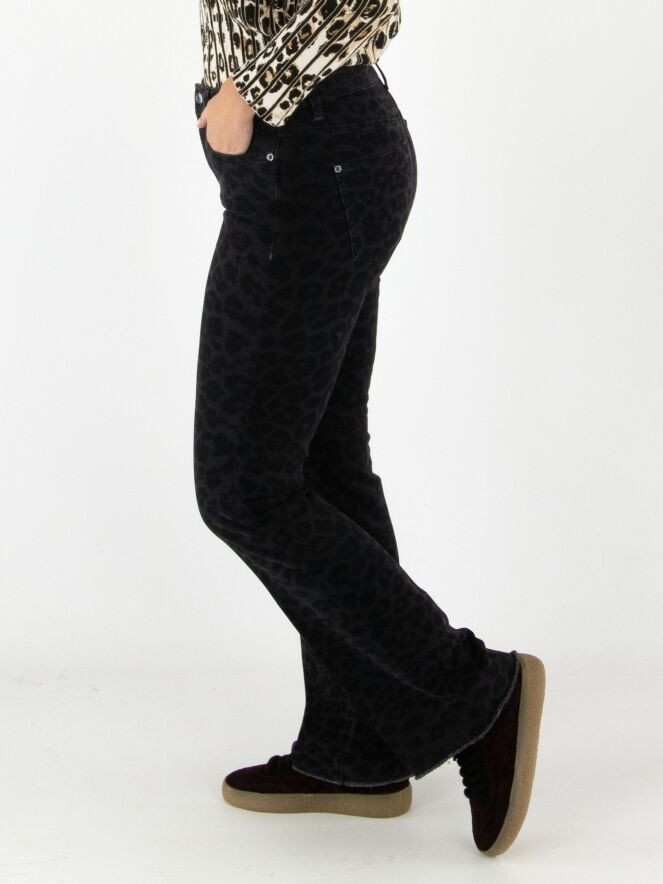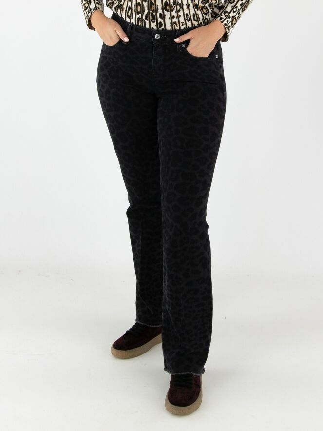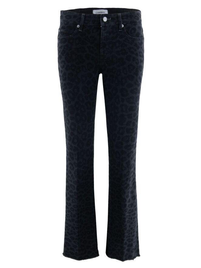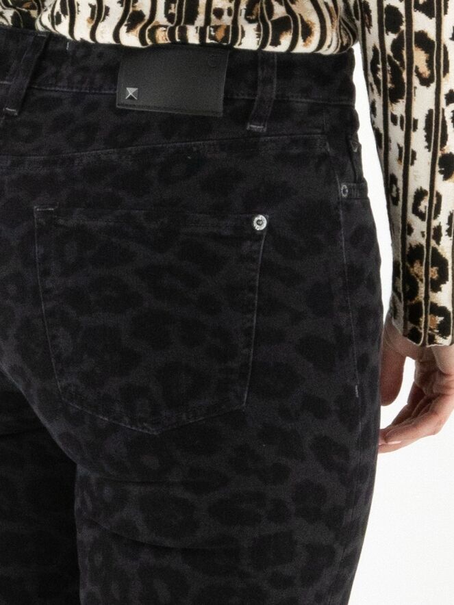 Jeans von Cambio mit einem Leopardenmuster in verschiedenen Grau- und Schwarztönen. Die Jeans ist im 5-Pocket-Stil geschnitten und kann bei 30 Grad gewaschen werden.
