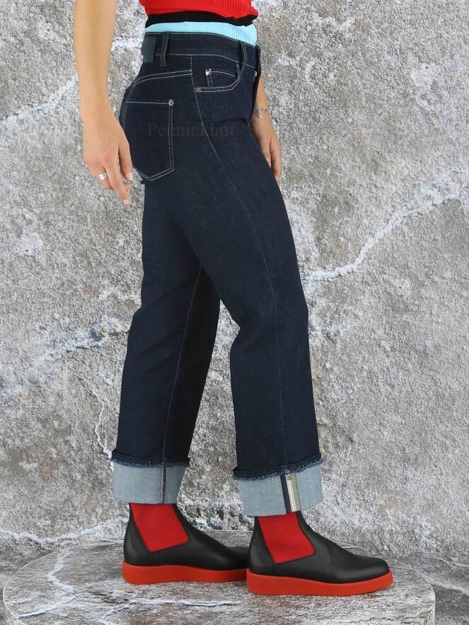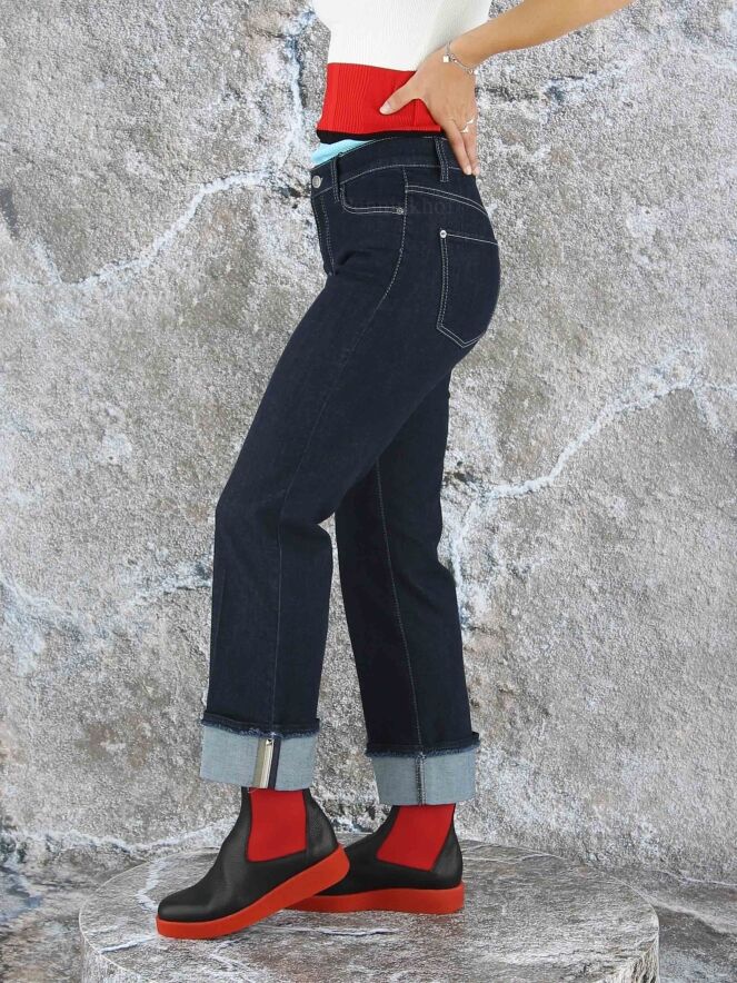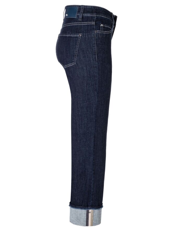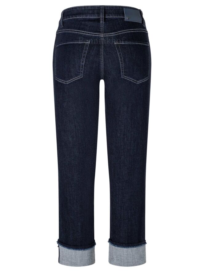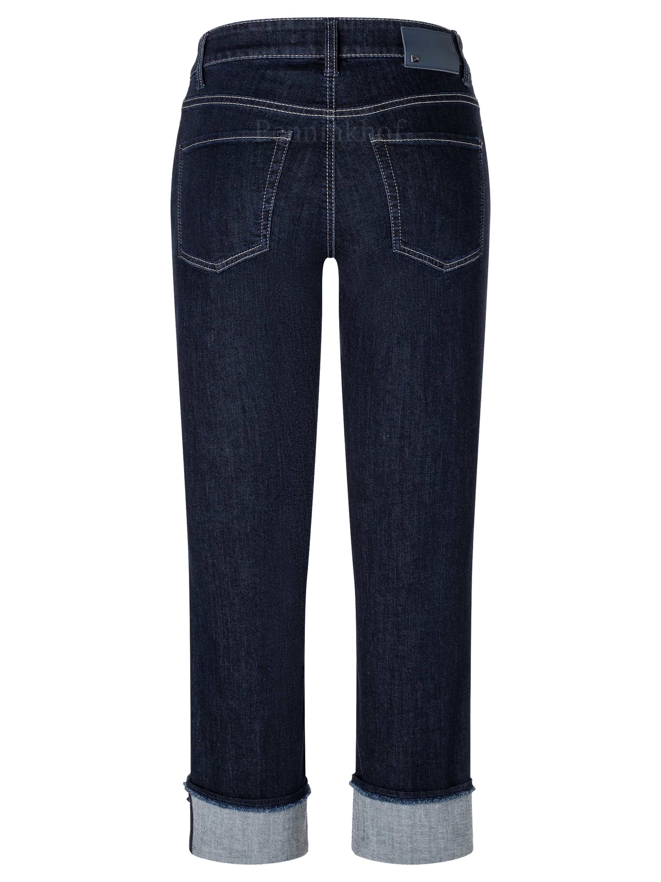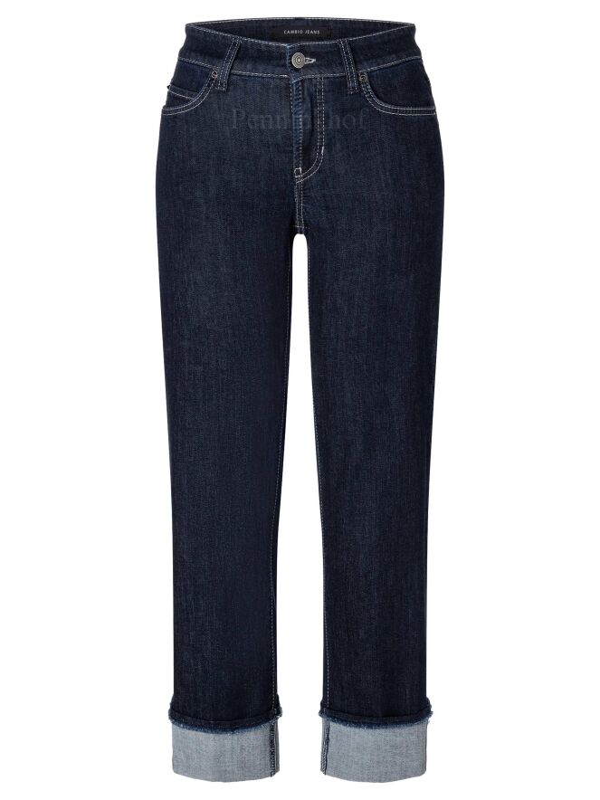 Eine Jeans der Designermarke Cambio in dunkler Waschung. Eine mittige Bundfalte akzentuiert die Hosenbeine. Die Jeans kommt als 5-Pocket-Modell und kann bei 30 Grad gewaschen werden.