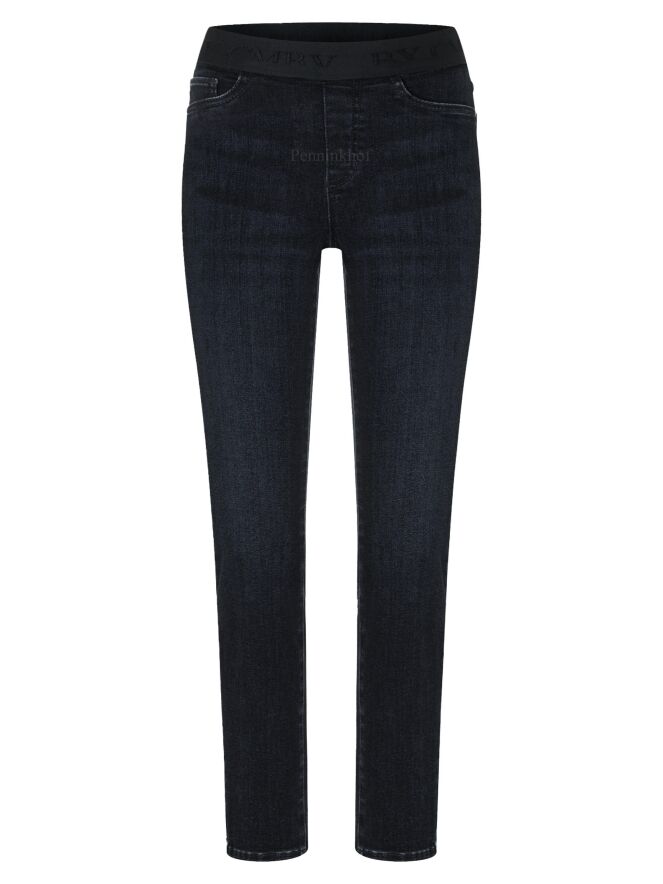 Jeans von Cambio in Anthrazit. Der Bund ist mit einem Gummizug versehen, durch den ein schwarzer Metallfaden gewebt ist. Die Jeans ist ein 5-Pocket-Modell und kann bei 30 Grad gewaschen werden.