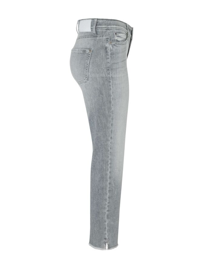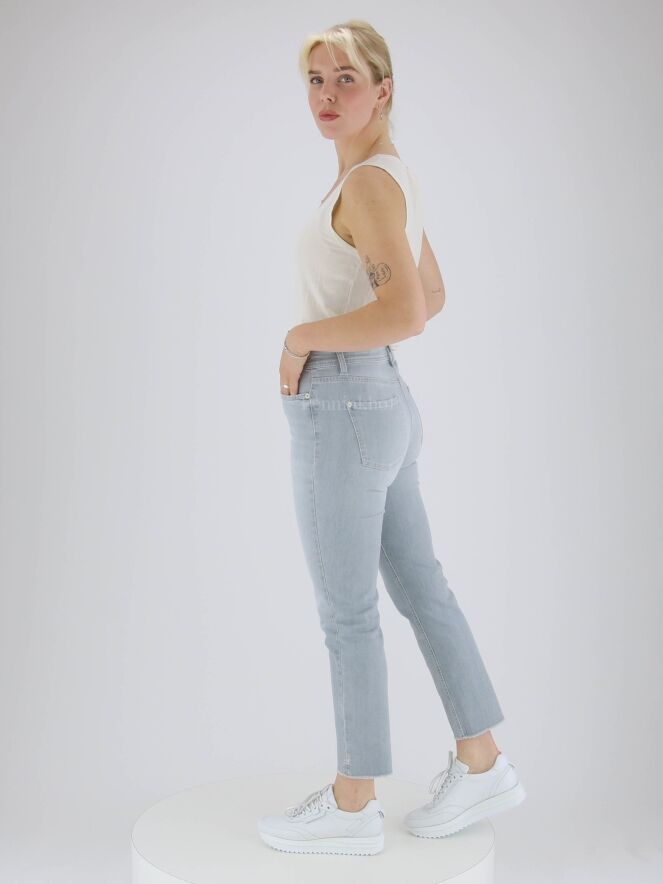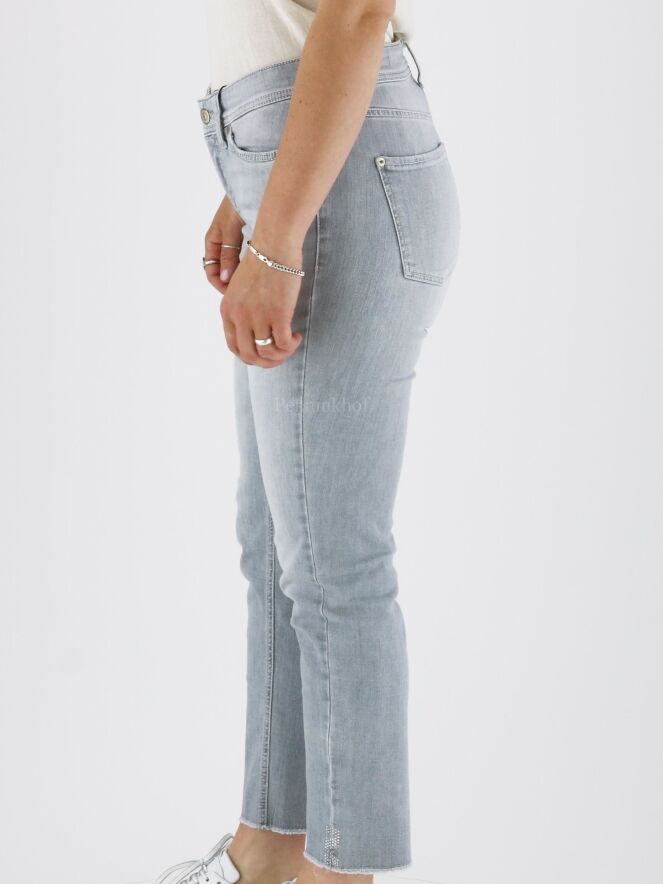 Eine hellgraue Jeans der Designermarke Cambio. Die Jeans kommt als 5-Pocket-Modell und kann bei 30 Grad gewaschen werden. An den Seiten der Hosenbeine wurden Swarovski-Straßsteinchen eingearbeitet.