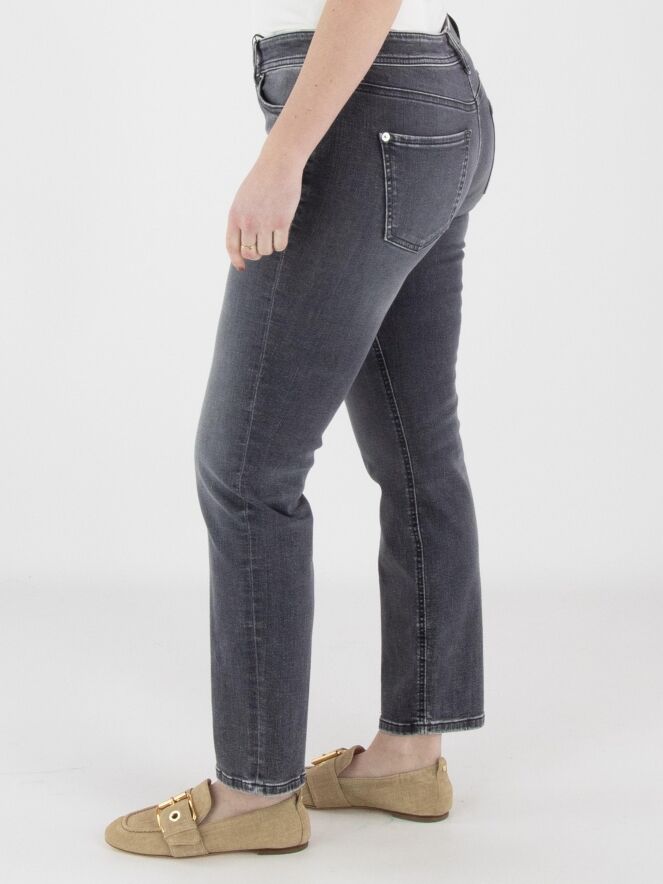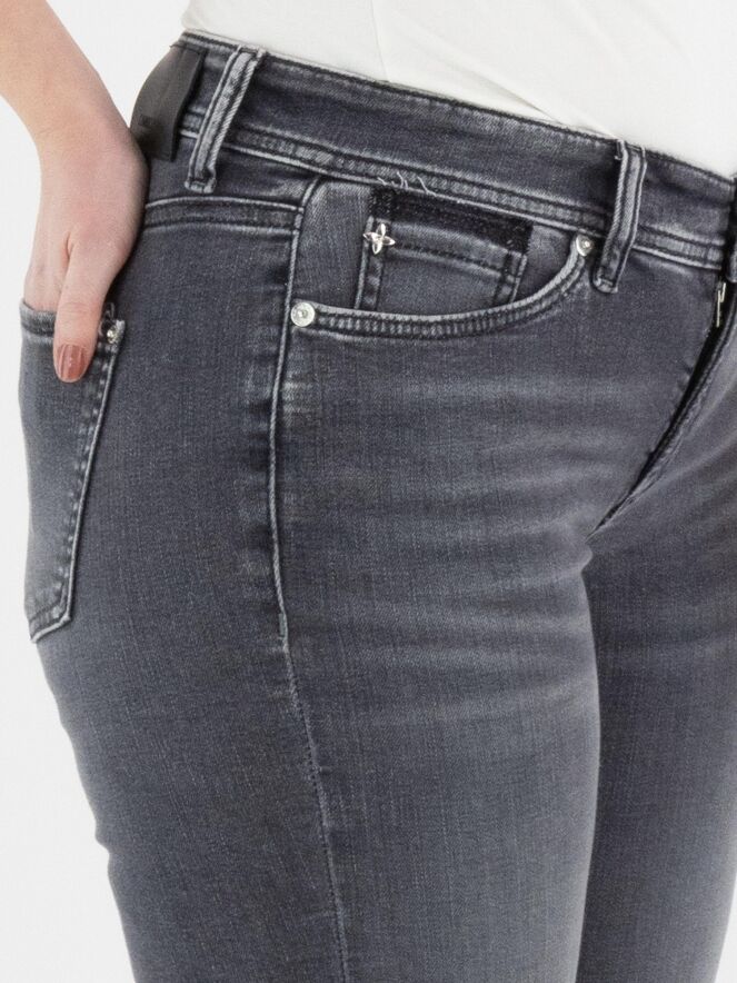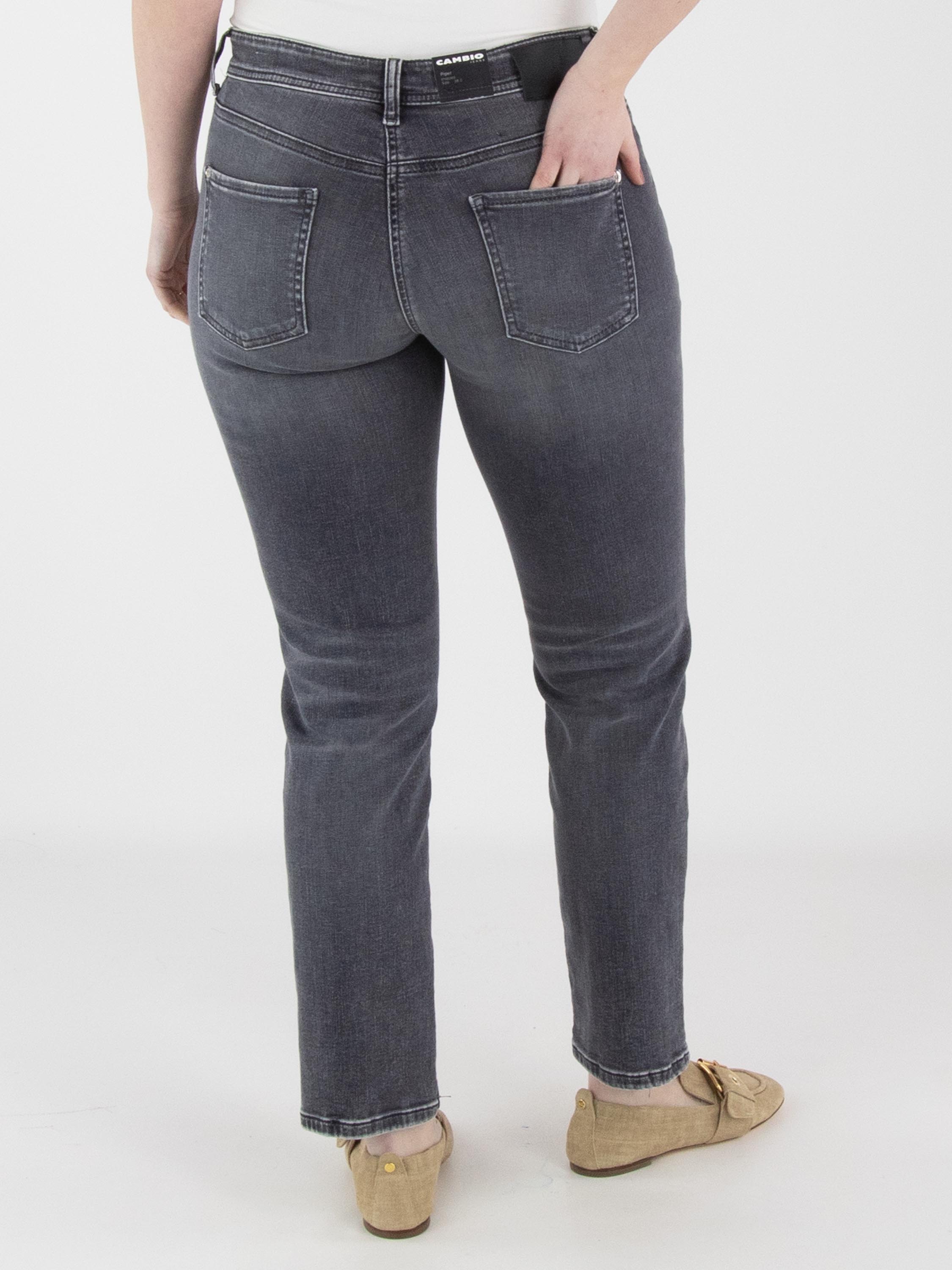 Eine Used-Jeans von Cambio in Dunkelgrau. Die Jeans ist im klassischen 5-Pocket-Stil gearbeitet und kann bei 30 Grad gewaschen werden.