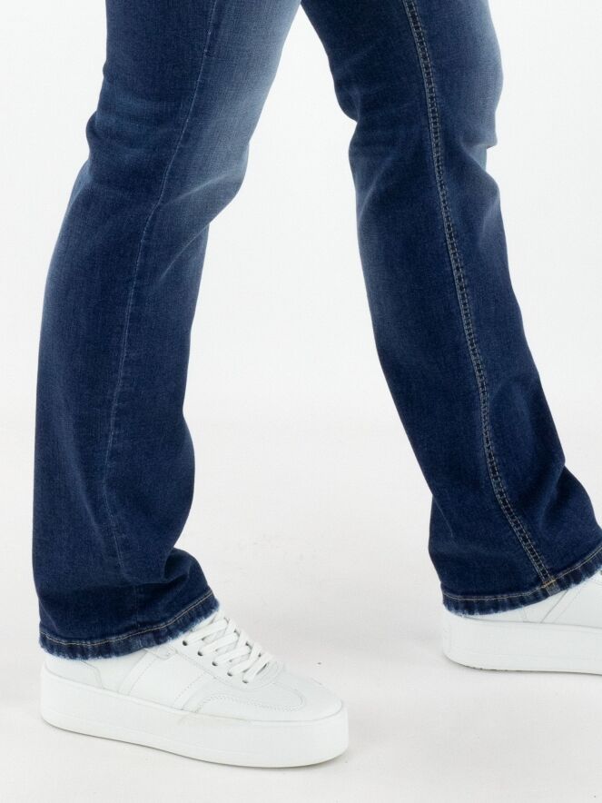 Eine Used-Stonewashed-Jeans von Cambio in klassischem Denimblau. Die Jeans ist im 5-Pocket-Stil gearbeitet und die Säume an den Hosenbeinen sind fein ausgefranst, was dem Modell eine moderne, lässige Note verleiht. Diese Jeans kann bei 30 Grad gewaschen werden.