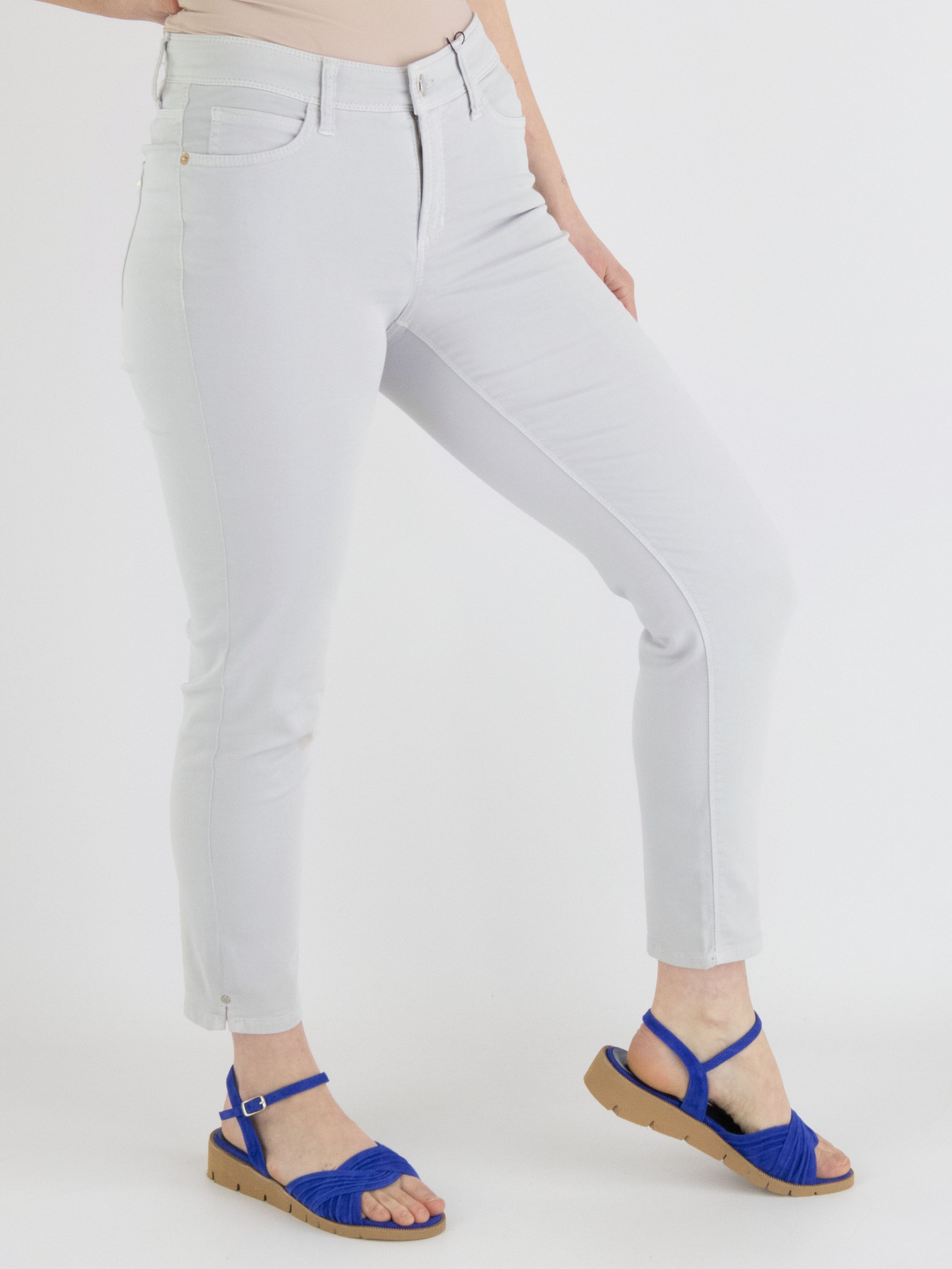 Eine kurze Jeans von Cambio in Hellgrau. Am unteren Ende der Beine befindet sich ein kurzer Schlitz an den Seiten mit einem kleinen Nieten. Die Jeans ist im 5-Taschen-Modell und kann bei 30 Grad gewaschen werden.