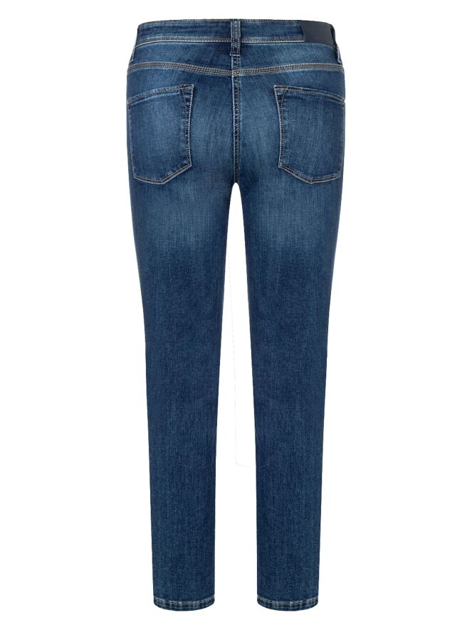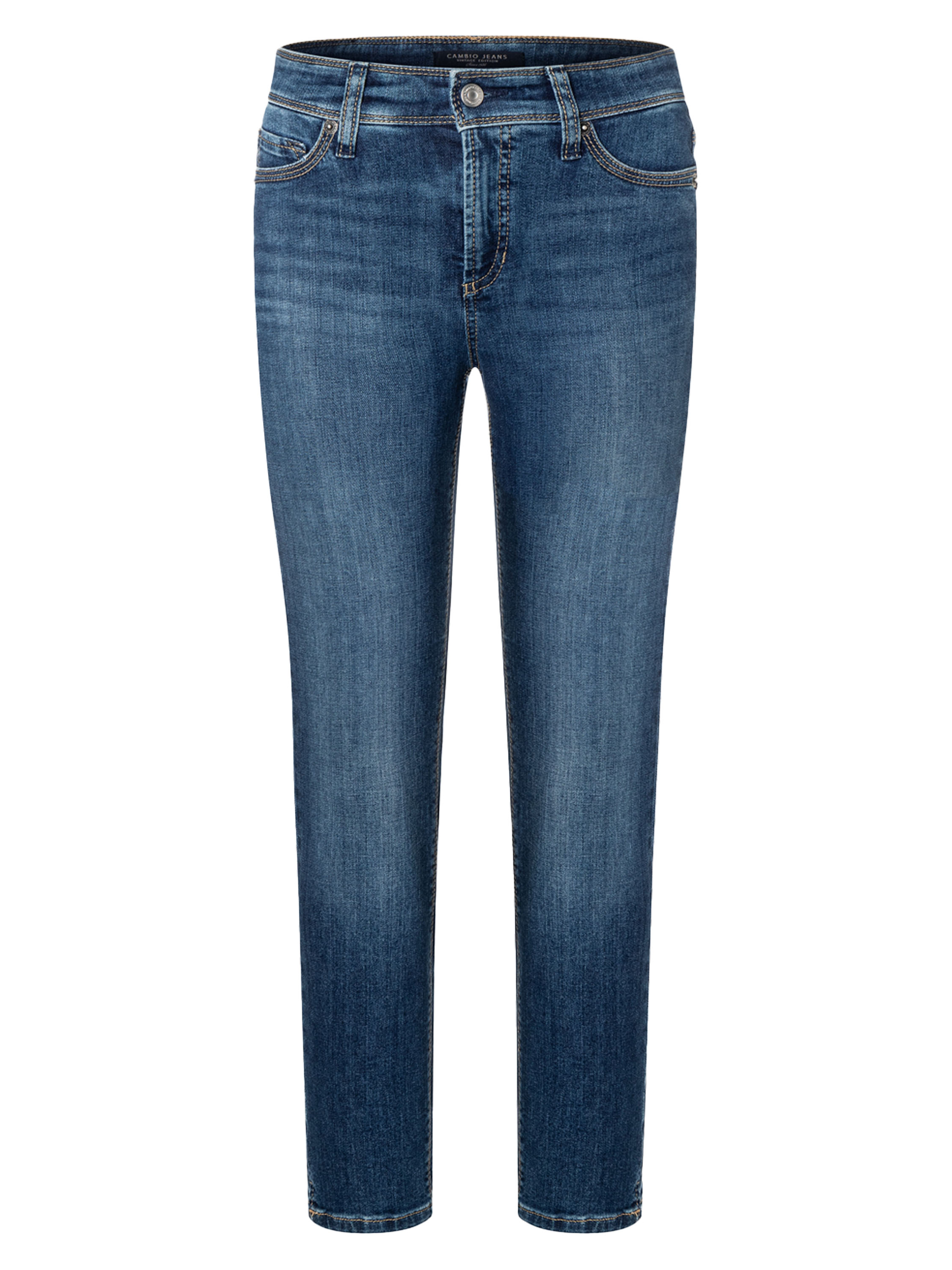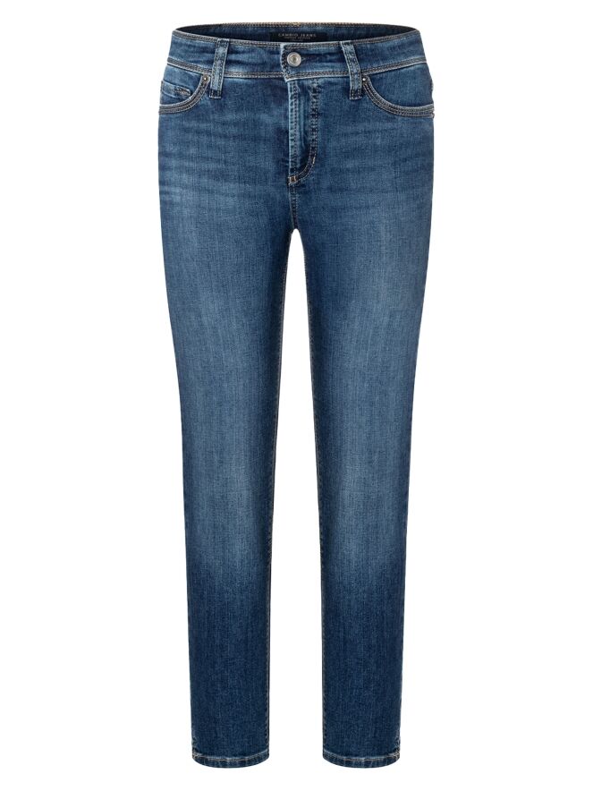 Eine Jeans von Cambio in einer klassischen Denimfarbe. Die Jeans ist im 5-Pocket-Stil gearbeitet. Am Außenbeinende befindet sich ein kleiner Schlitz. Diese Jeans kann bei 30 Grad gewaschen werden.