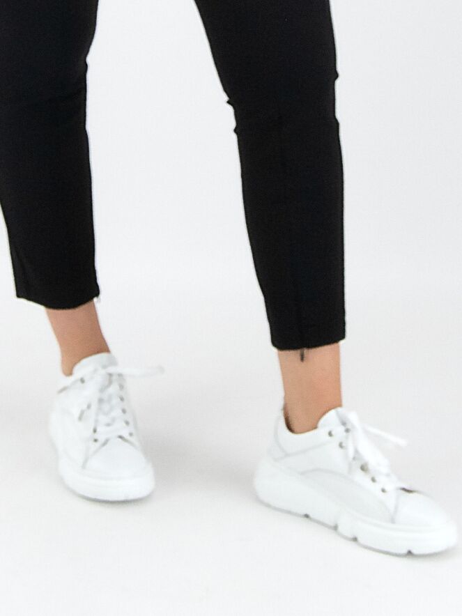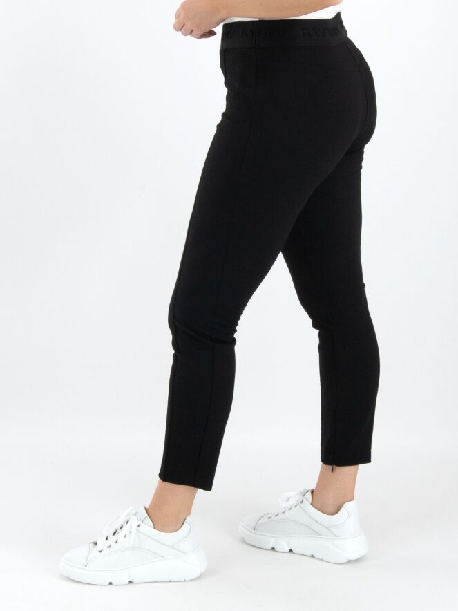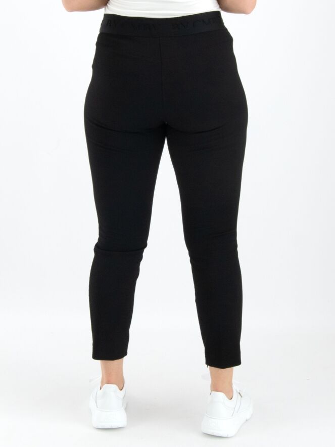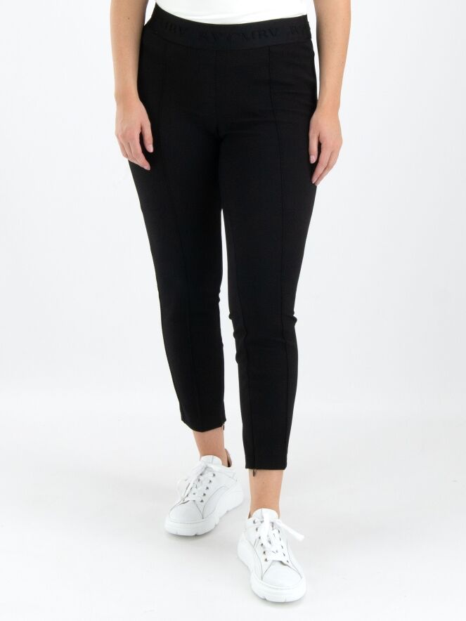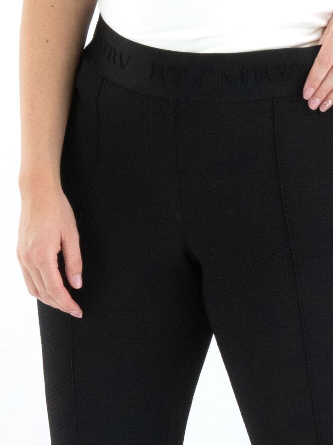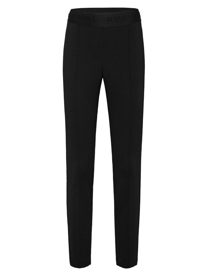 Eine Hose von Cambio in Schwarz. Der Stoff weist eine feine Zickzack-Reliefstruktur auf. Am Bund ist ein elastisches Band. In der Mitte der Beine befindet sich eine umgekehrte Naht. Am unteren Ende der Beine befindet sich an den Seiten ein kleiner Reißverschluss. Diese Hose kann von Hand gewaschen werden.