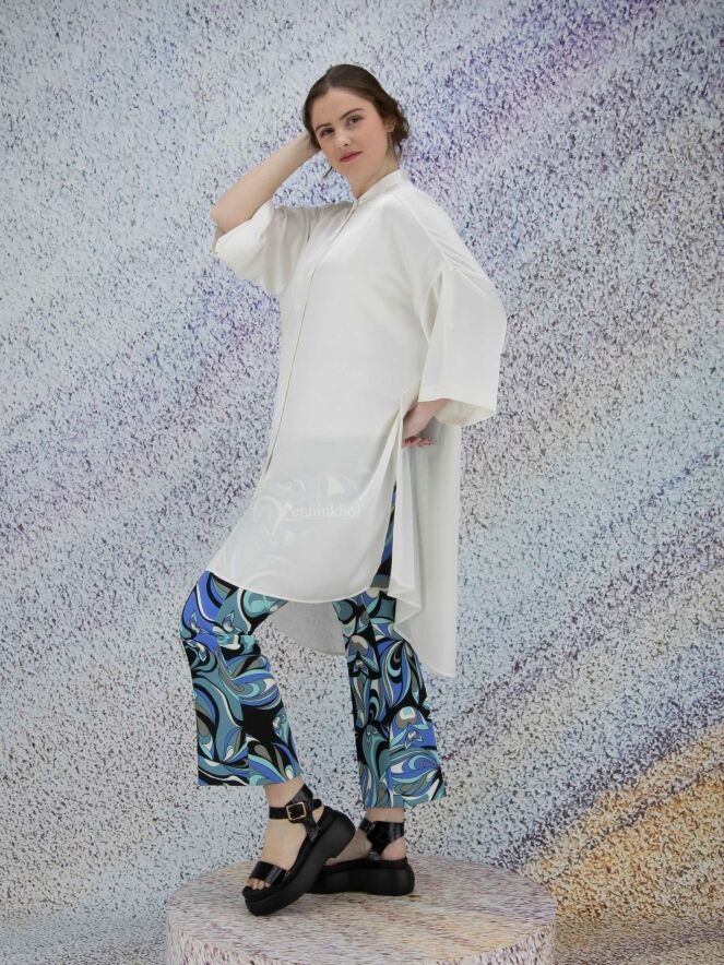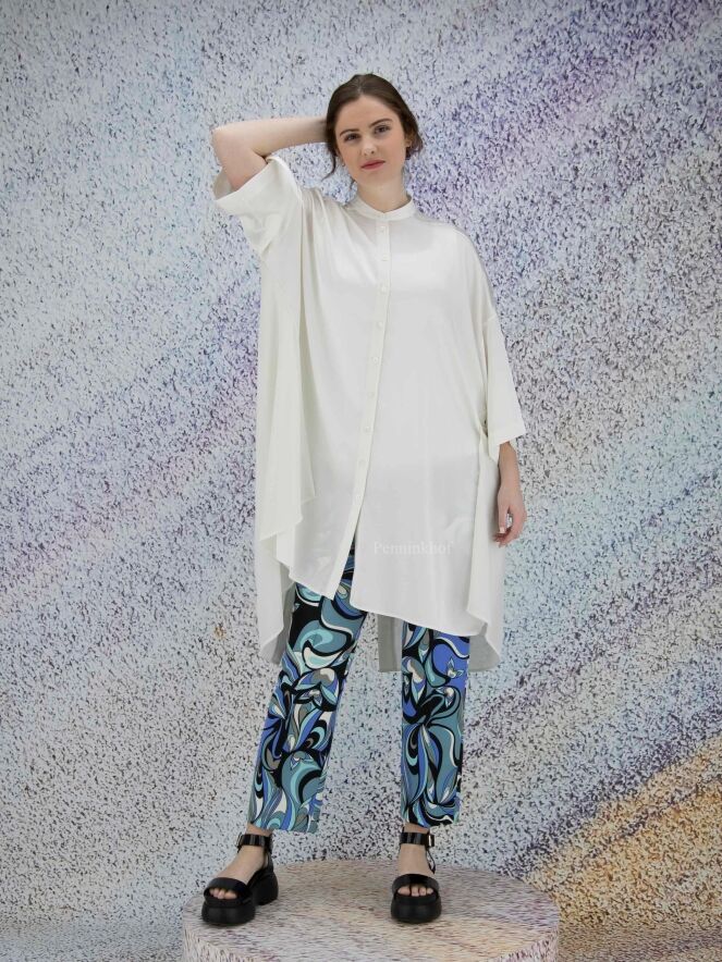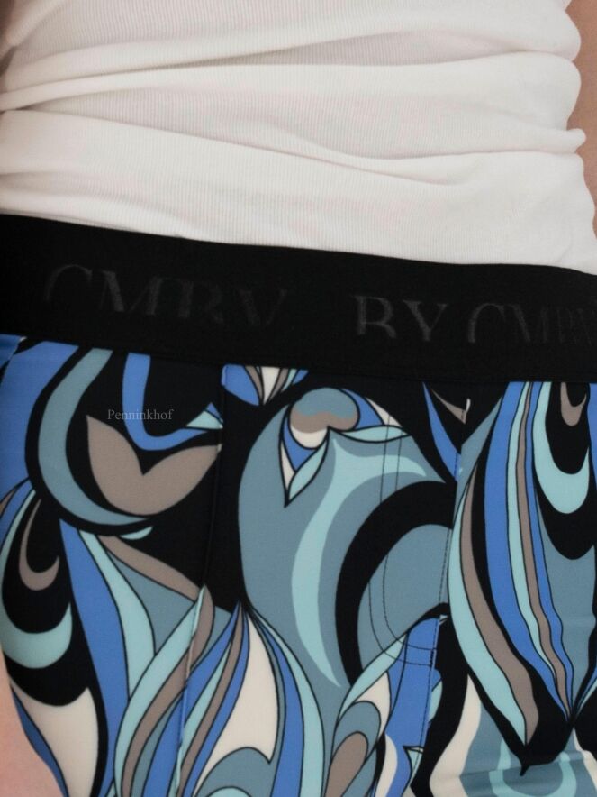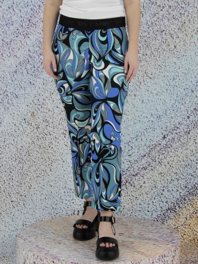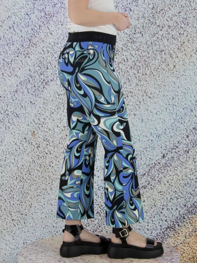 Eine Hose der Designermarke Cambio mit Pop-Art-Print in Schwarz, Cremeweiß und verschiedenen Blautönen. An der Taille befindet sich ein schwarzer dehnbarer Bund. Eine Steppnaht akzentuiert die Mitte der Hosenbeine. Diese Hose kann bei 30 Grad gewaschen werden.
