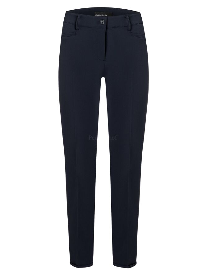 Hose der Designermarke Cambio in der Farbe Marineblau. Den Rand der vorderen Einstecktaschen verziert eine schmale Borte aus Lederimitat. Am Saum der Hosenbeine befindet sich ein 2 cm schmaler Umschlag. Diese Hose kann auf 30 Grad in der Waschmaschine gewaschen werden.