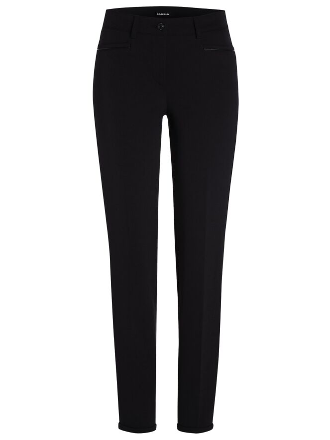 Schwarze Hose der Designermarke Cambio. Den Rand der vorderen Einstecktaschen verziert eine schmale Borte aus Lederimitat. Am Saum der Hosenbeine befindet sich ein 2 cm schmaler Umschlag. Diese Hose kann auf 30 Grad in der Waschmaschine gewaschen werden.