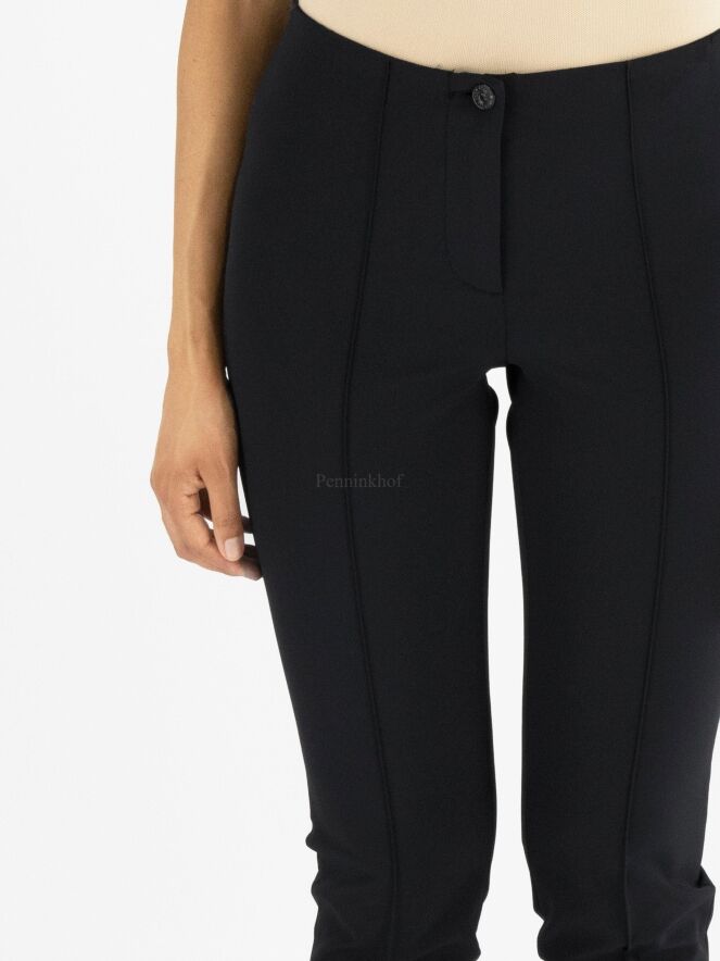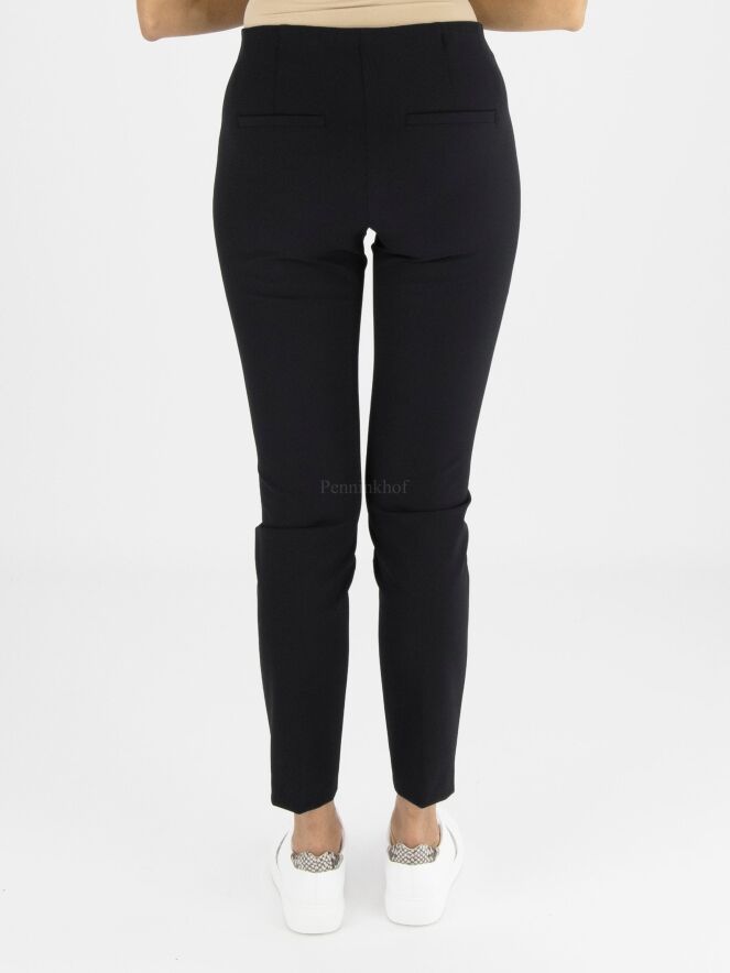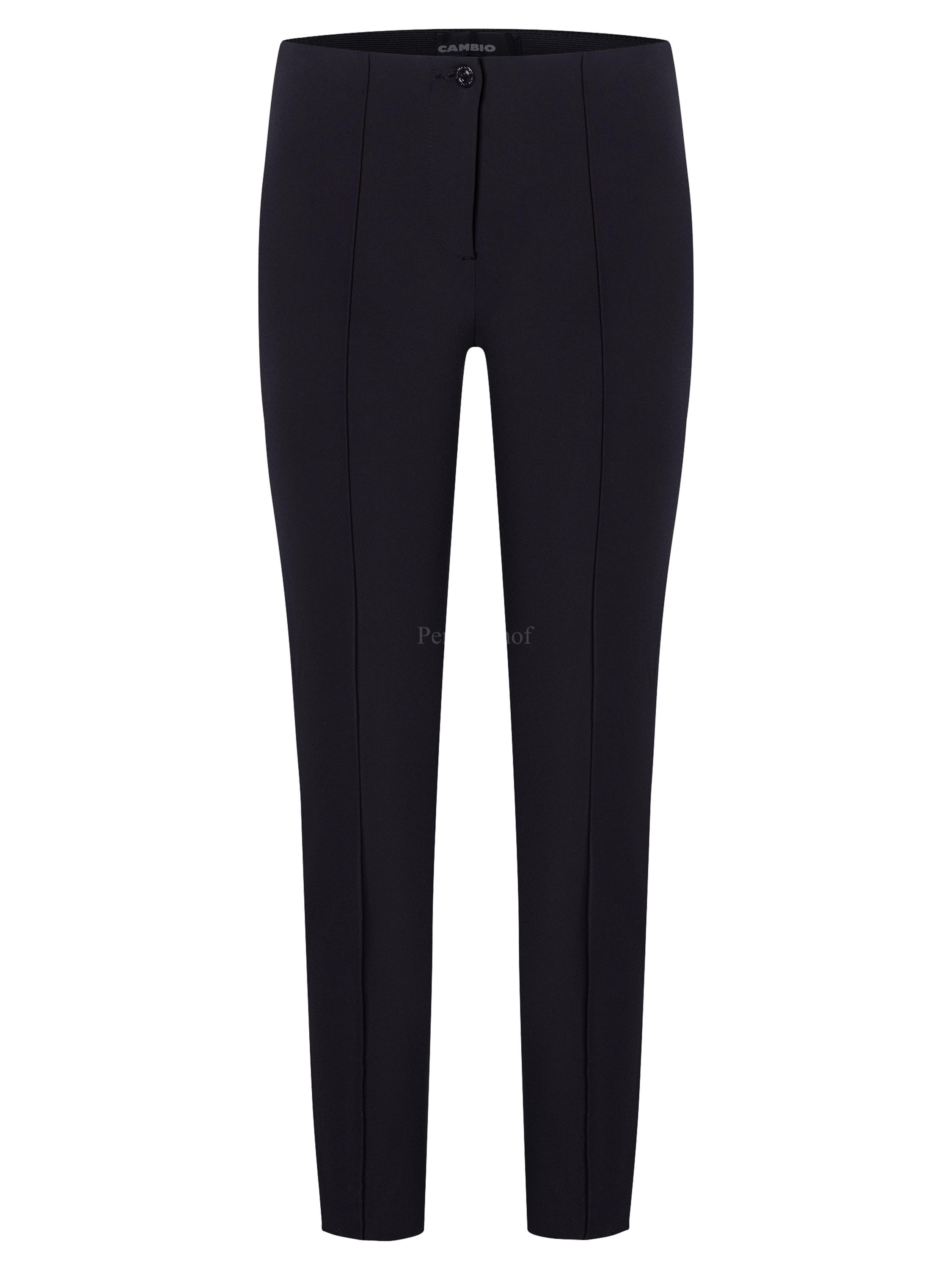 Eine marineblaue Hose der Designermarke Cambio. Der Bund ist dehnbar. Eine mittige Steppnaht akzentuiert die Hosenbeine. Diese Hose kann von Hand gewaschen werden.