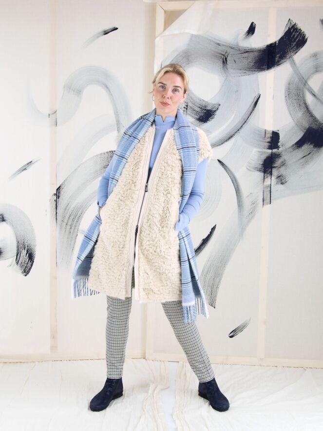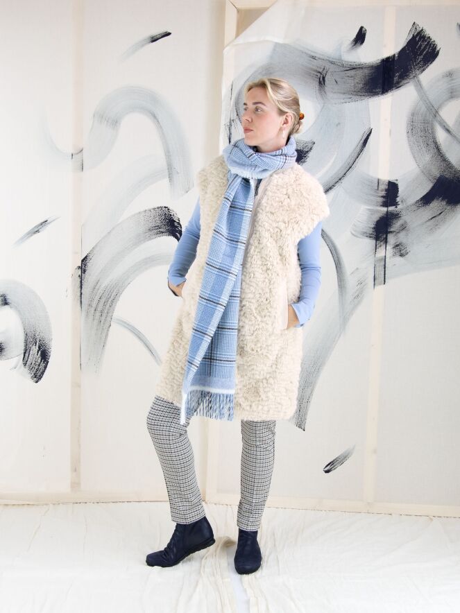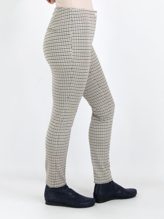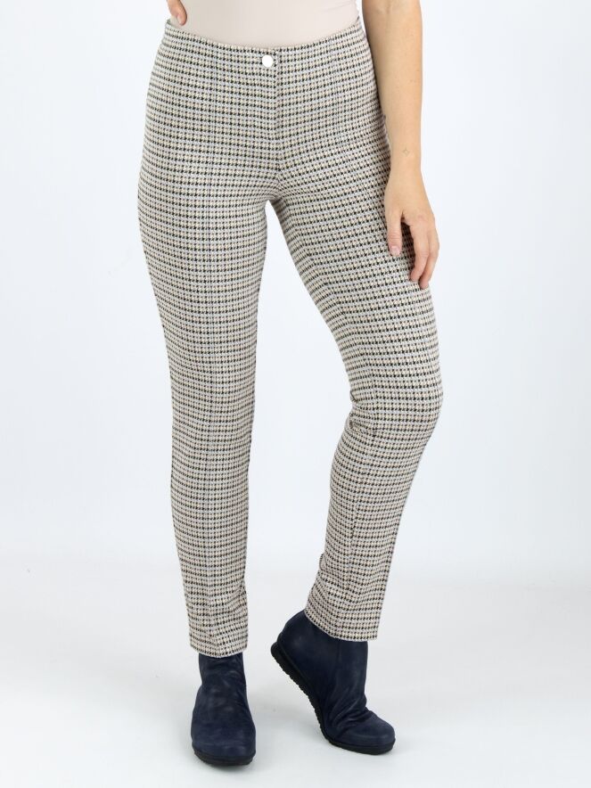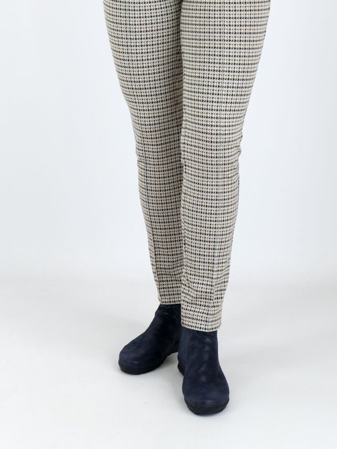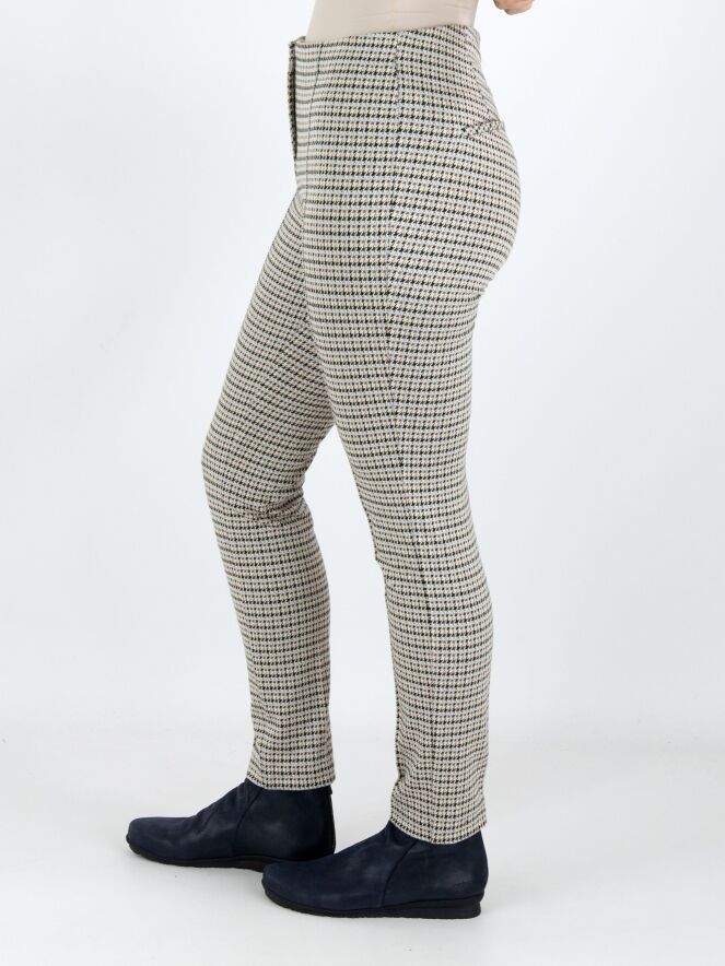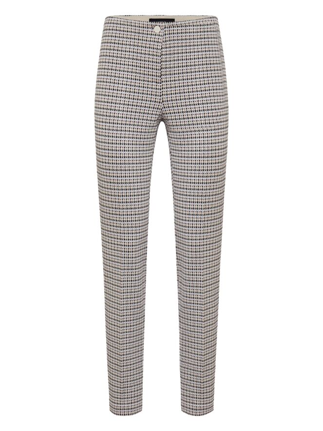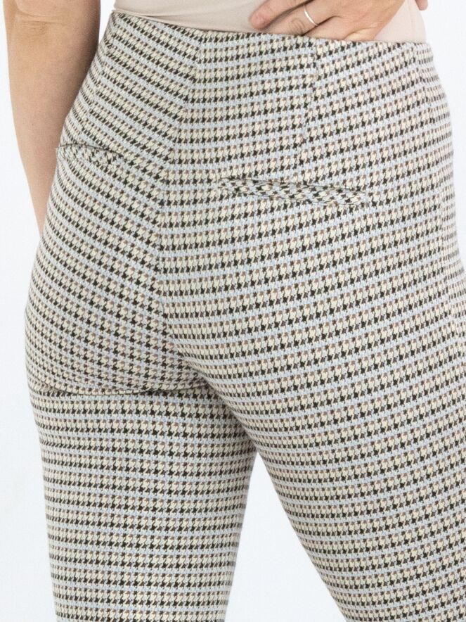 Eine Hose von Cambio mit einem pied-de-coque Muster in den Farben Eisblau, Cognac und Schwarz auf beigem Hintergrund. In der Taille befindet sich ein Gummiband. In der Mitte der Hosenbeine befindet sich eine umgekehrte Naht. Diese Hose kann von Hand gewaschen werden.
