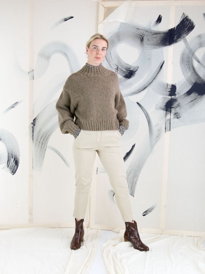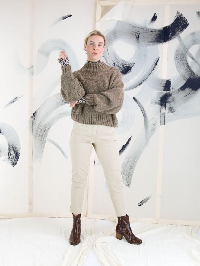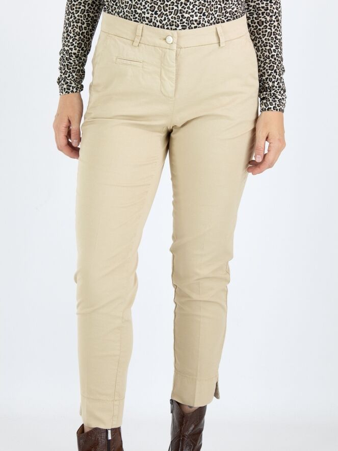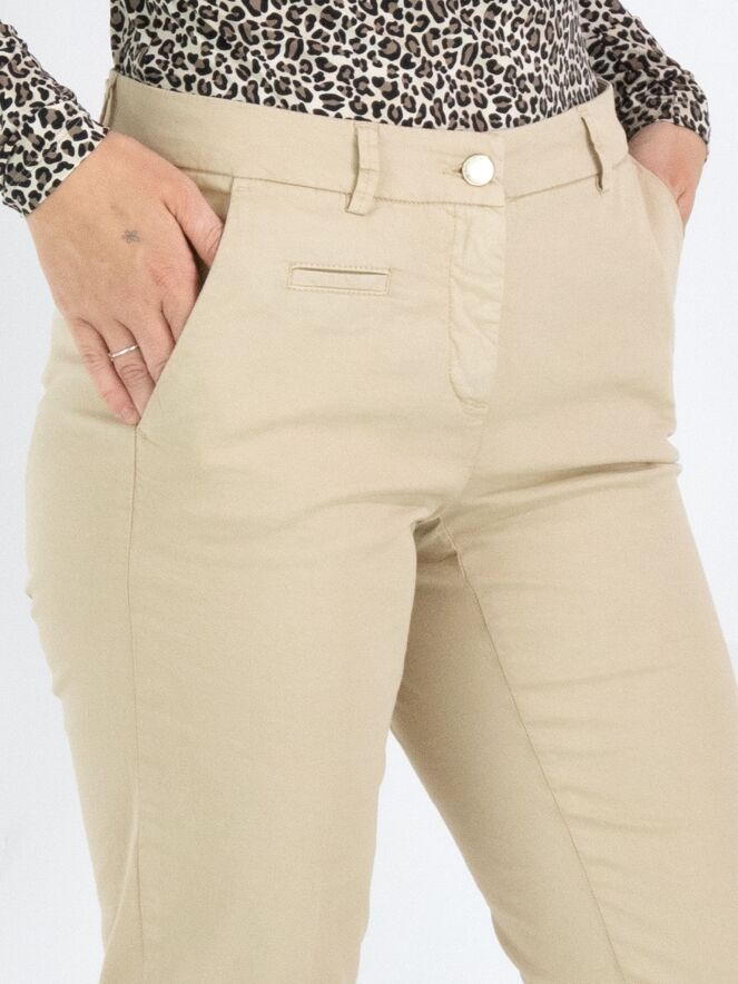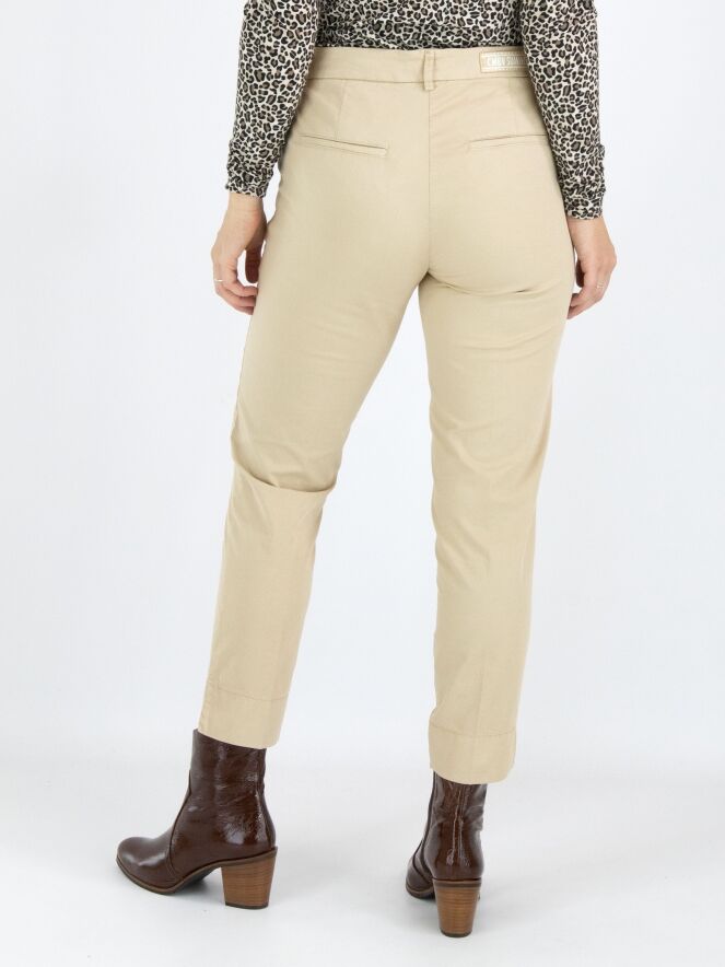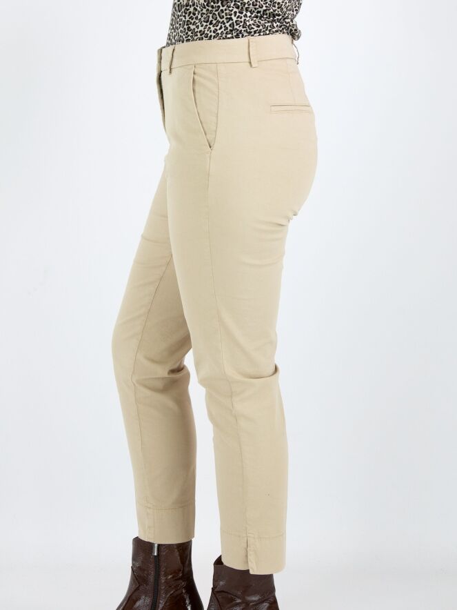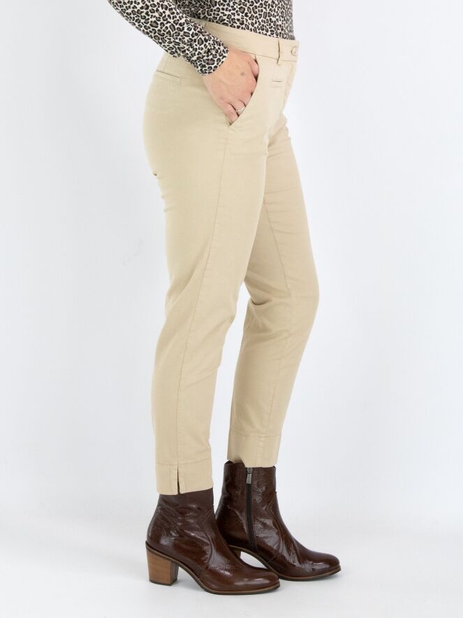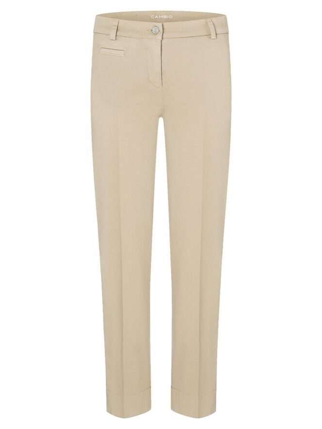 Eine Hose von Cambio in Sandfarbe. Die Hose verfügt über Eingrifftaschen und eine gebügelte Falte in der Mitte der Beine. Am unteren Rand befindet sich ein breiter Bund mit einem kleinen Schlitz an der Seite. Diese Hose kann bei 30 Grad gewaschen werden.