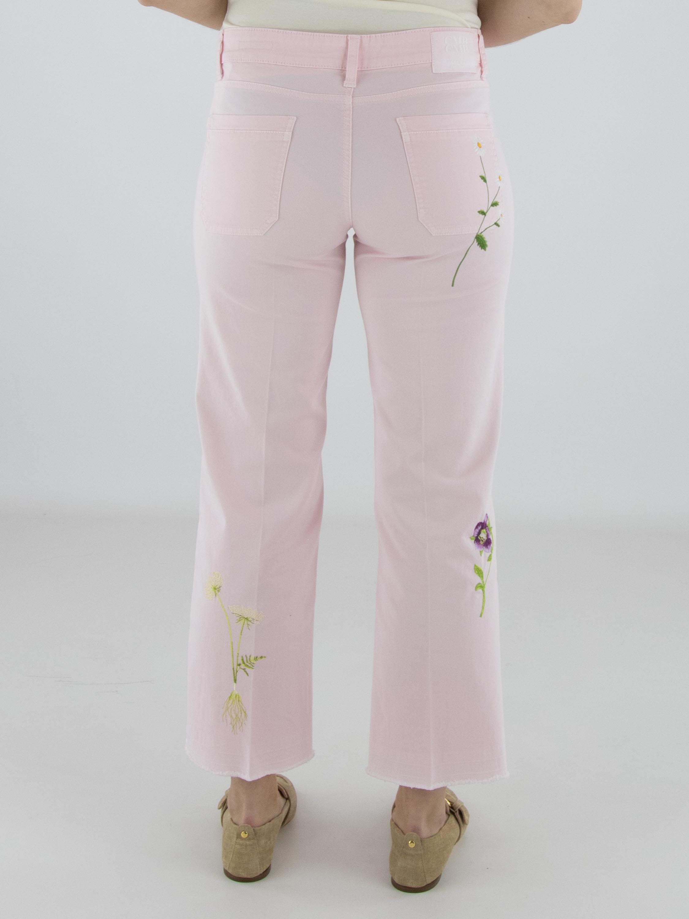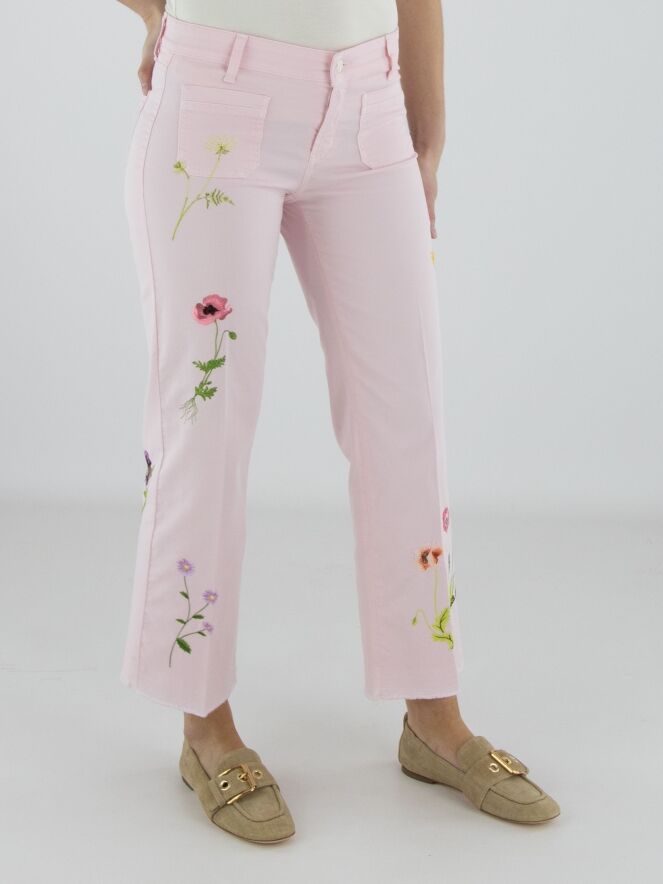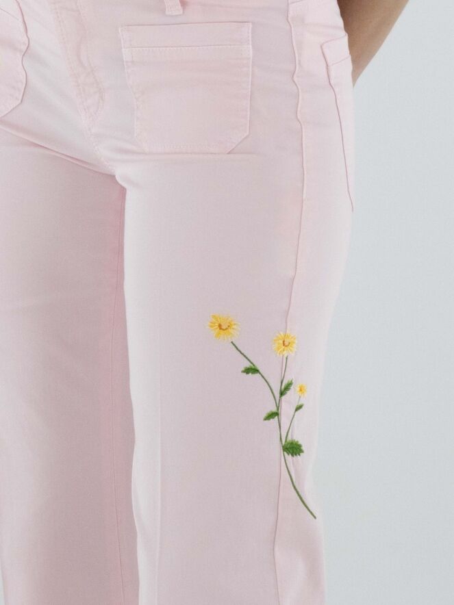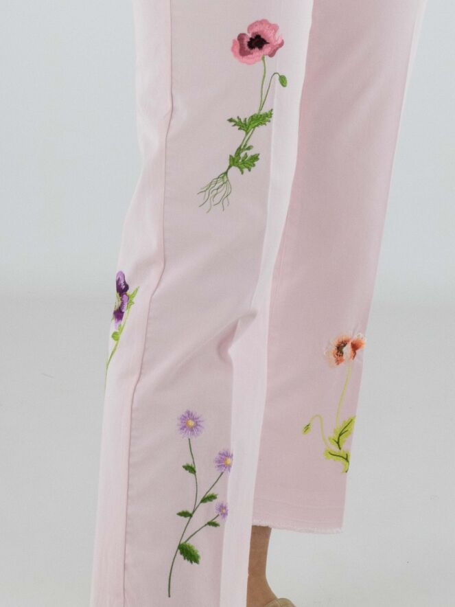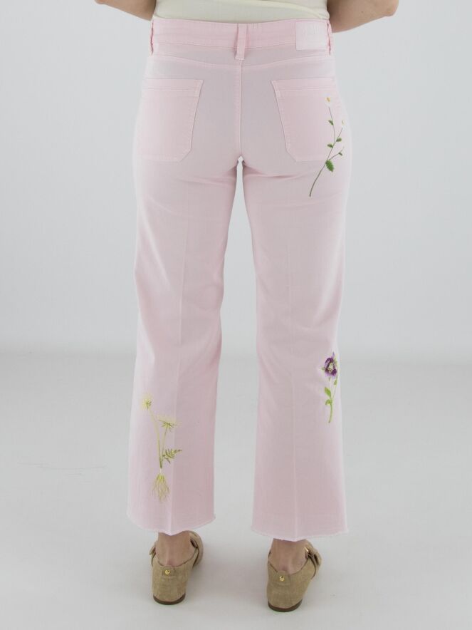 Jeans von Cambio in einem zarten Pastellrosa. Vorderseitig, direkt unter dem Bund, sind zwei dekorative Taschen eingearbeitet, die dem Modell eine verspielte Note verleihen. Mehrere florale Stickereien auf den Hosenbeinen setzen feminine Akzente. Eine eingepresste Bügelfalte in der Beinmitte sorgt für eine elegante Ausstrahlung. Diese Hose kann bei 30 Grad gewaschen werden.