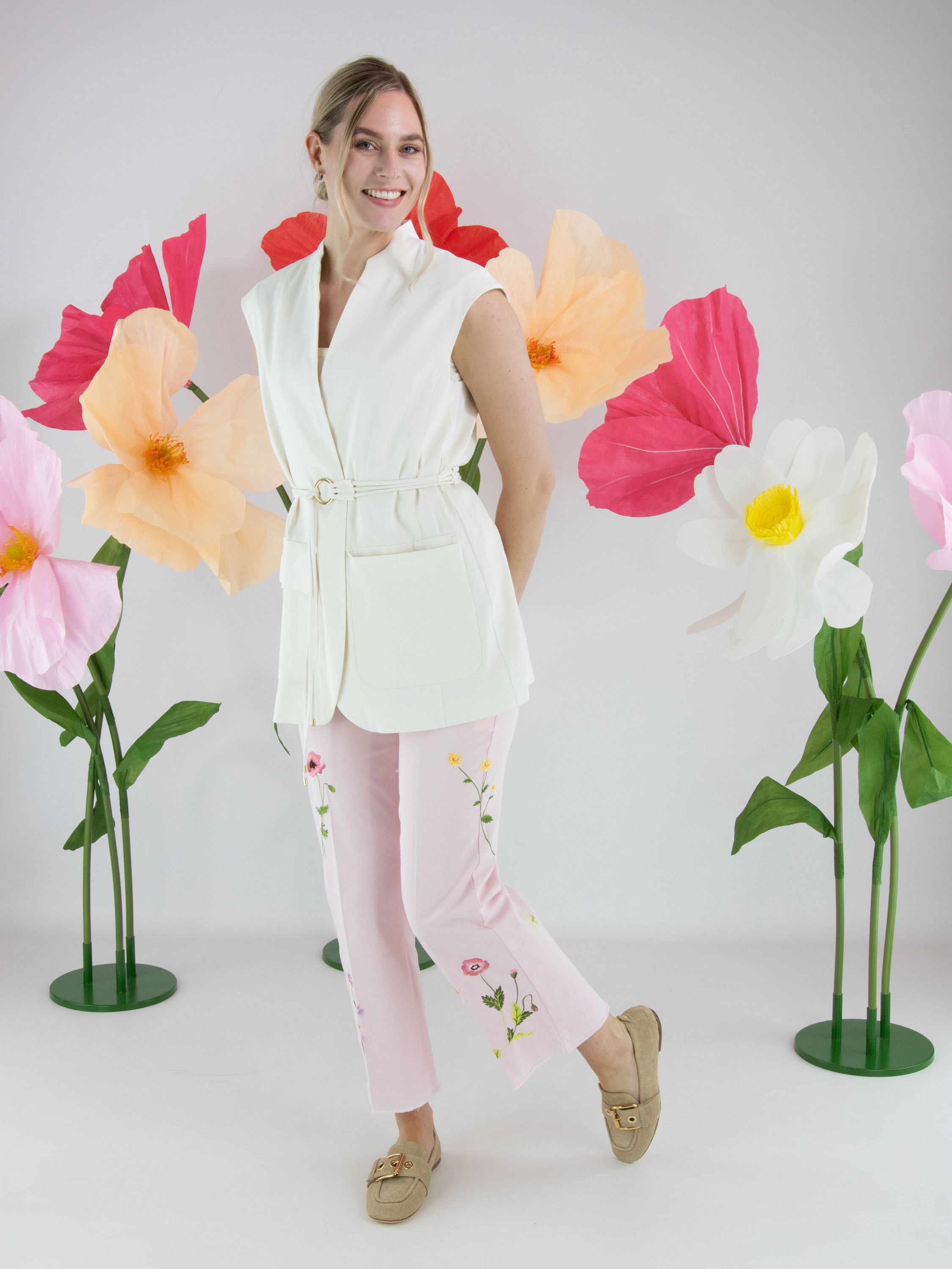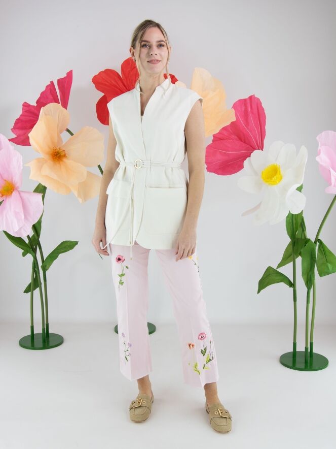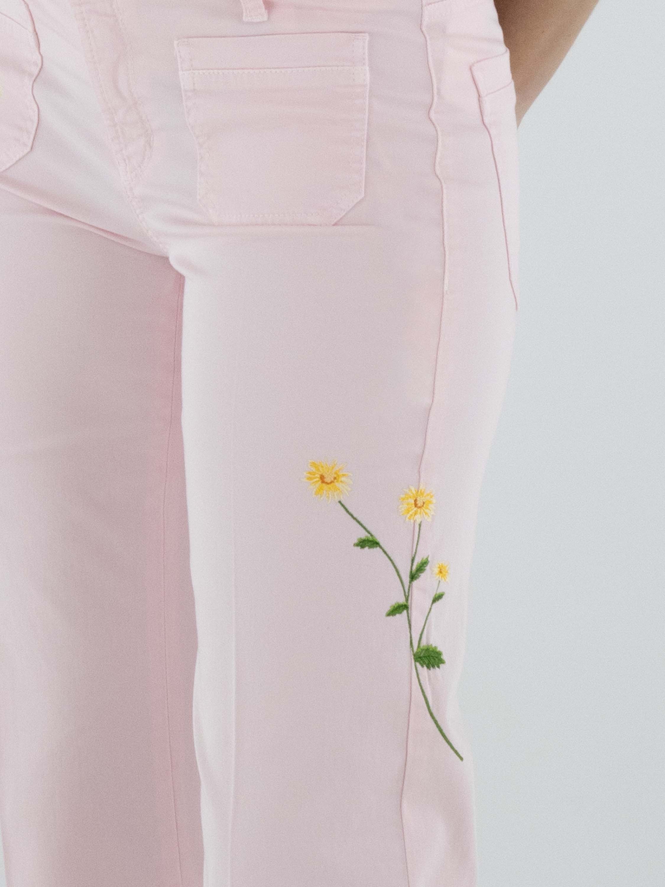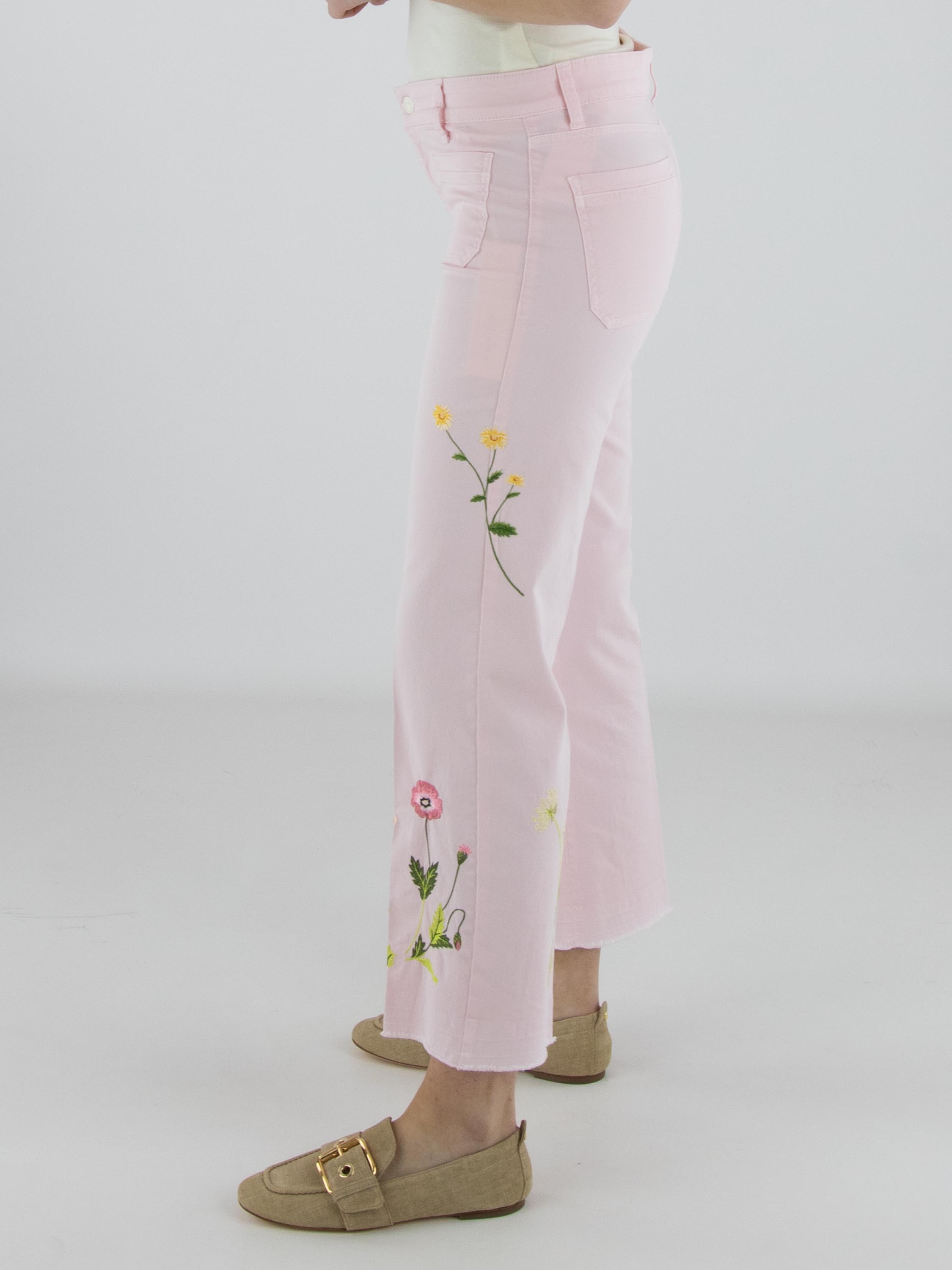 Jeans von Cambio in einem zarten Pastellrosa. Vorderseitig, direkt unter dem Bund, sind zwei dekorative Taschen eingearbeitet, die dem Modell eine verspielte Note verleihen. Mehrere florale Stickereien auf den Hosenbeinen setzen feminine Akzente. Eine eingepresste Bügelfalte in der Beinmitte sorgt für eine elegante Ausstrahlung. Diese Hose kann bei 30 Grad gewaschen werden.