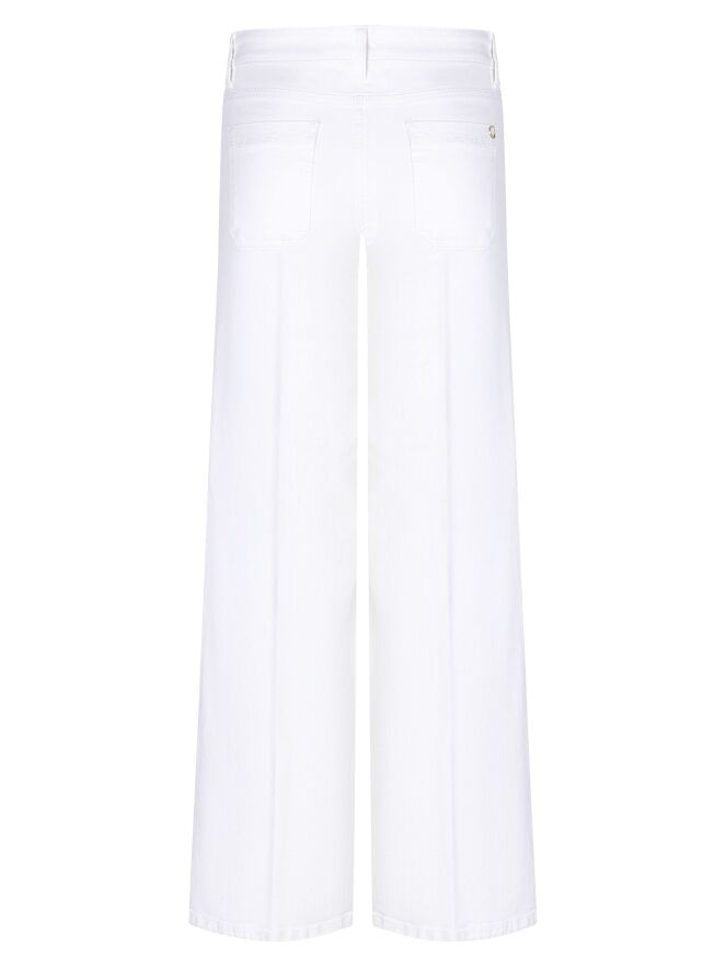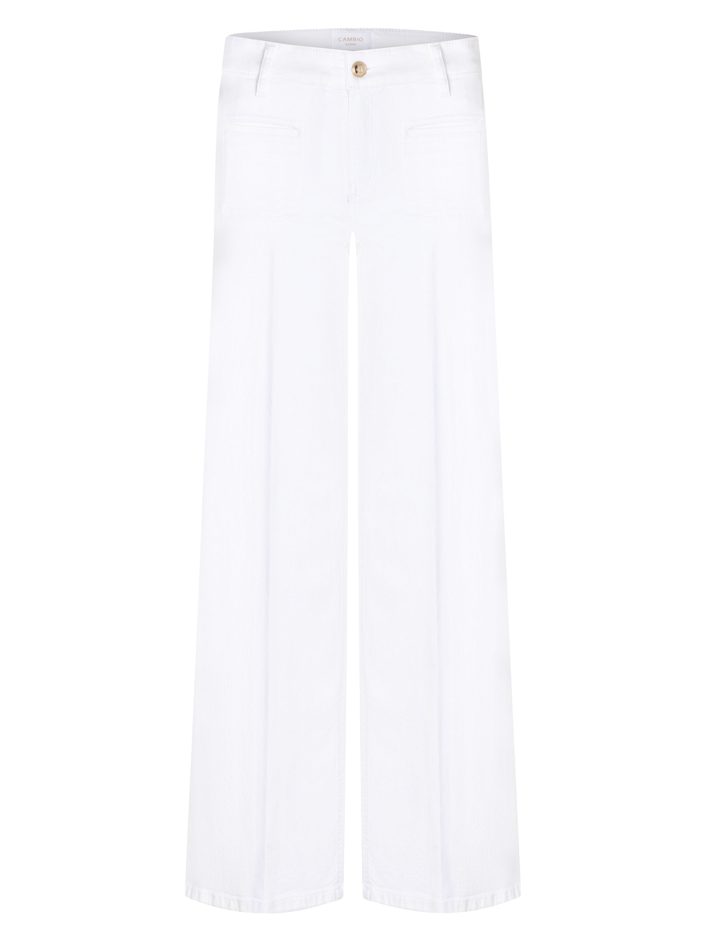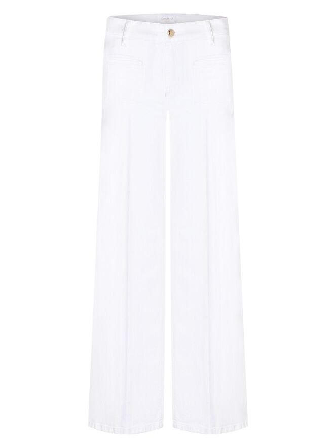 Eine Jeans von Cambio in Weiß. Die Jeans hat kleine Taschen an der Vorderseite und gerade geschnittene Hosenbeine. In der Mitte der Beine verläuft eine eingepresste Falte. Diese Jeans kann bei 30 Grad gewaschen werden.