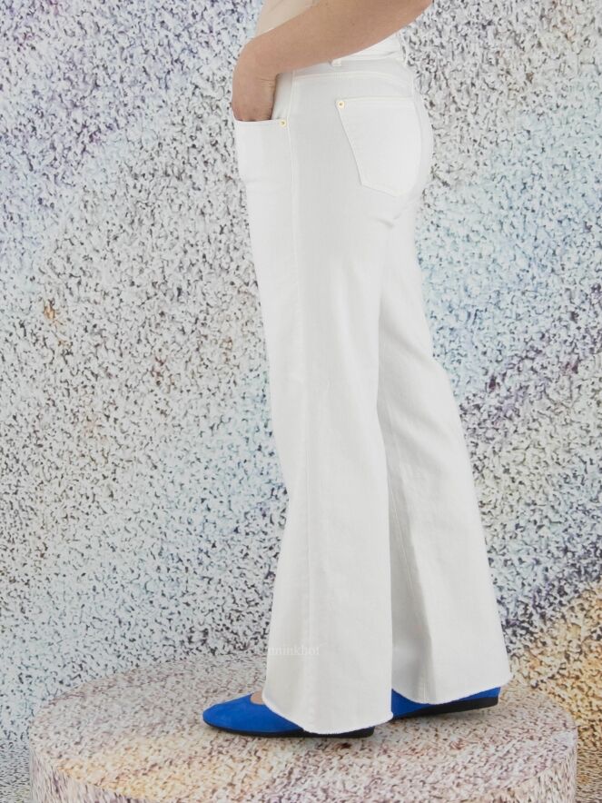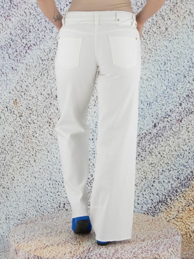 Eine weiße weite Jeans der Designermarke Cambio. Die Jeans kommt als 5-Pocket-Modell. Die untere Saumkante ist fein ausgefranst. Diese Jeans kann bei 30 Grad gewaschen werden.